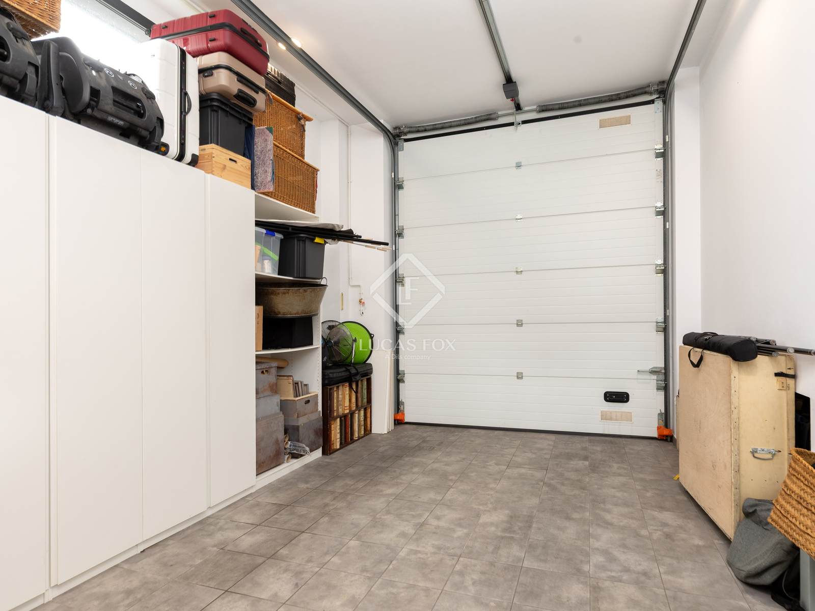 The spacious and bright open-plan layout of the ground floor features a fully equipped modern kitchen, dining area, and living room flooded with natural light and direct access to the garden, pool, and outdoor lounge. This floor also includes a full bathroom, a large garage with height suitable for a camper van, and a versatile double bedroom currently used as an office.