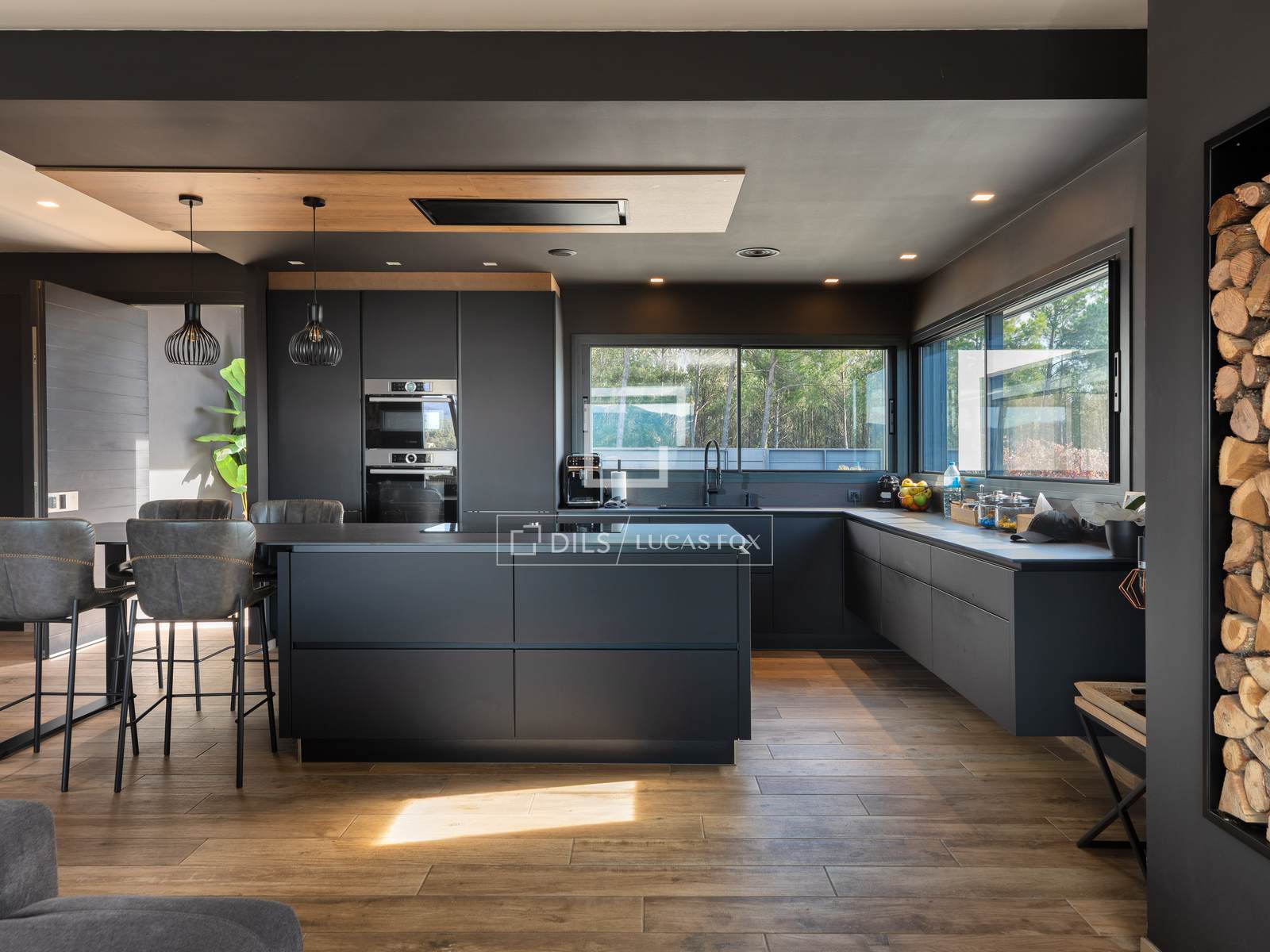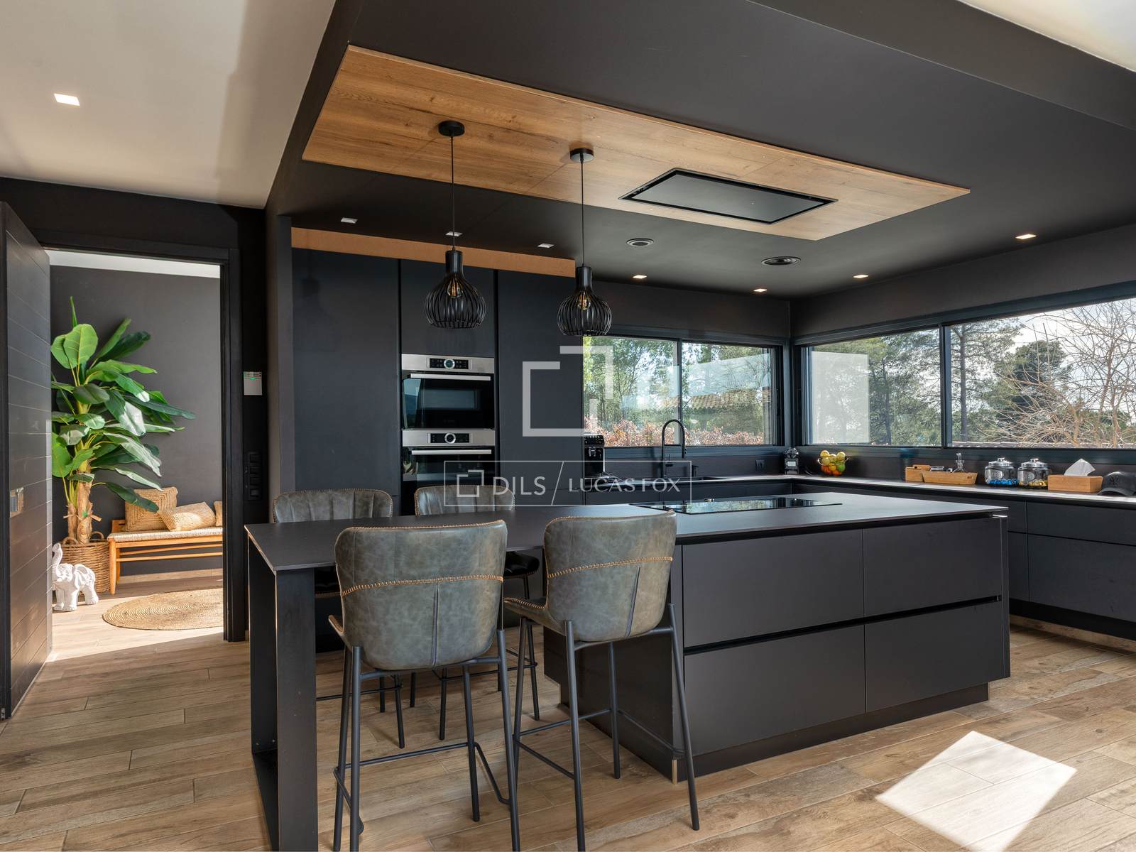Open-plan kitchen, dining, and living area with abundant natural light