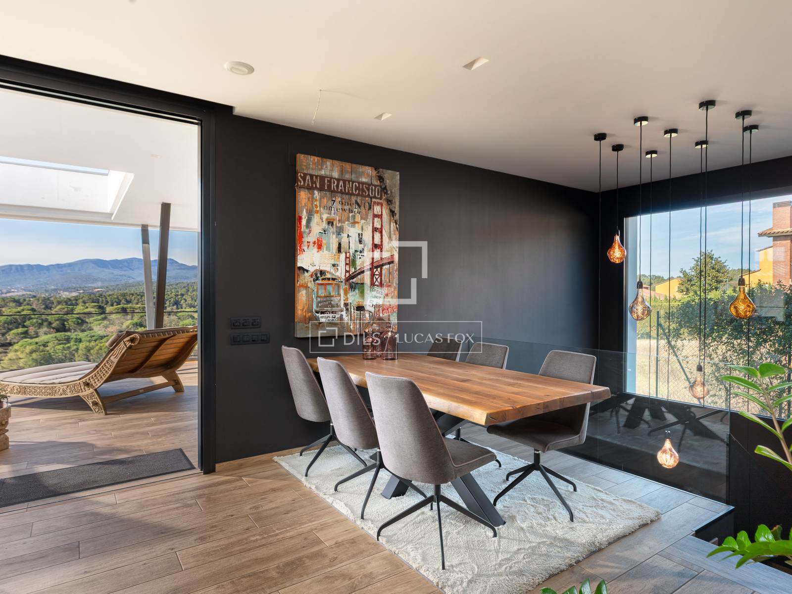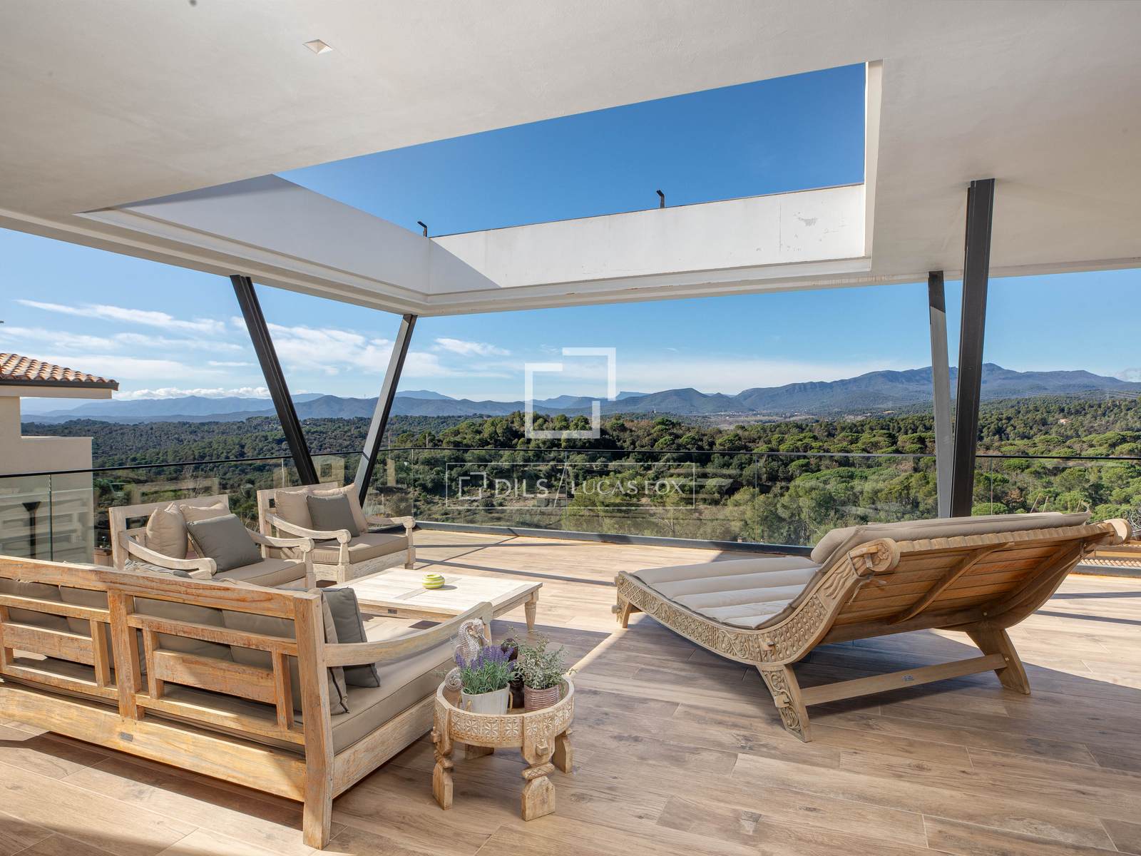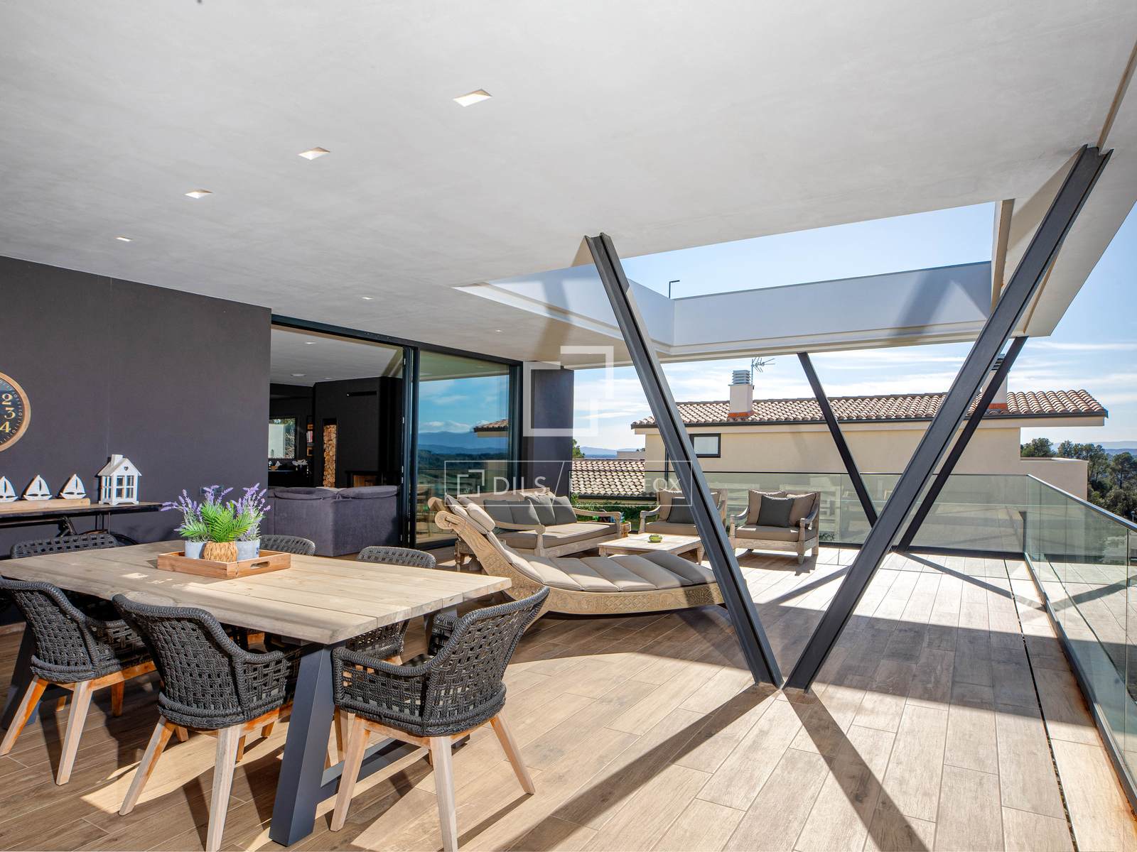 Large sliding glass doors opening to a generous terrace with panoramic mountain views
