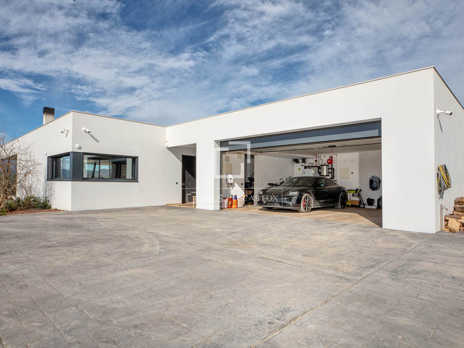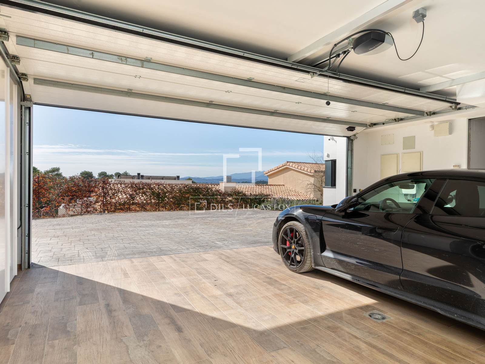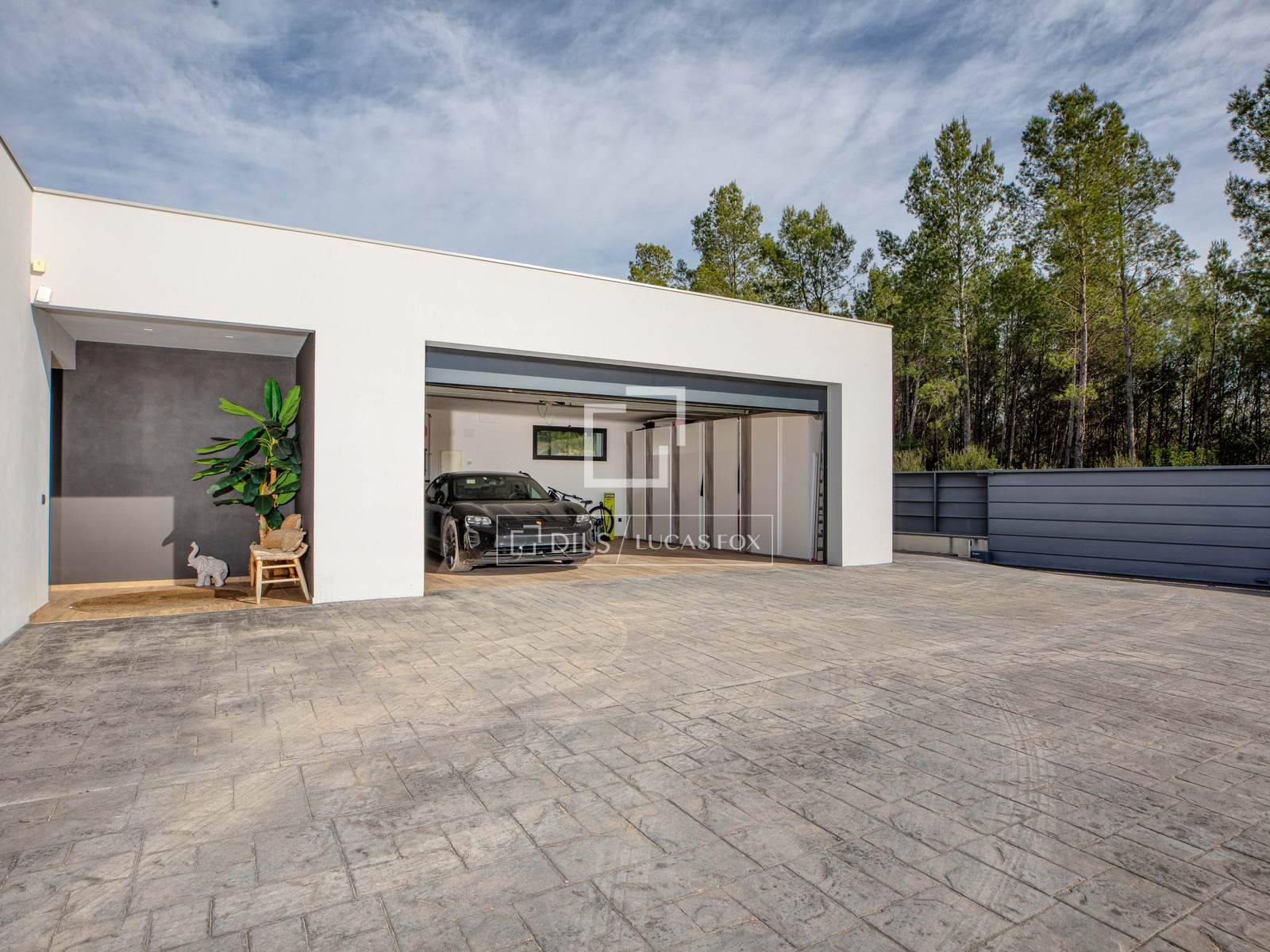 Closed garage for two cars, with electric vehicle charging point