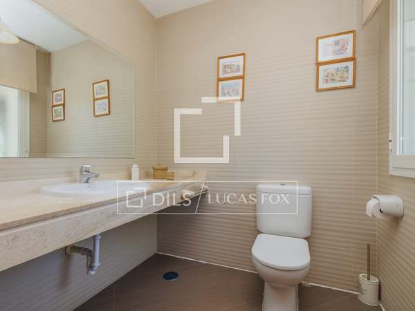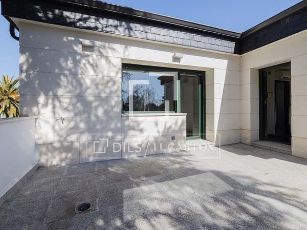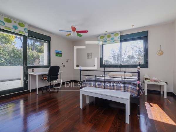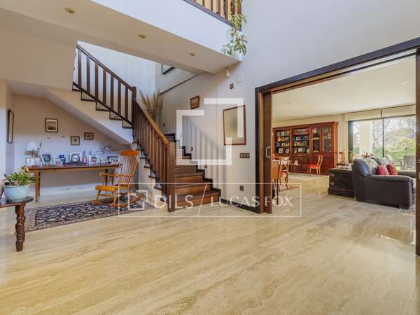 Once inside, from the stately lobby with double height ceilings, there is access on the right to the large living room, with lights on both facades, completely independent, with access to the garden and equipped with several seating areas and a fireplace. Next, the formal dining room is arranged, doubly connected, on one side with the other wing and with access to the back porch or summer dining room and on the other side, directly connected to the kitchen. This kitchen is large in size, has a practical pantry and office area ideal for family breakfasts. At the back of this wing, we find a comfortable independent study , two double bedrooms with built-in wardrobes and a complete bathroom , as well as access to the lower ground floor.