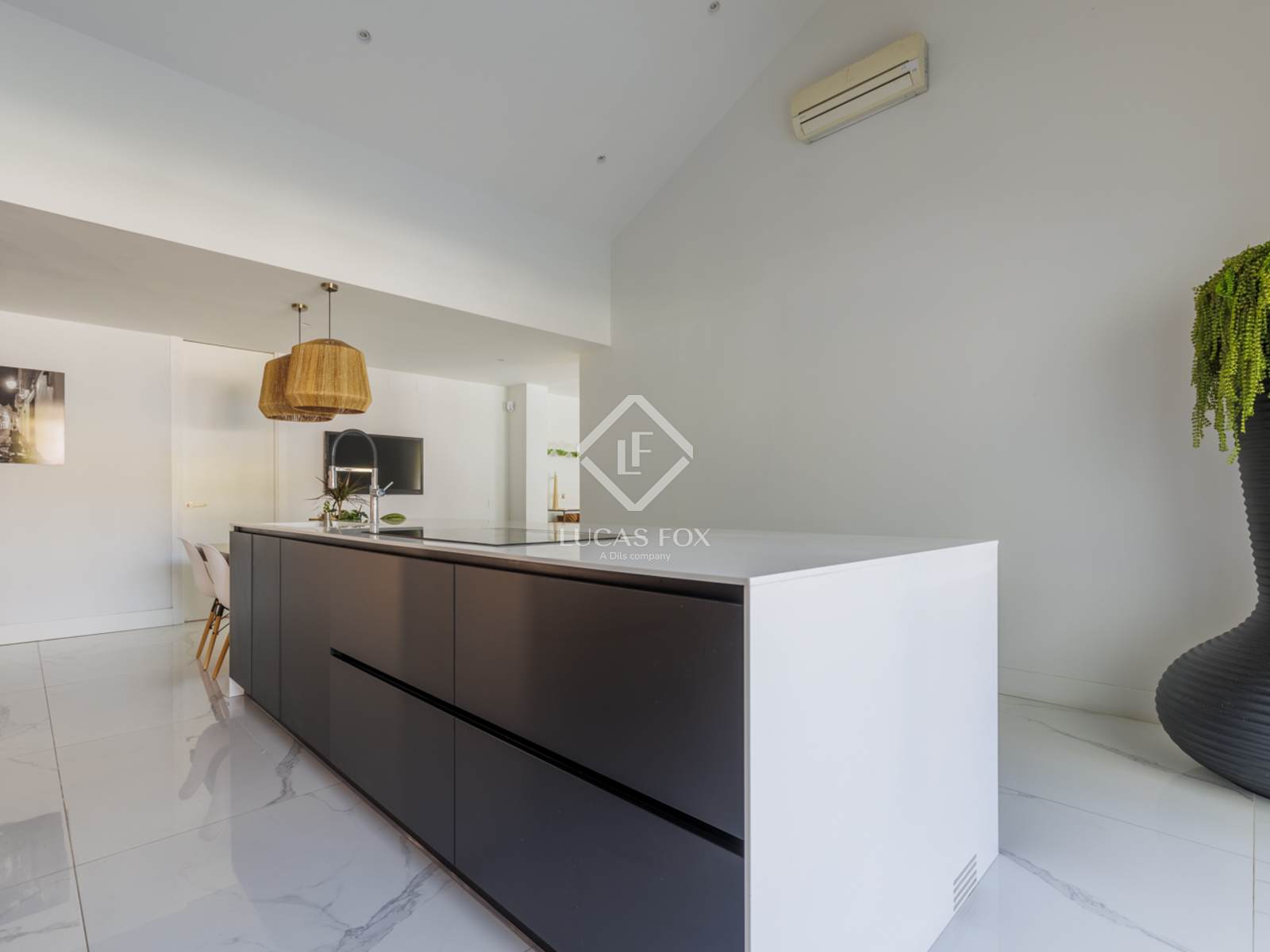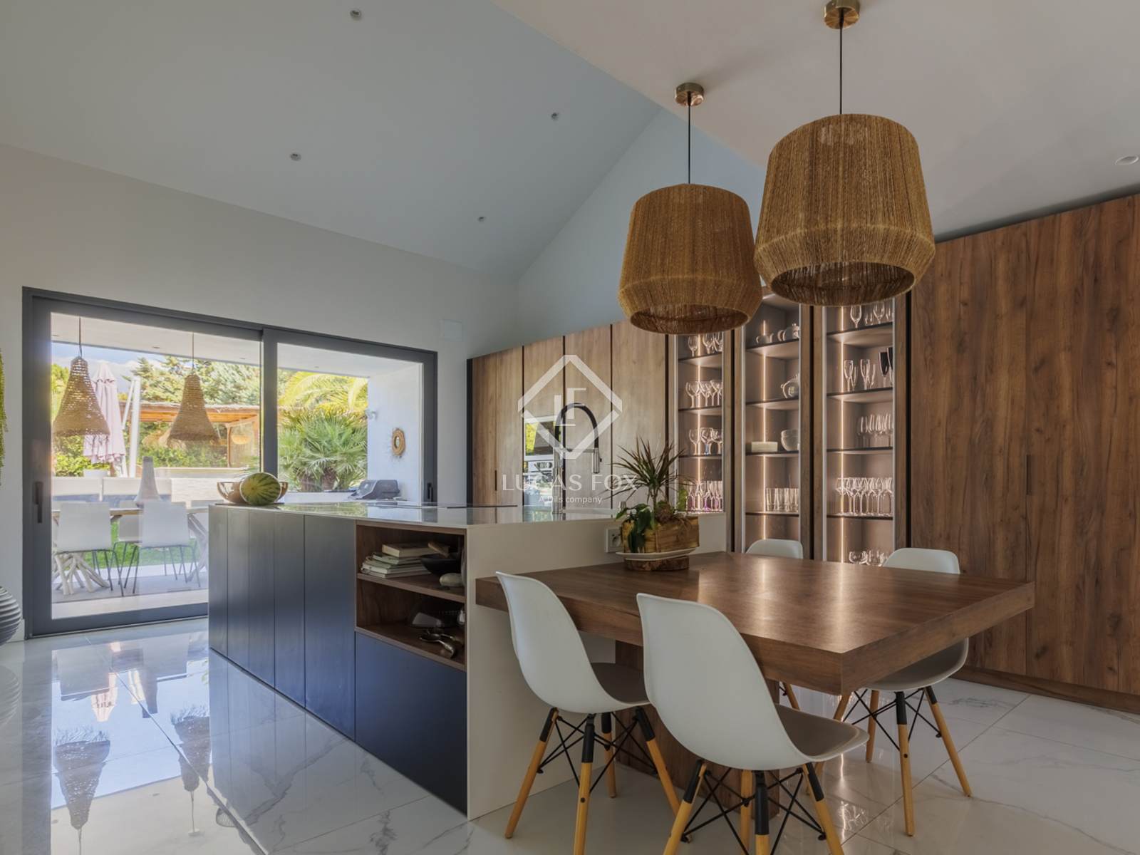 We access the property by crossing the beautiful garden located in the front. Once inside, we find the spacious welcome lobby , ideal for receiving guests. It has a beautiful full designer bathroom and leads to the rest of the areas . At the back, we find the spectacular open-plan living-dining room , with almost 100 m² that overlooks the garden. Next, on the right, it connects with the fabulous designer kitchen, which stands out for its excellent central island and which offers direct access to the porch and garden.