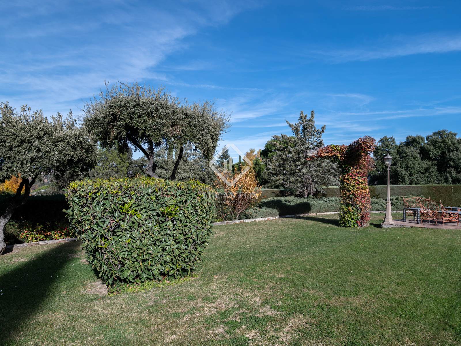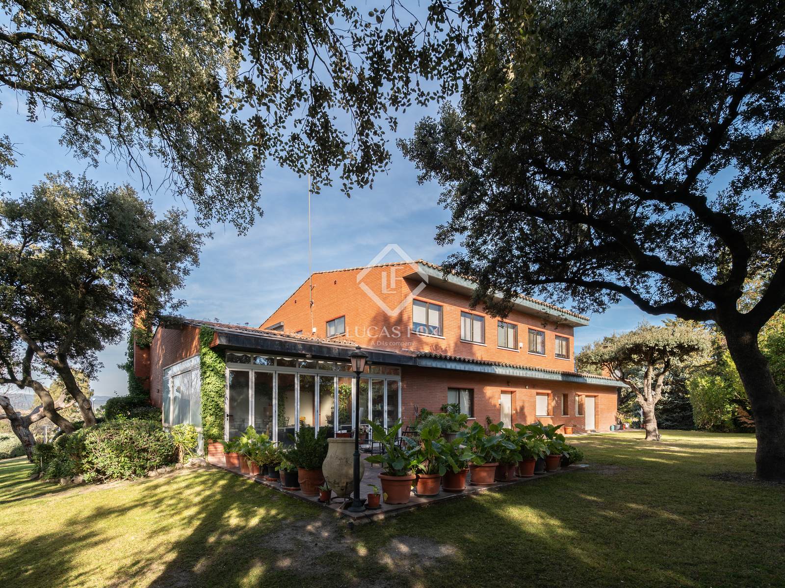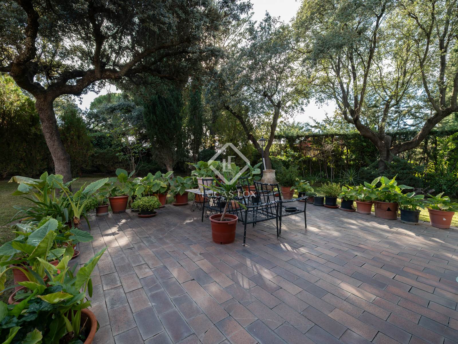 Exterior , the lush garden with mature trees stands out, surrounding the pool—fenced for safety—and creating a perfect setting for family-friendly enjoyment. The terrace, designed as a chill-out area, along with the barbecue area, become ideal spaces for socializing and enjoying the outdoors.