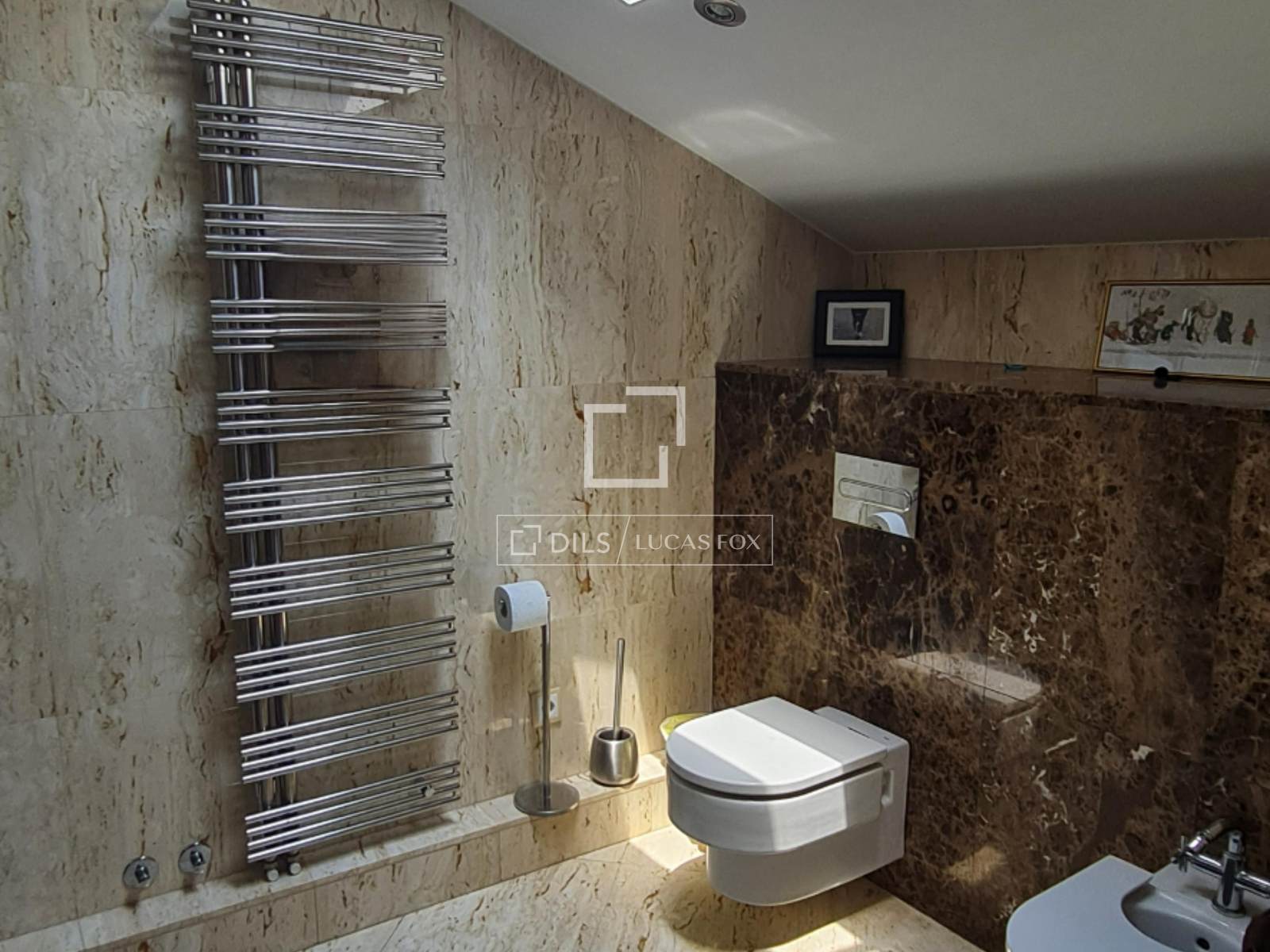 Impressive 50 m² main bedroom with a large dressing room, sitting area or study , and a spectacular travertine marble bathroom . A truly private suite.