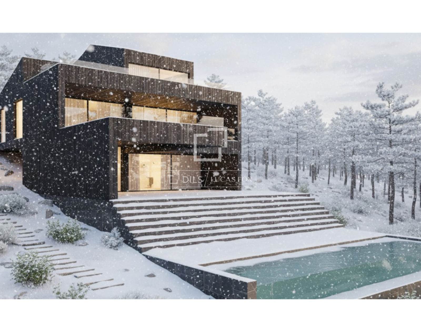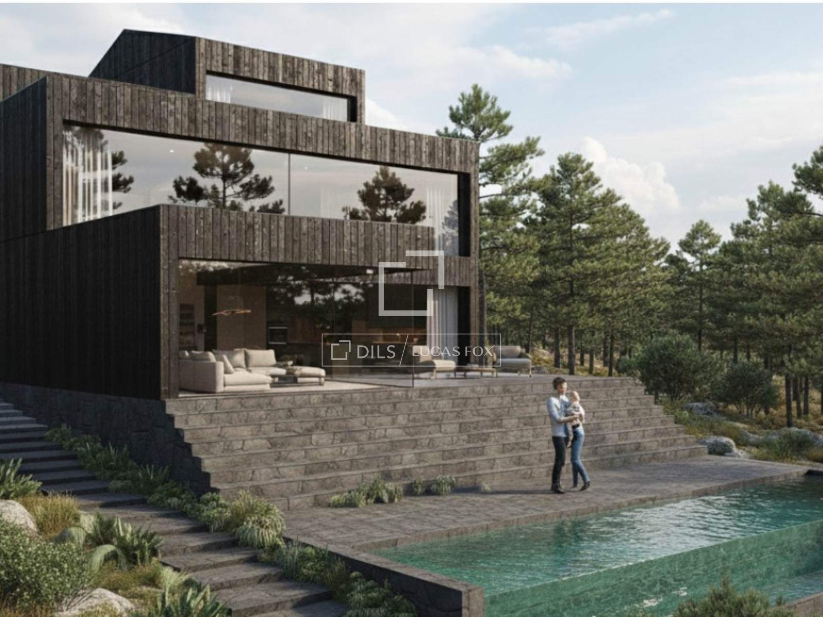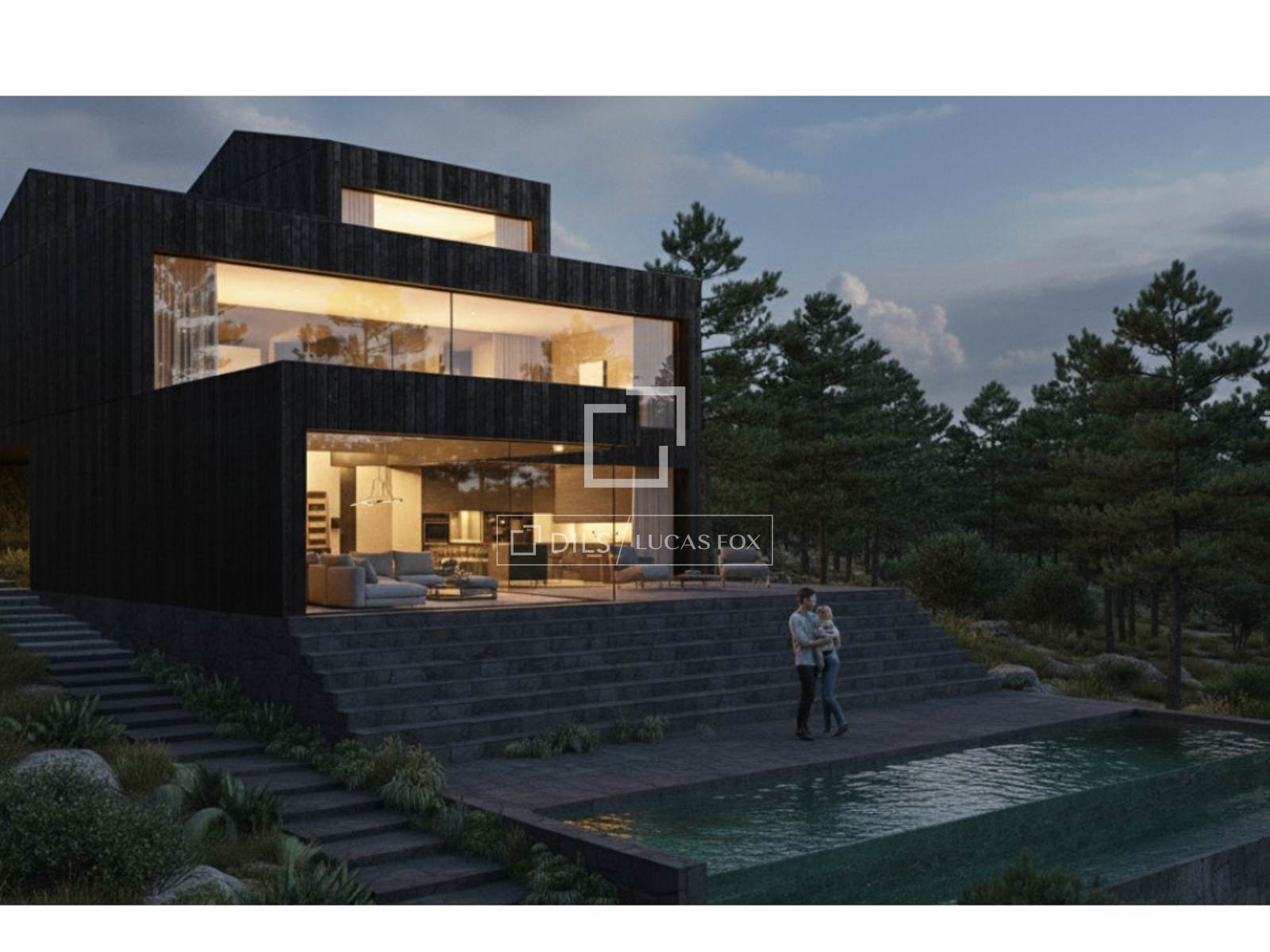 These conditions guarantee a level of legal certainty and progress that is virtually impossible to find today. We present renderings of the aforementioned construction project for a uniquely architecturally designed property , conceived to blend into the landscape and offer panoramic views of the reservoir through large windows. A project for a truly iconic home in a protected location of incalculable value, within the Sierra de Guadarrama National Park.