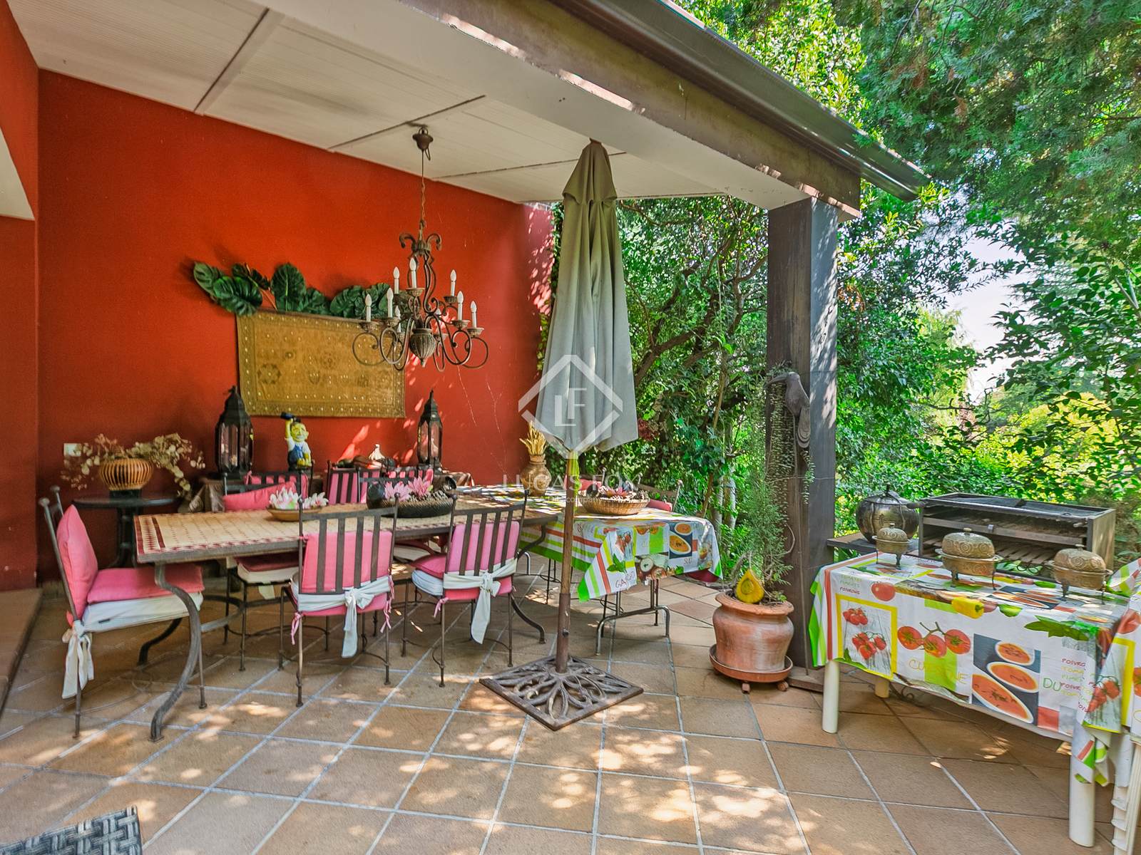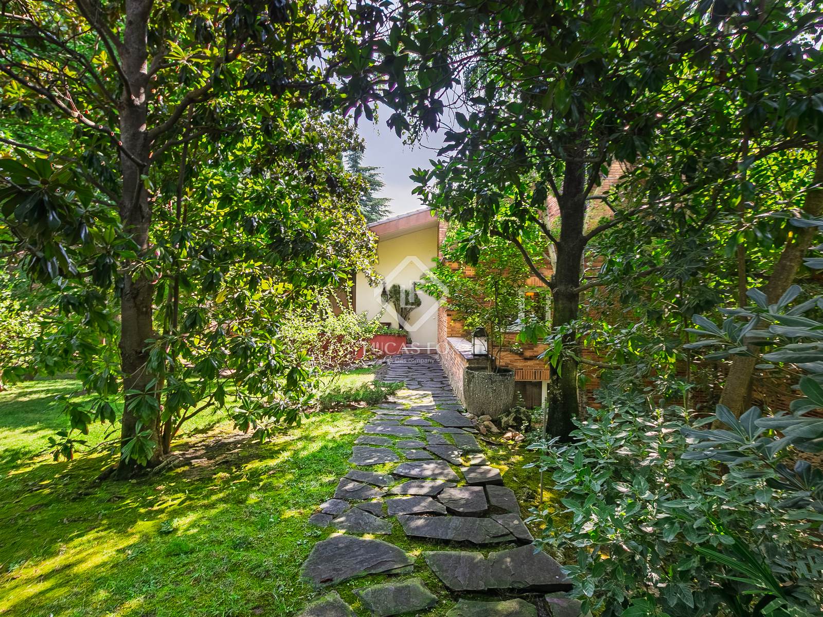 The property stands on an impressive 2,500 m² plot with a well-maintained, mature garden and has a constructed area of approximately 700 m². It stands out for its traditional design with an exposed brick facade and dark hydraulic tile roof.