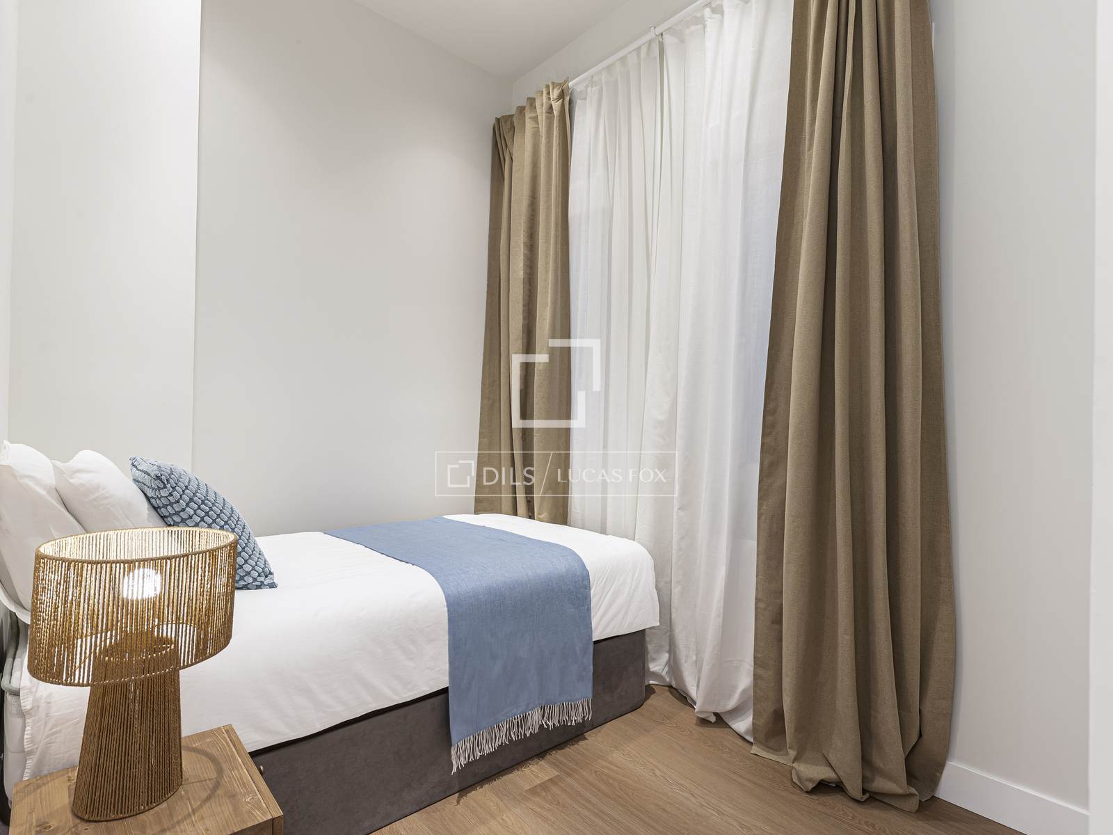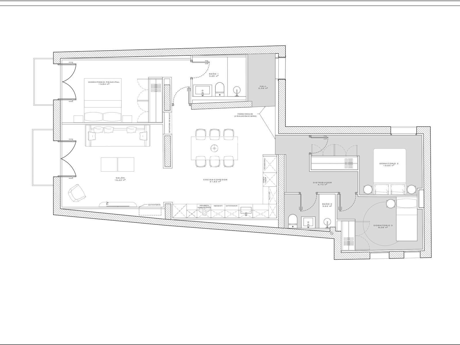 The bedroom area comprises three bedrooms and two bathrooms. The exterior main bedroom features an en-private bathroom and access to a classic wrought-iron balcony, characteristic of traditional Madrid facades. The second bedroom, a double, has a Juliet balcony overlooking the courtyard. The third single bedroom offers great versatility, as it can be used as a bedroom, study , or creative studio depending on the needs. A second, beautifully designed full bathroom serves the entire property and also functions as a guest bathroom.
