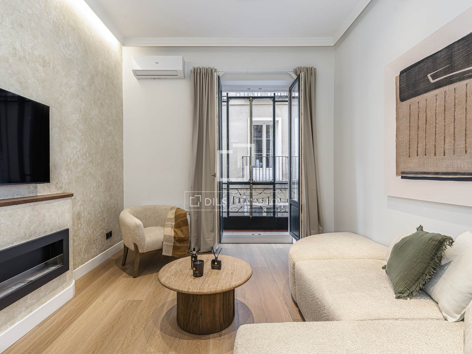 The apartment is located in a historic building , while the property boasts a contemporary yet timeless design. It also features large windows that allow for plenty of natural light.