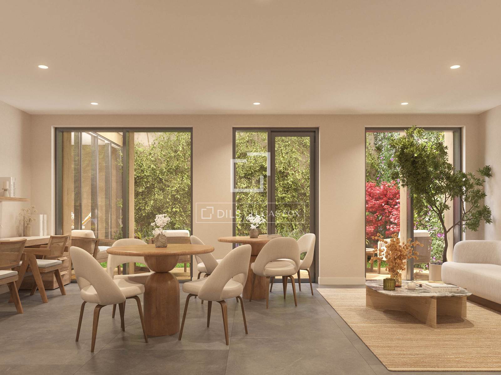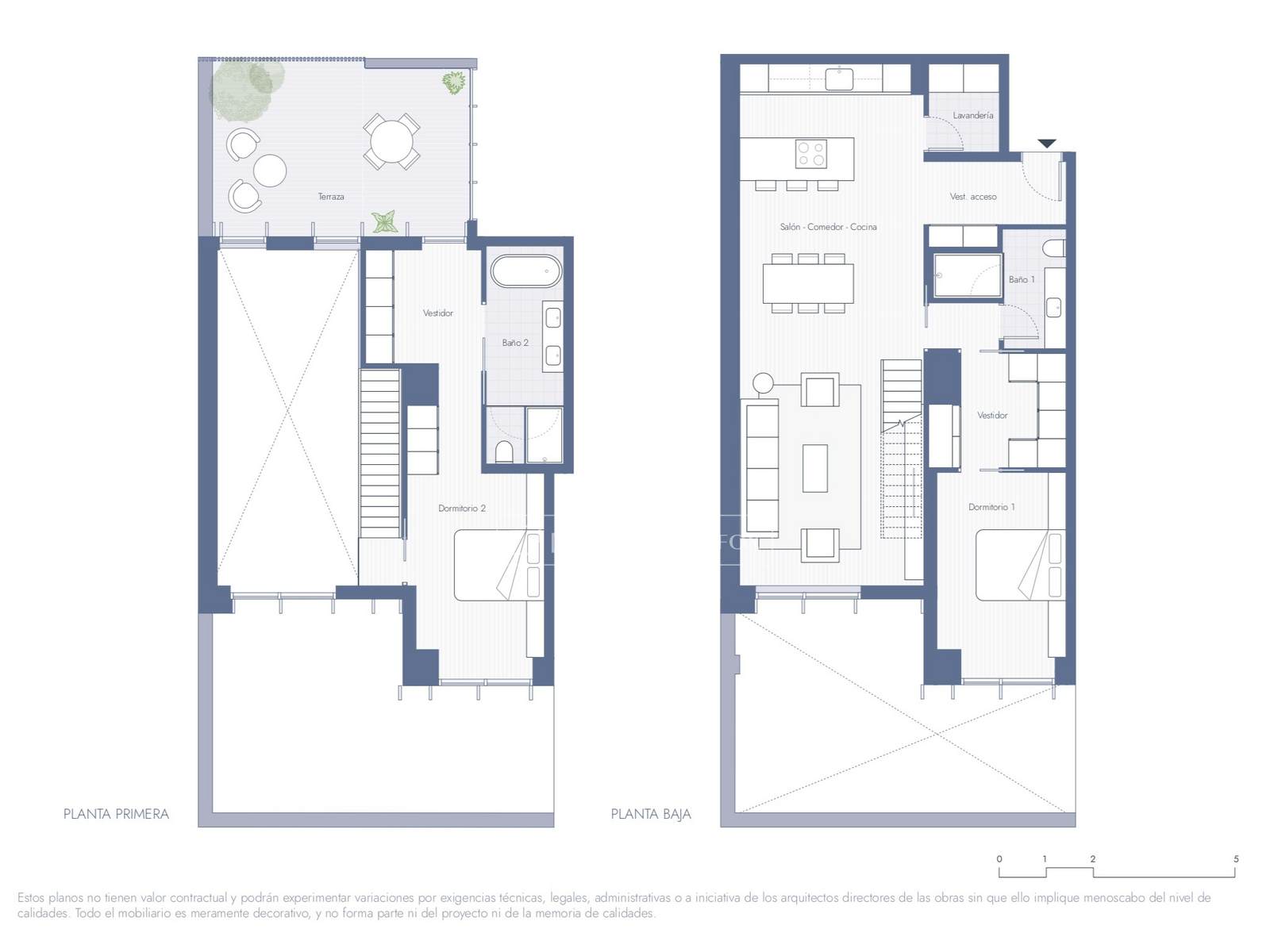 This exterior apartment receives abundant natural light. It is a ground floor -floor duplex with 116 m² of built area. The lower floor features a living-dining room with an open-plan kitchen, a bathroom , and a bedroom with a dressing room. The upper floor features a bedroom with a private bathroom and a dressing room. It also has a 22 m² terrace.