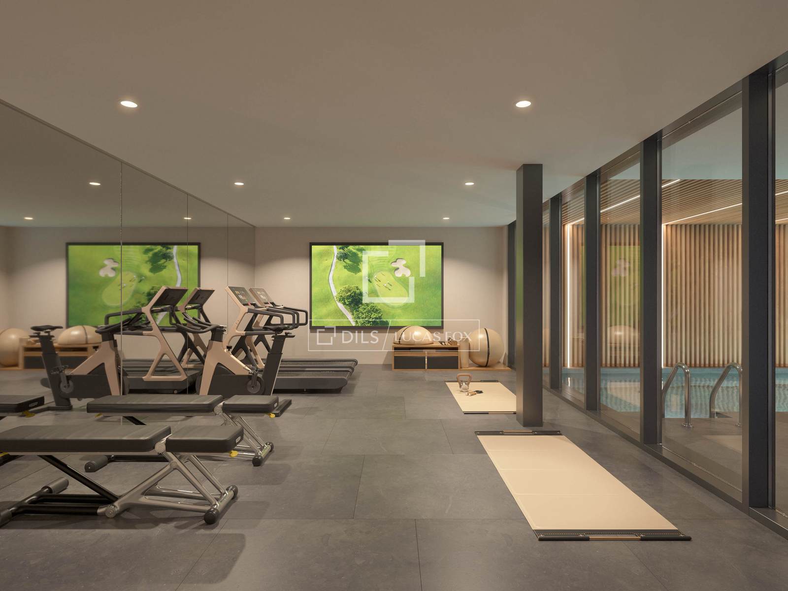 The exclusive development boasts magnificent communal areas: a heated indoor pool, a fully equipped gym, a coworking space, an exterior rooftop pool with views of the Golden Mile, underground parking, and storage rooms.