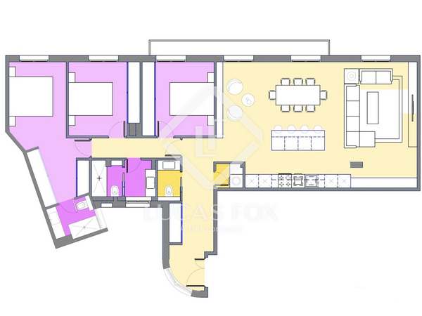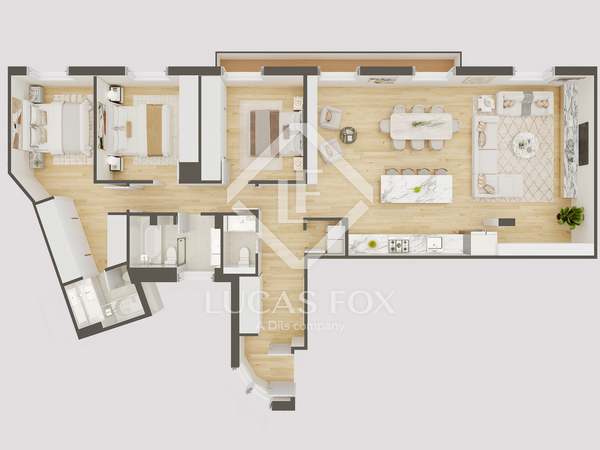 The apartment, completely renovated by design, has 261 square meters that are very useful, distributed in two large living areas , very bright and sunny as it has two balconies overlooking a tree-lined street, a dining room, an open kitchen, three bedrooms with three bathrooms ( the main one is large) and a separate washing machine area.