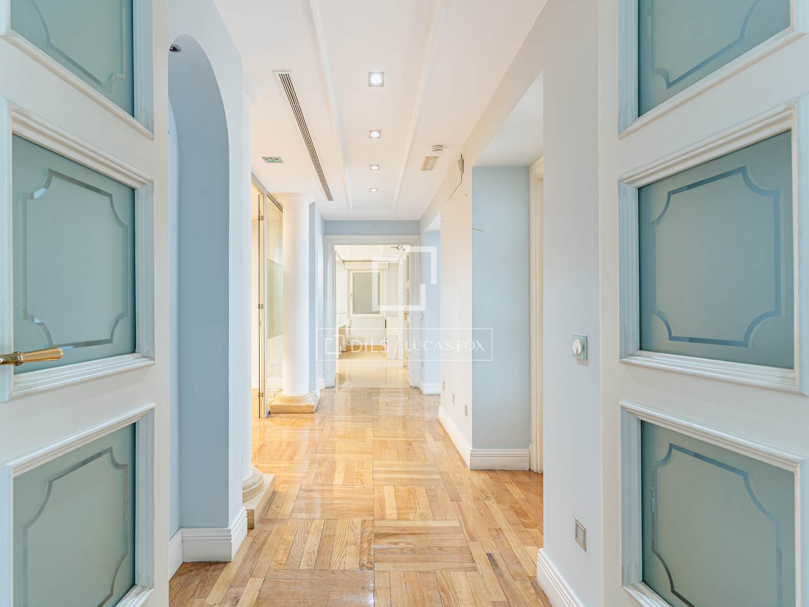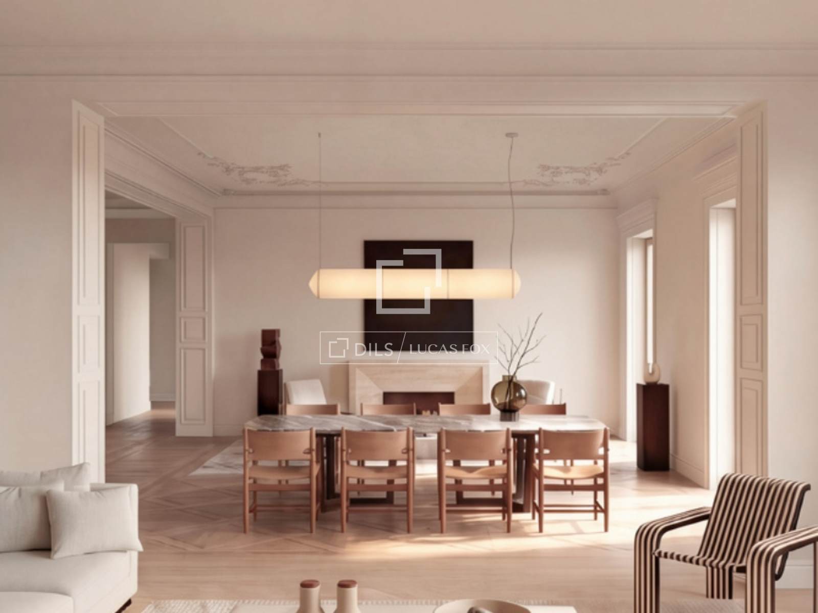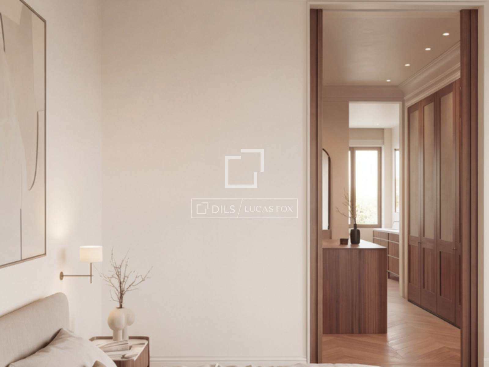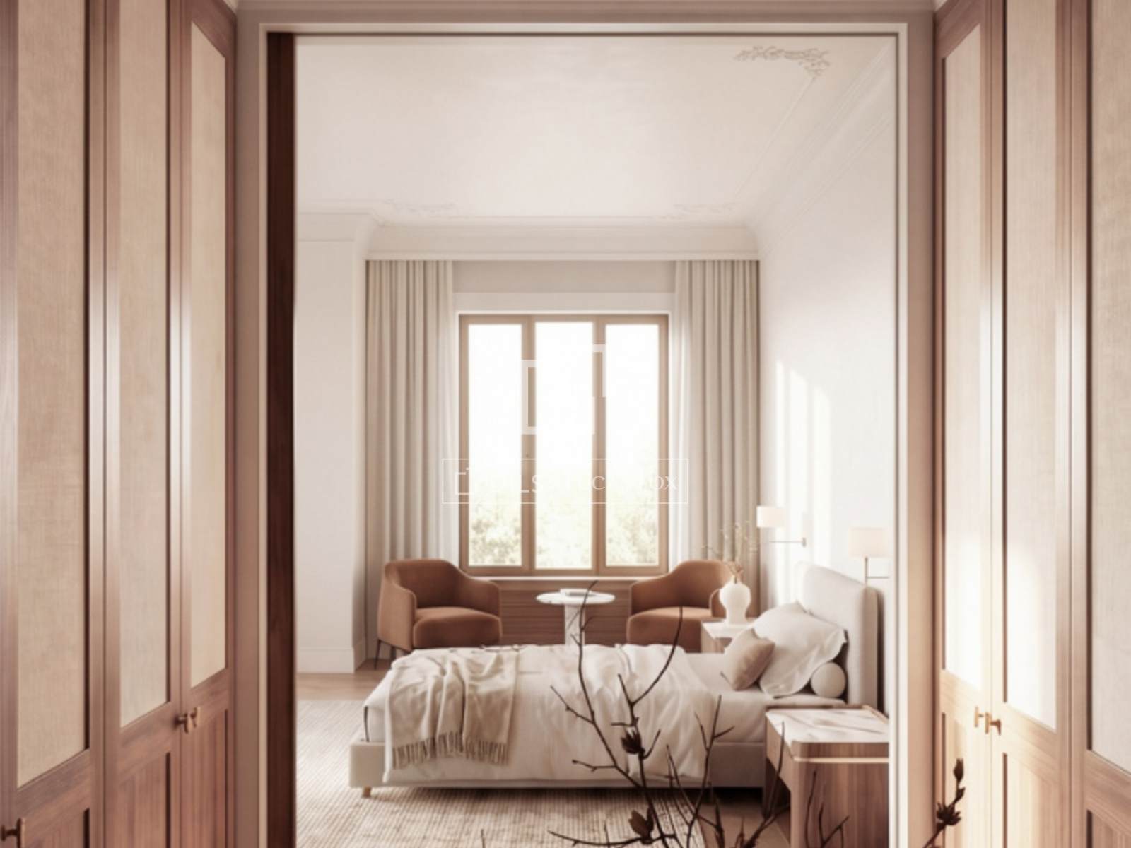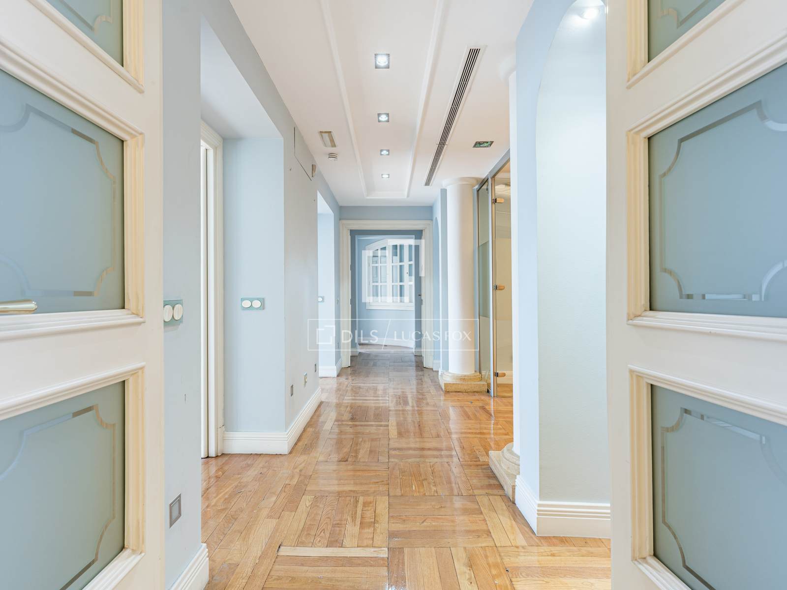 The apartment boasts a southeast orientation, with eight windows facing the street and five corner balconies, providing exceptional natural light throughout the day and open views of one of the neighbourhood's most elegant streets. The 3.05-meter high ceilings contribute to the spaciousness and elegance characteristic of the stately homes in this area.