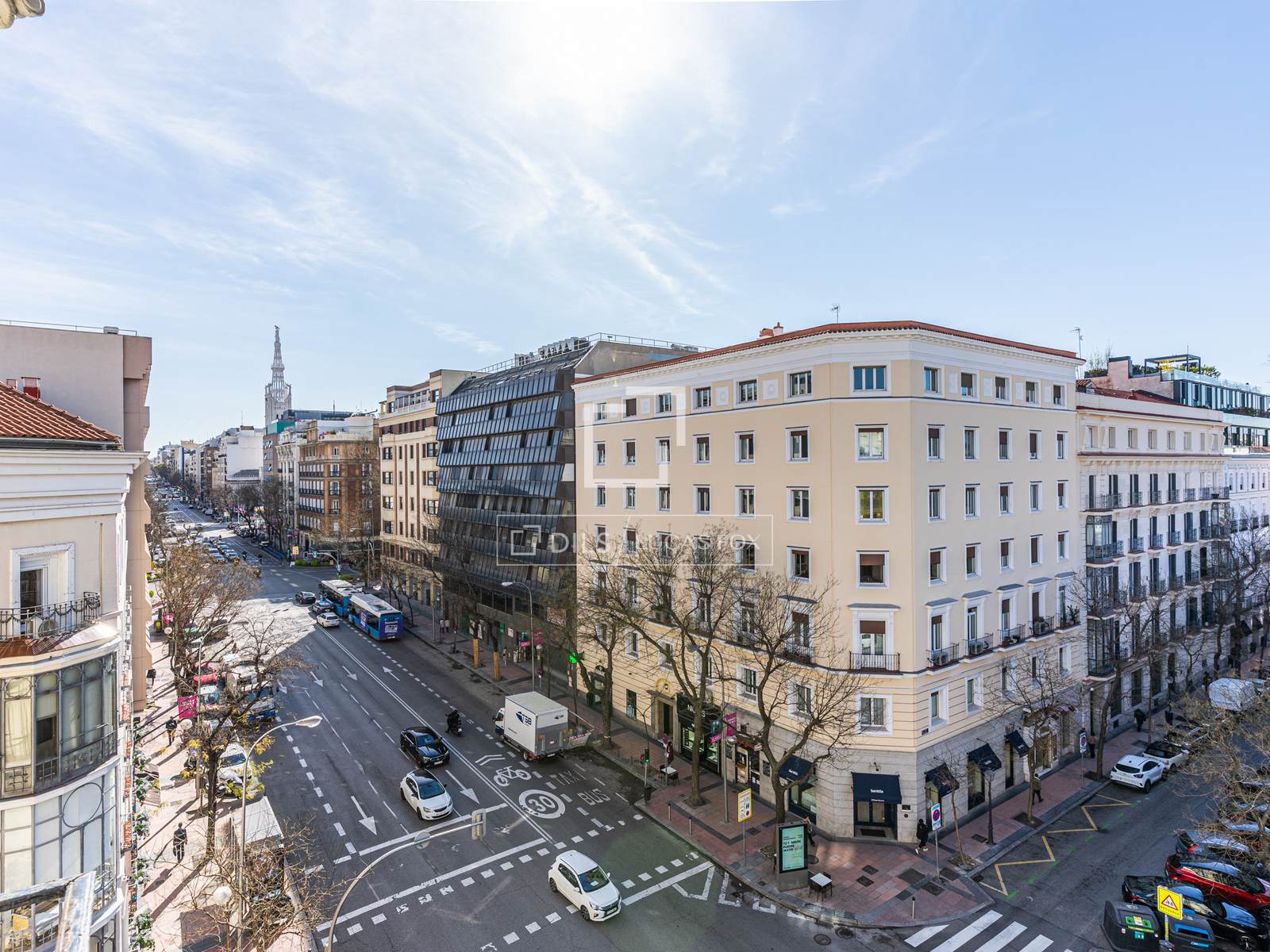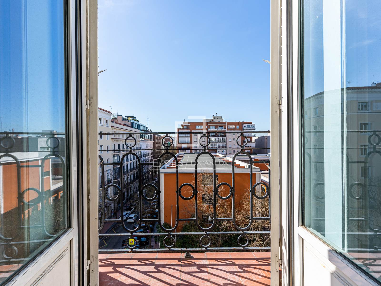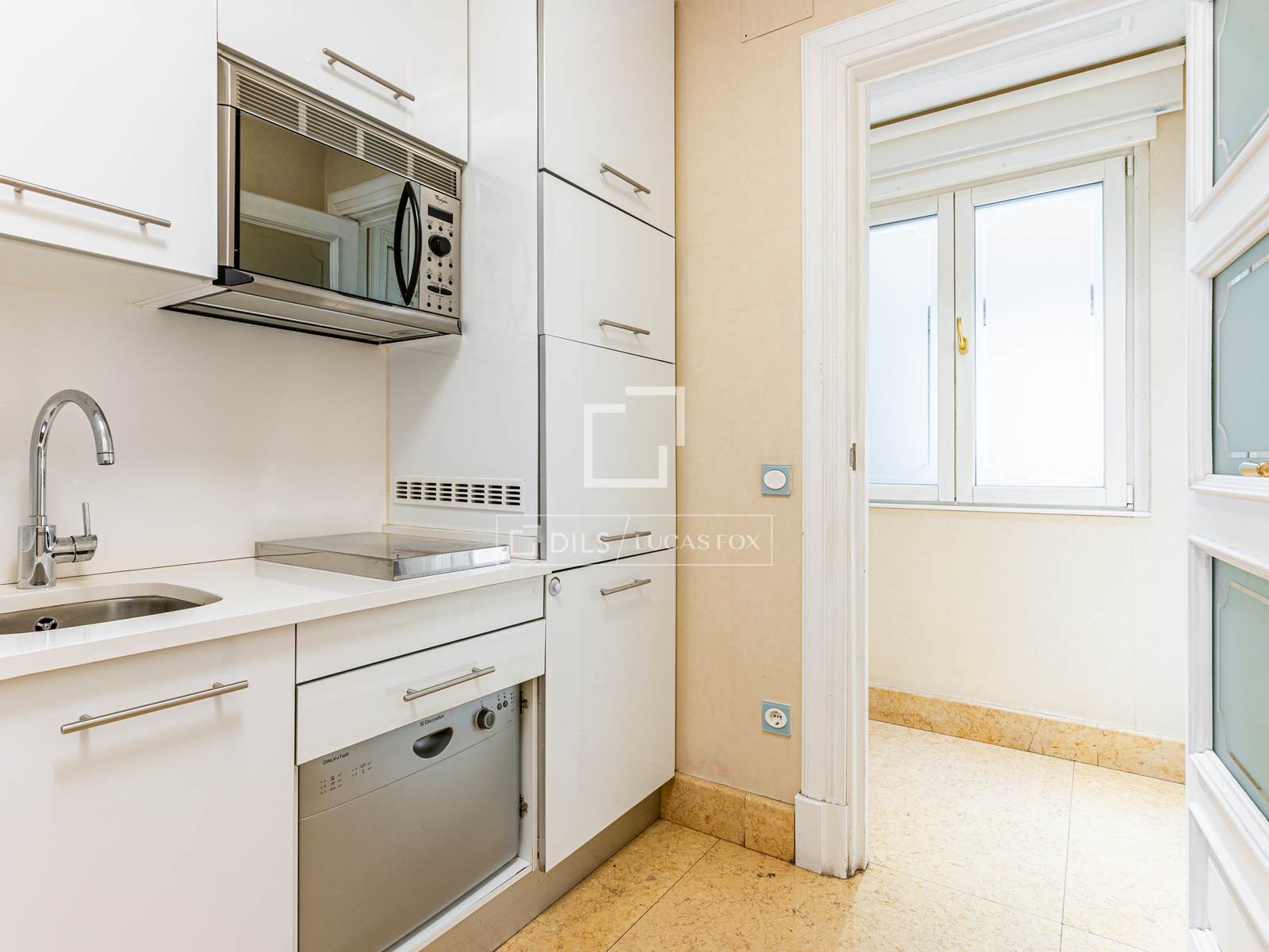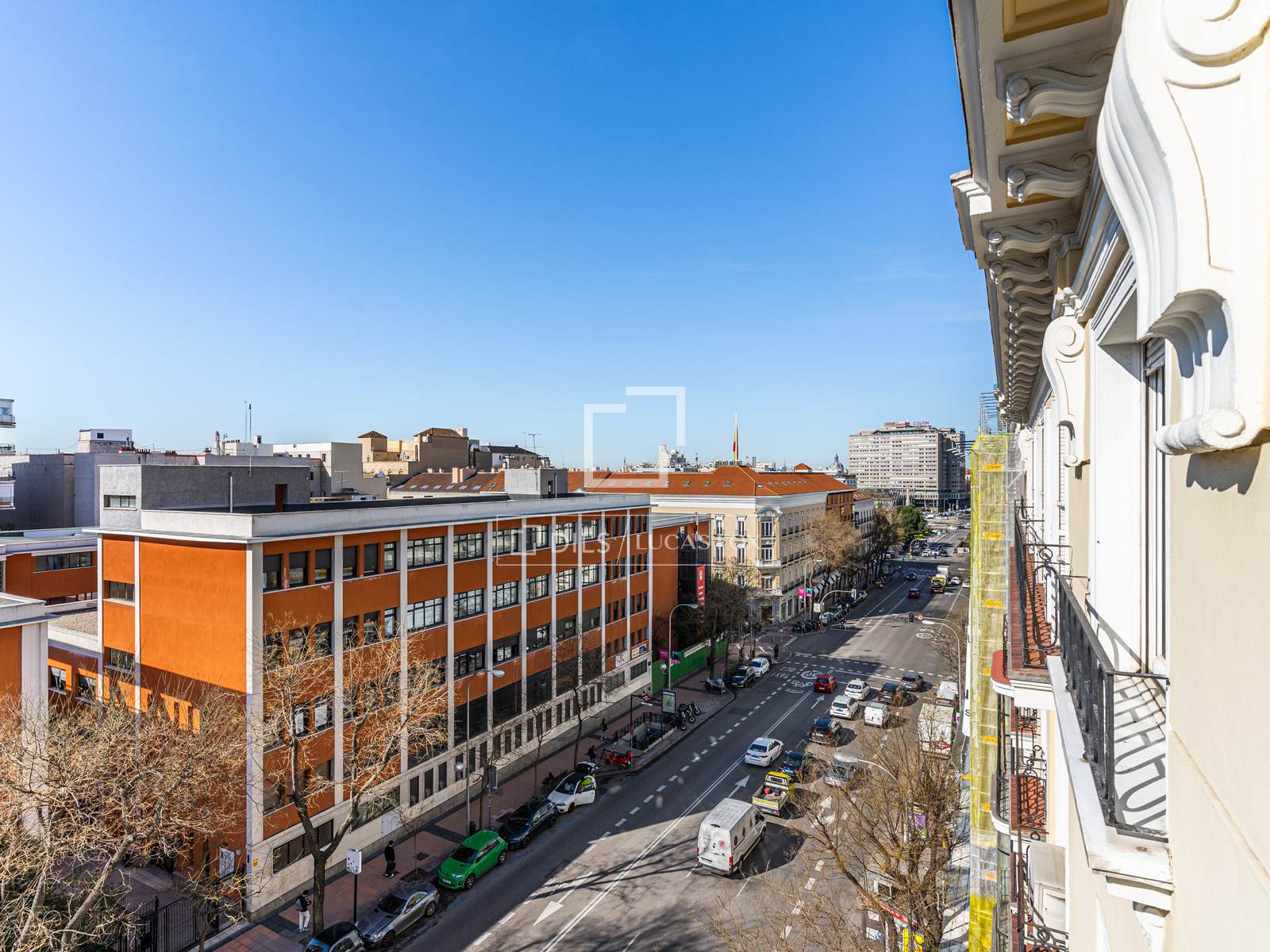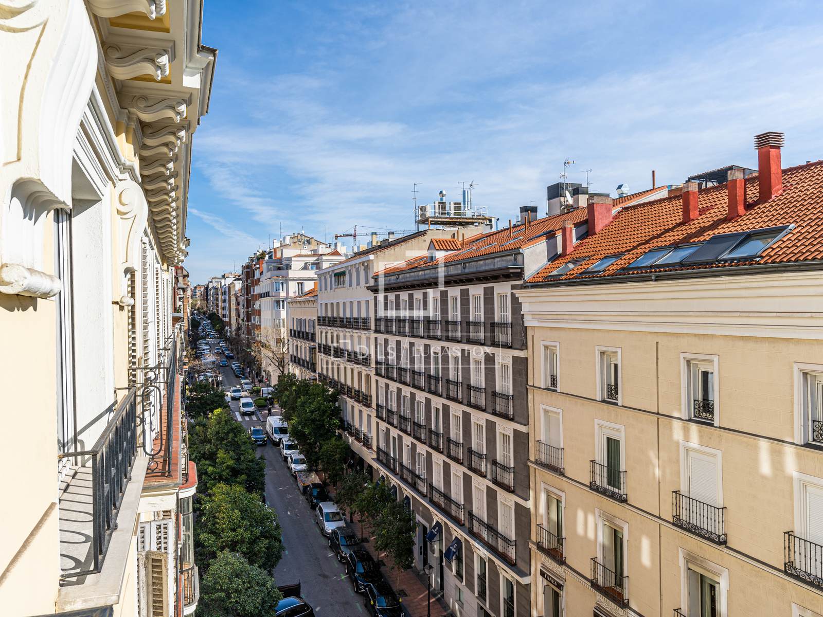 The apartment boasts a southeast orientation, with eight windows facing the street and five corner balconies, providing exceptional natural light throughout the day and open views of one of the neighbourhood's most elegant streets. The 3.05-meter high ceilings contribute to the spaciousness and elegance characteristic of the stately homes in this area.