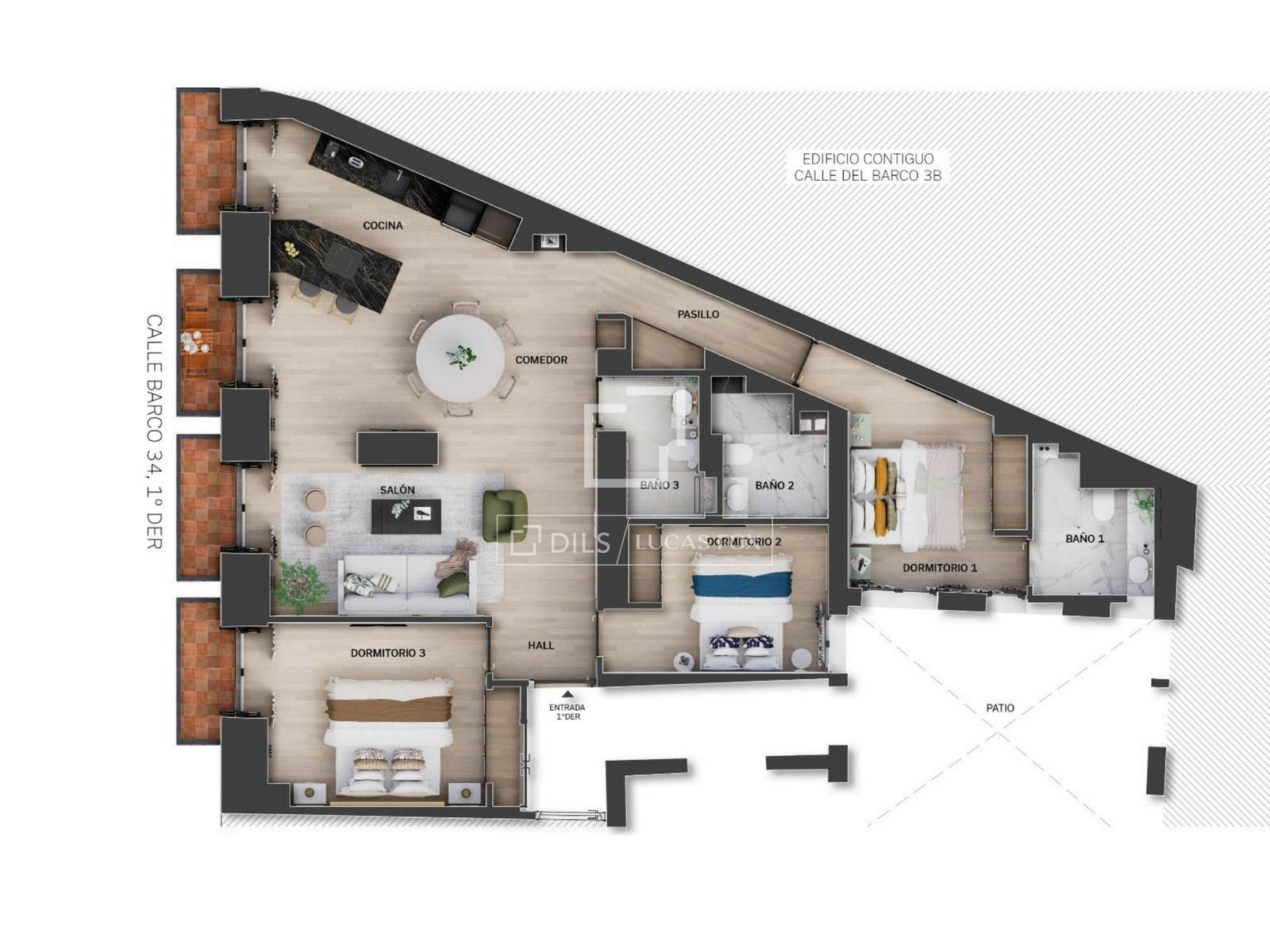 The property is located on the fifth floor with elevator access and has a surface area of 66 m². It has been completely renovated with an architectural and design project by the renowned studio Arctempus, offering a functional and elegant space. It features two double bedrooms and two complete bathrooms, as well as a living-dining room area with an integrated, fully equipped kitchen.