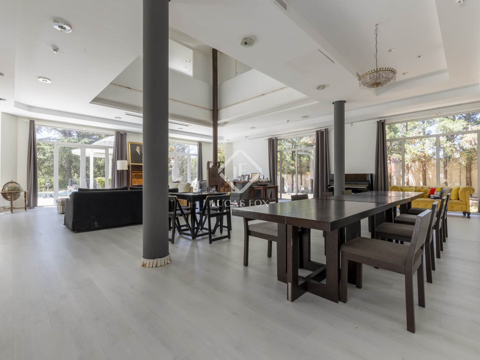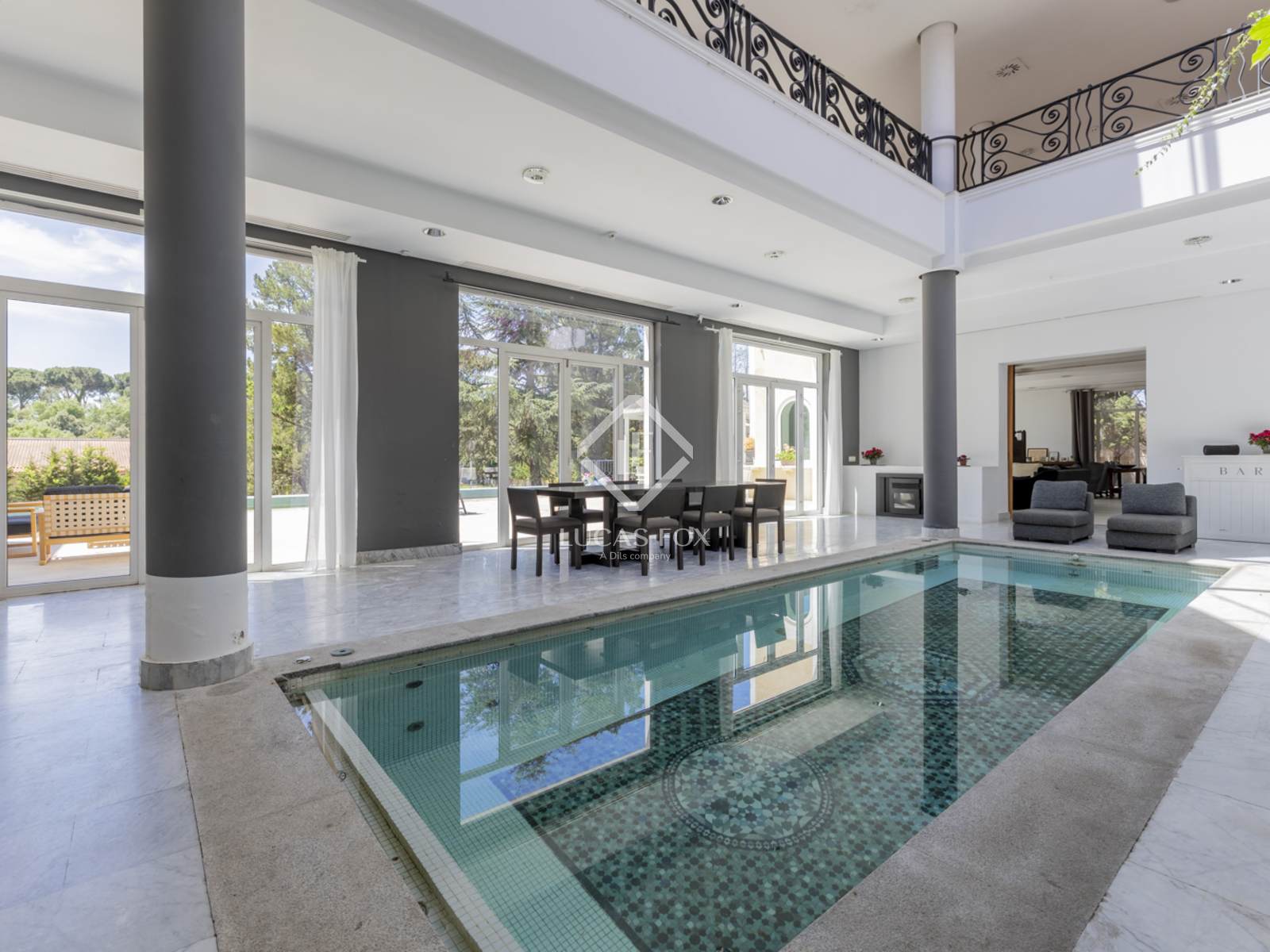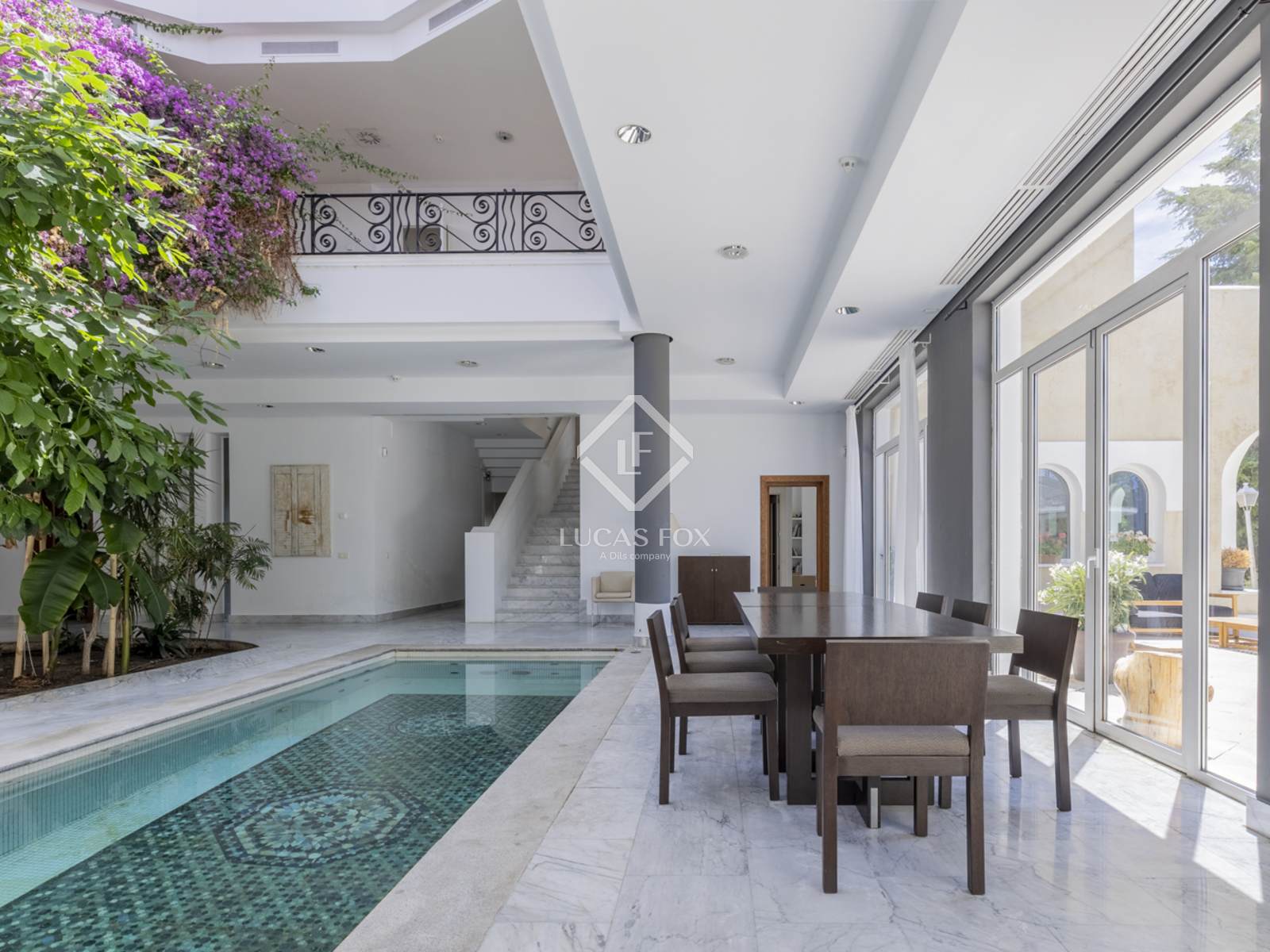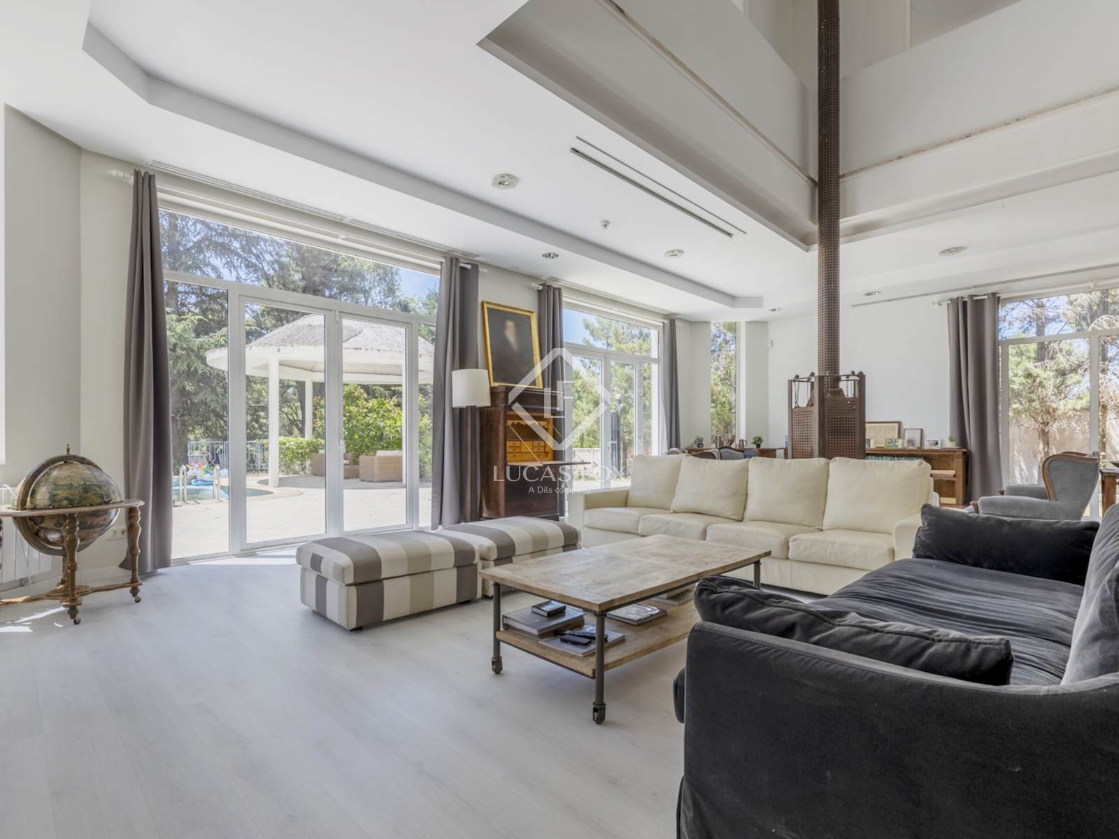 Spectacular villa for sale with a grand living room with high ceilings, majestic garden and indoor pool which reflects and celebrates the beauty of a unique architecture in the best urbanization of Pozuelo.