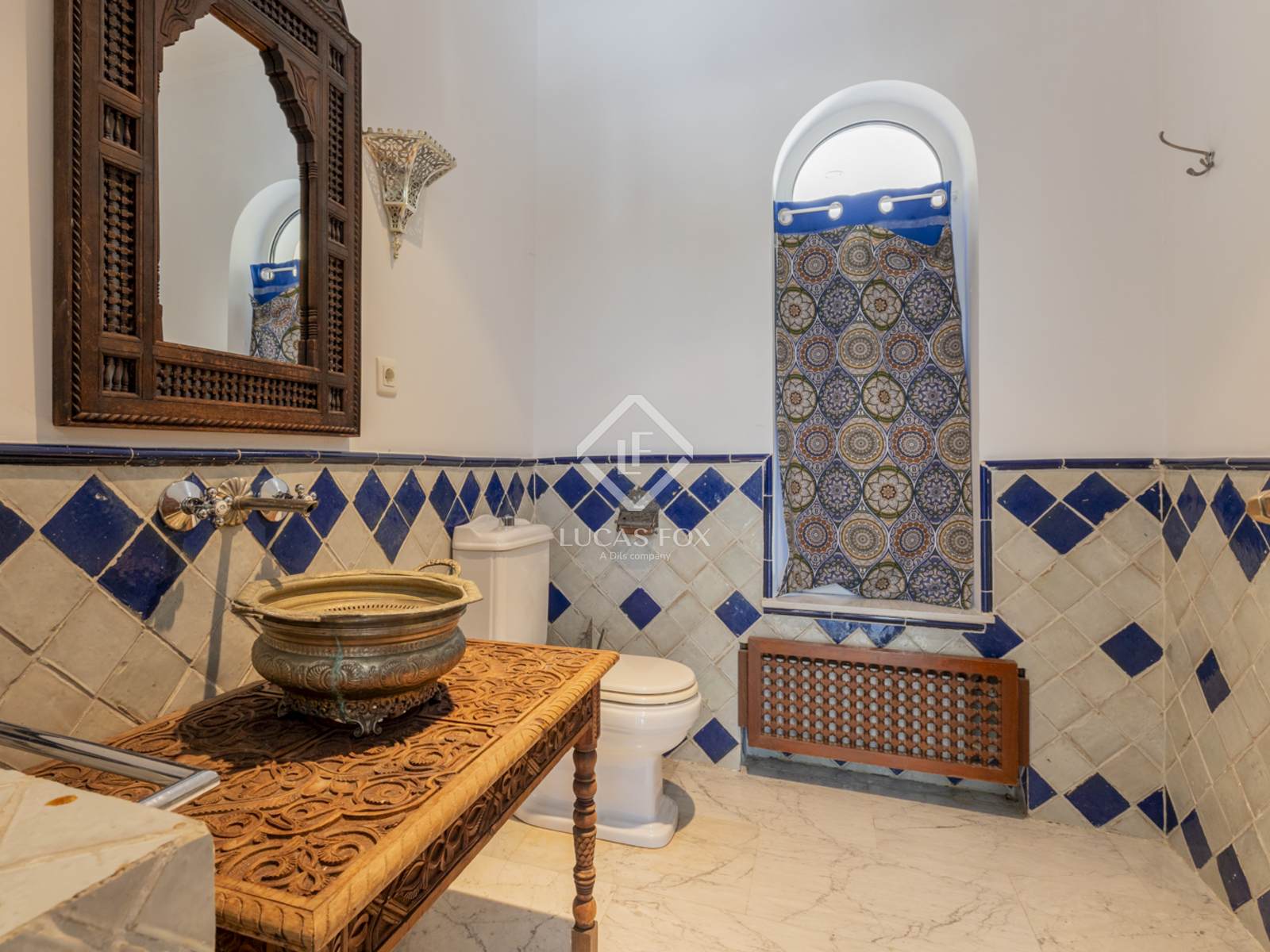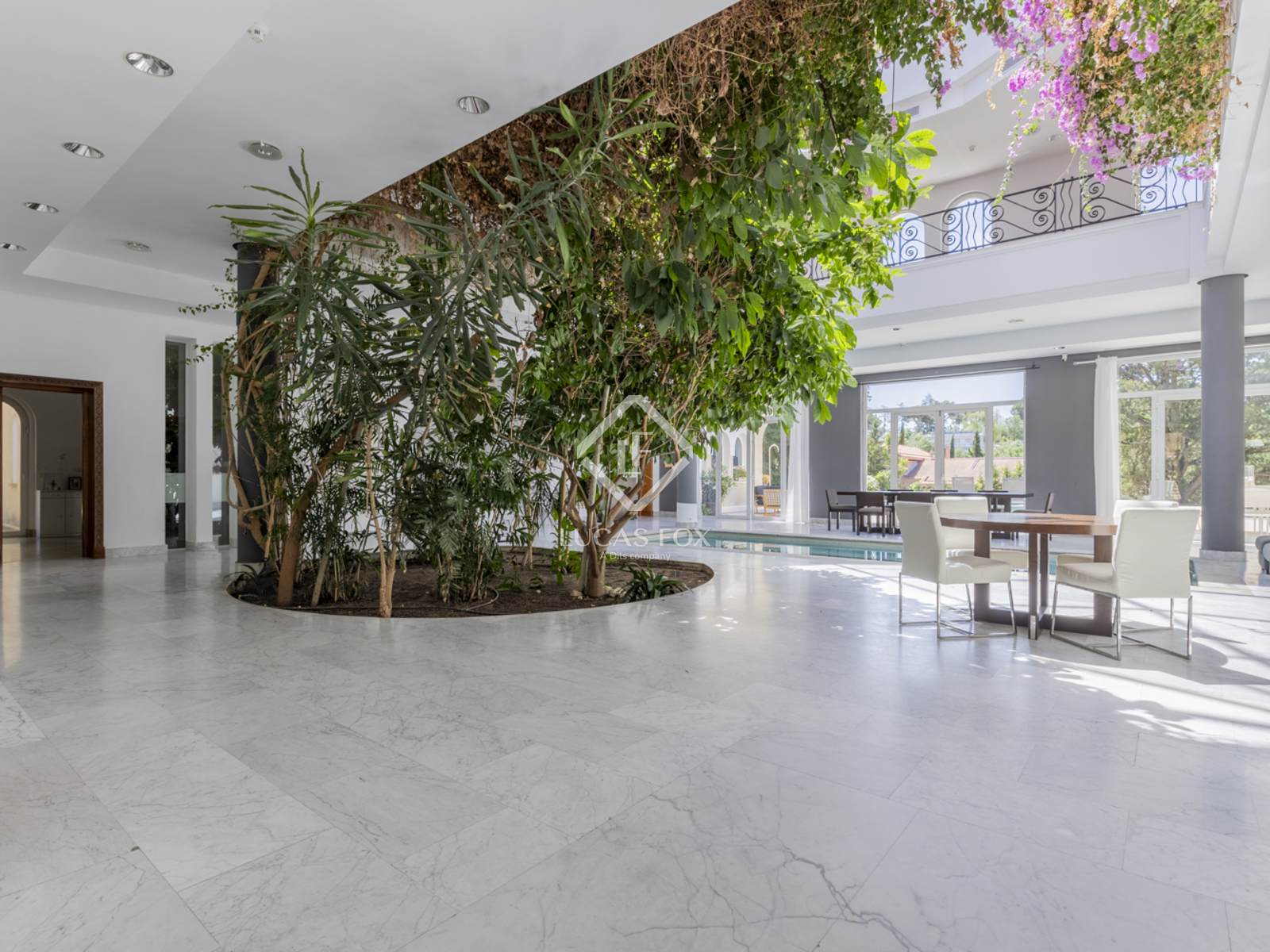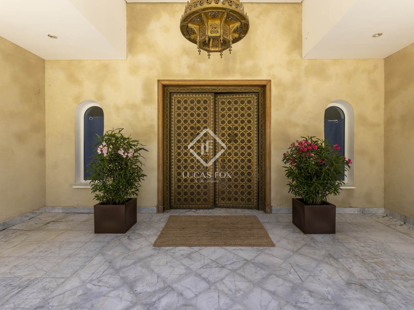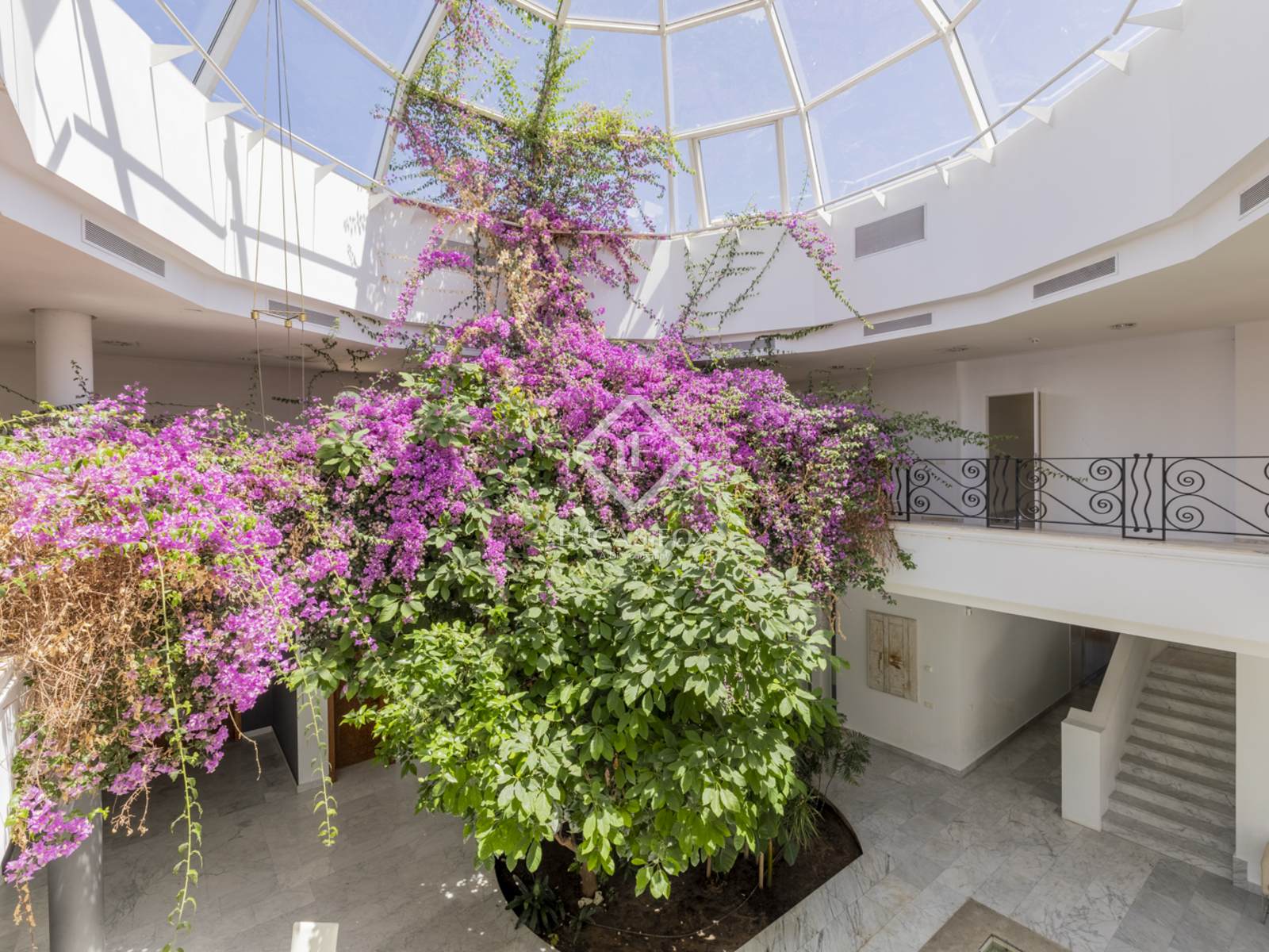 On the main floor , the property offers an elegant entrance hall with two guest toilets and a central hall that houses a heated indoor pool with Jacuzzi, under a spectacular glass dome that floods the space with overhead light. Doors with Moorish details add a touch of palatial grandeur. This level also includes a living room, dining room, kitchen and service area with a bedroom and bathroom, ironing area and laundry room. In addition, it has four large bedrooms, all with dressing rooms and en-suite bathroom , and a gym area connected to the main room, equipped with changing rooms, showers, sauna and Turkish bathroom . The large floor-to-ceiling windows ensure exceptional light in all rooms.