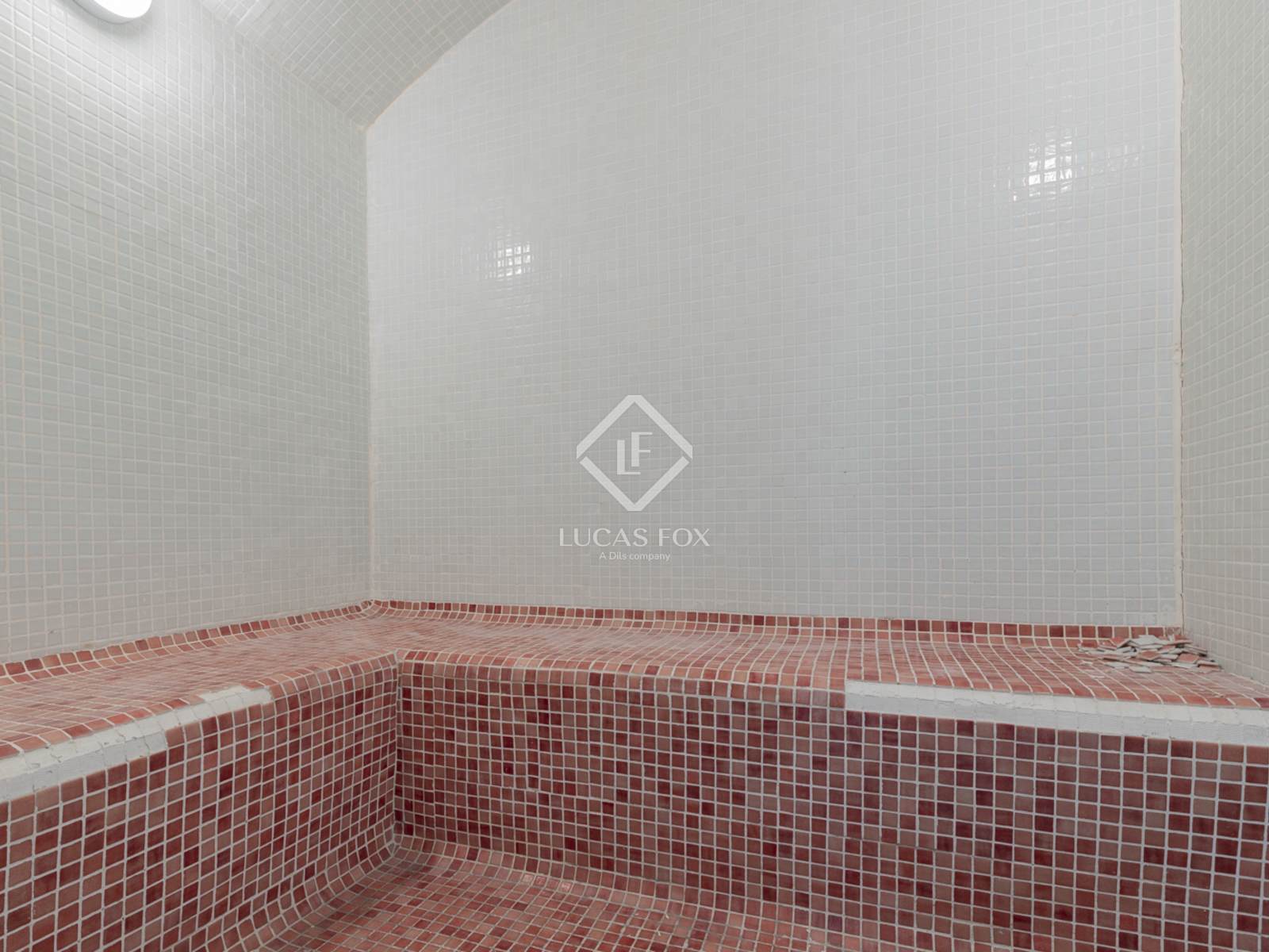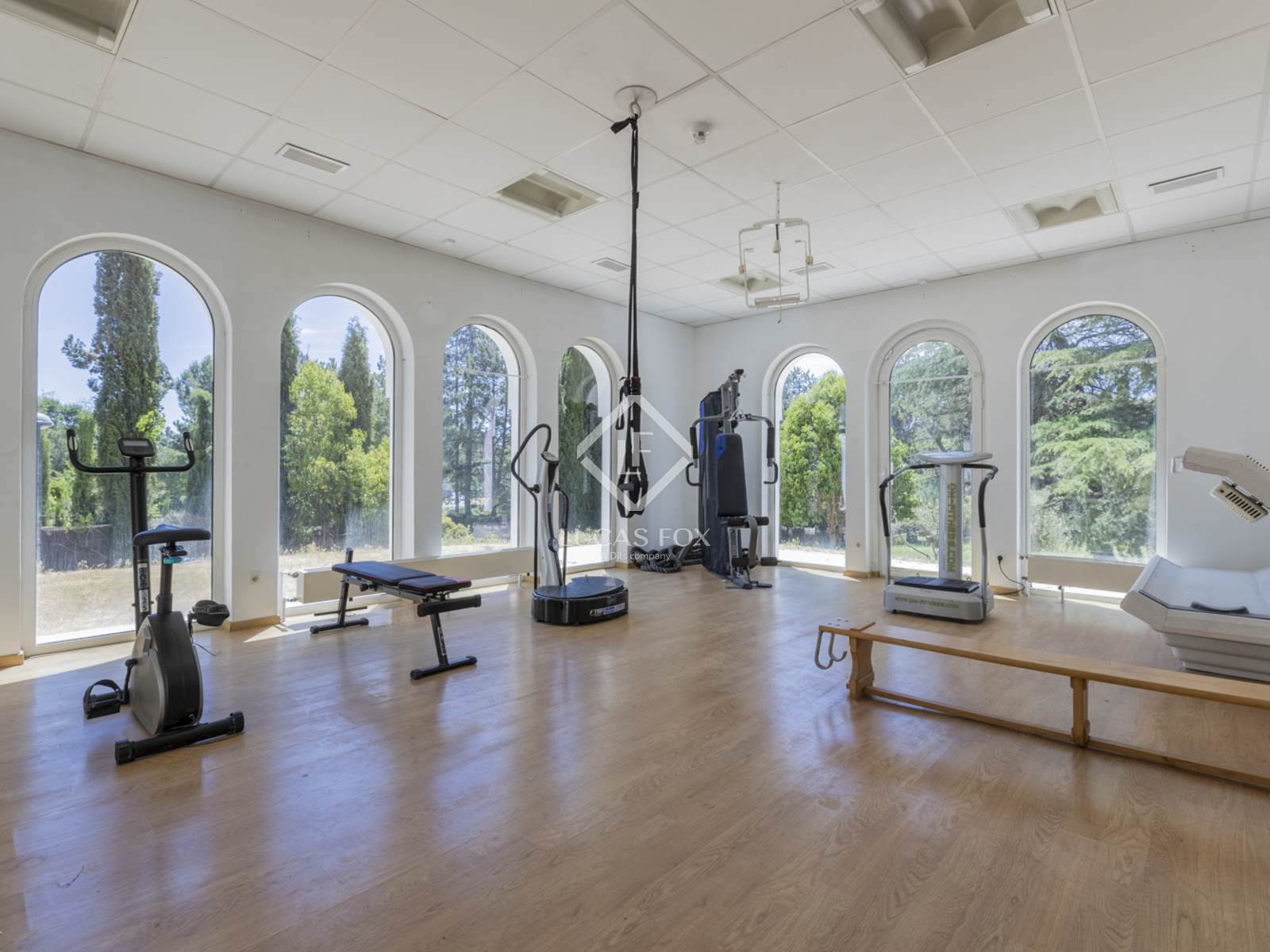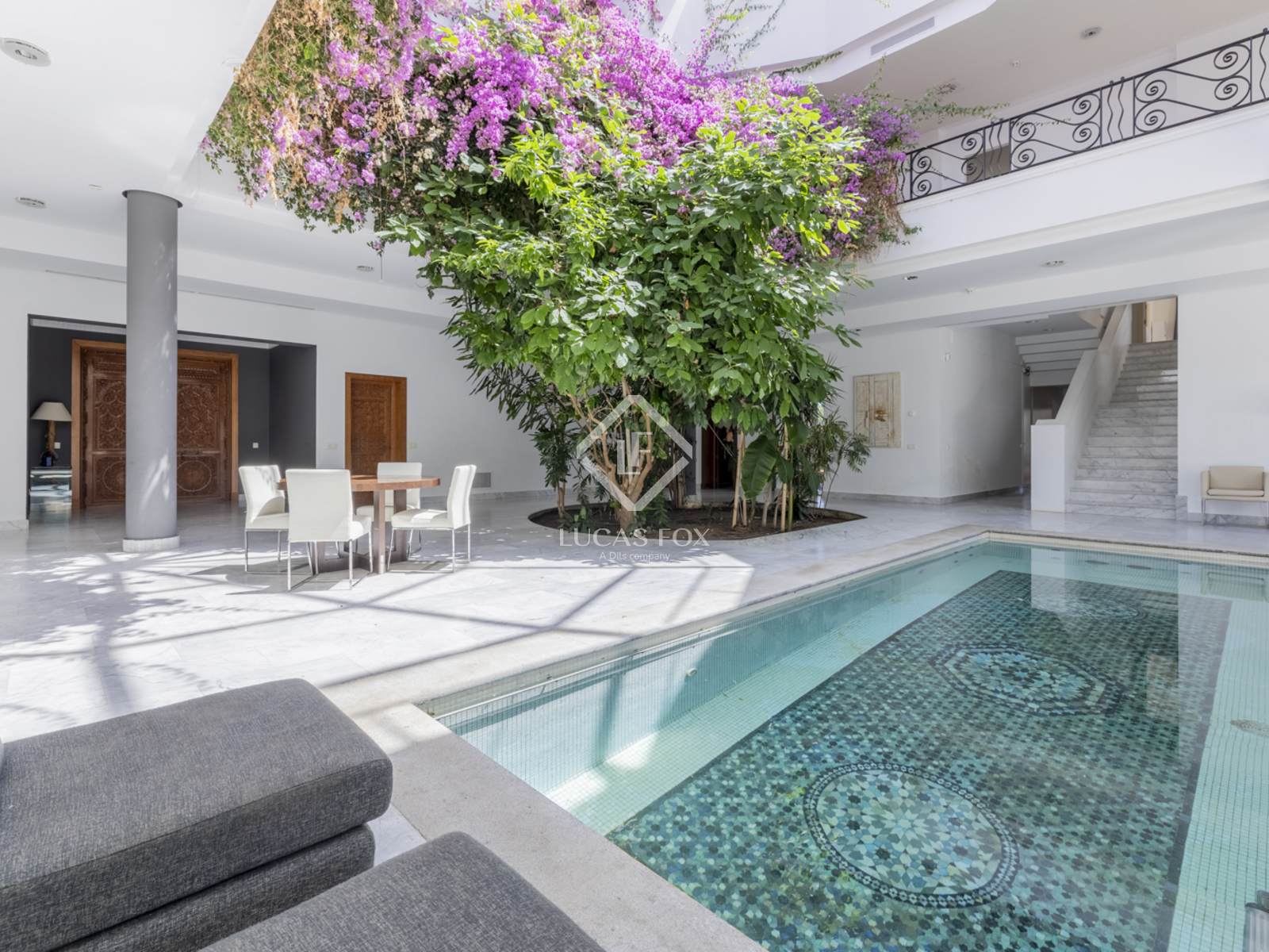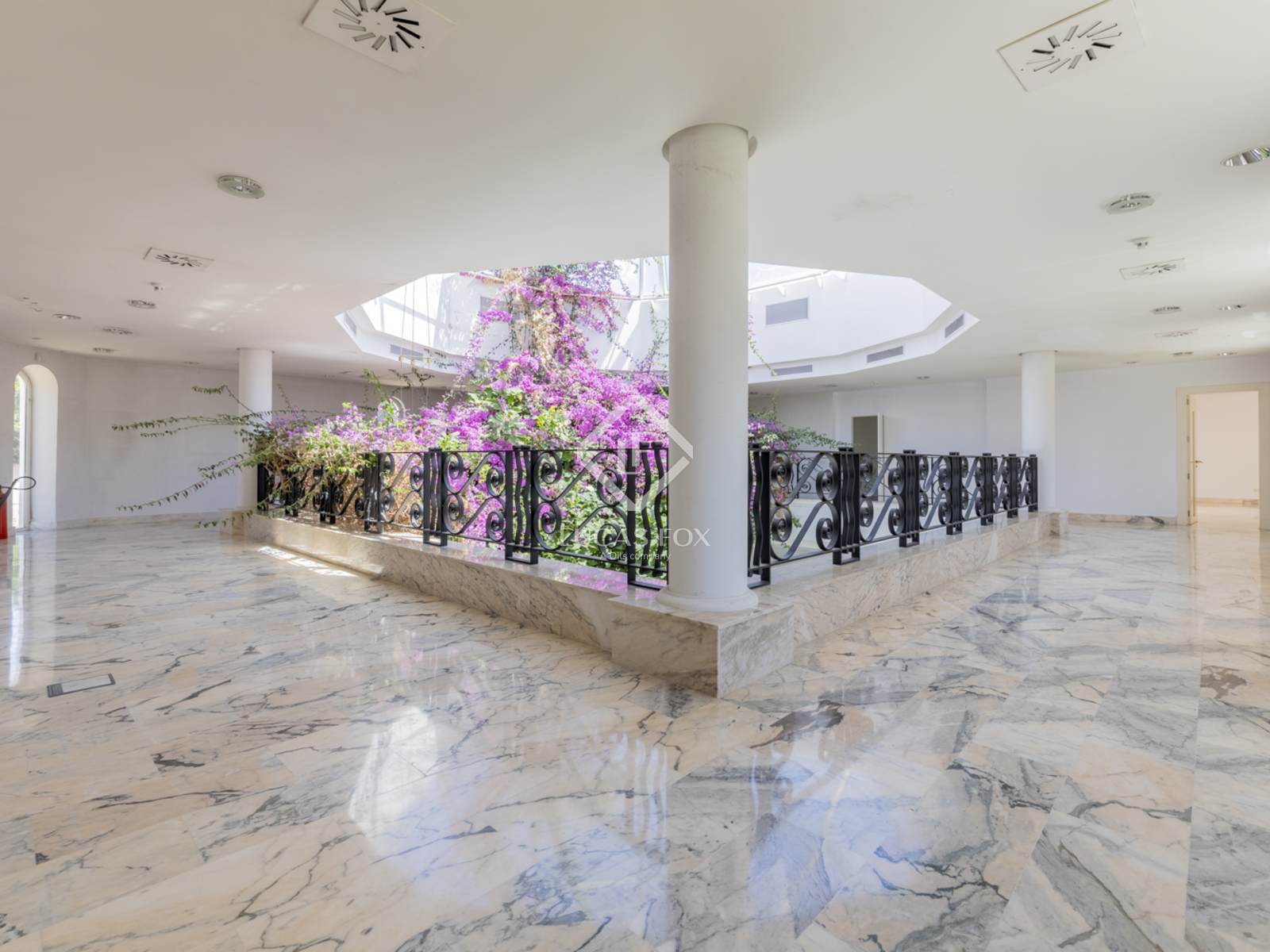On the main floor , the property offers an elegant entrance hall with two guest toilets and a central hall that houses a heated indoor pool with Jacuzzi, under a spectacular glass dome that floods the space with overhead light. Doors with Moorish details add a touch of palatial grandeur. This level also includes a living room, dining room, kitchen and service area with a bedroom and bathroom, ironing area and laundry room. In addition, it has four large bedrooms, all with dressing rooms and en-suite bathroom , and a gym area connected to the main room, equipped with changing rooms, showers, sauna and Turkish bathroom . The large floor-to-ceiling windows ensure exceptional light in all rooms.