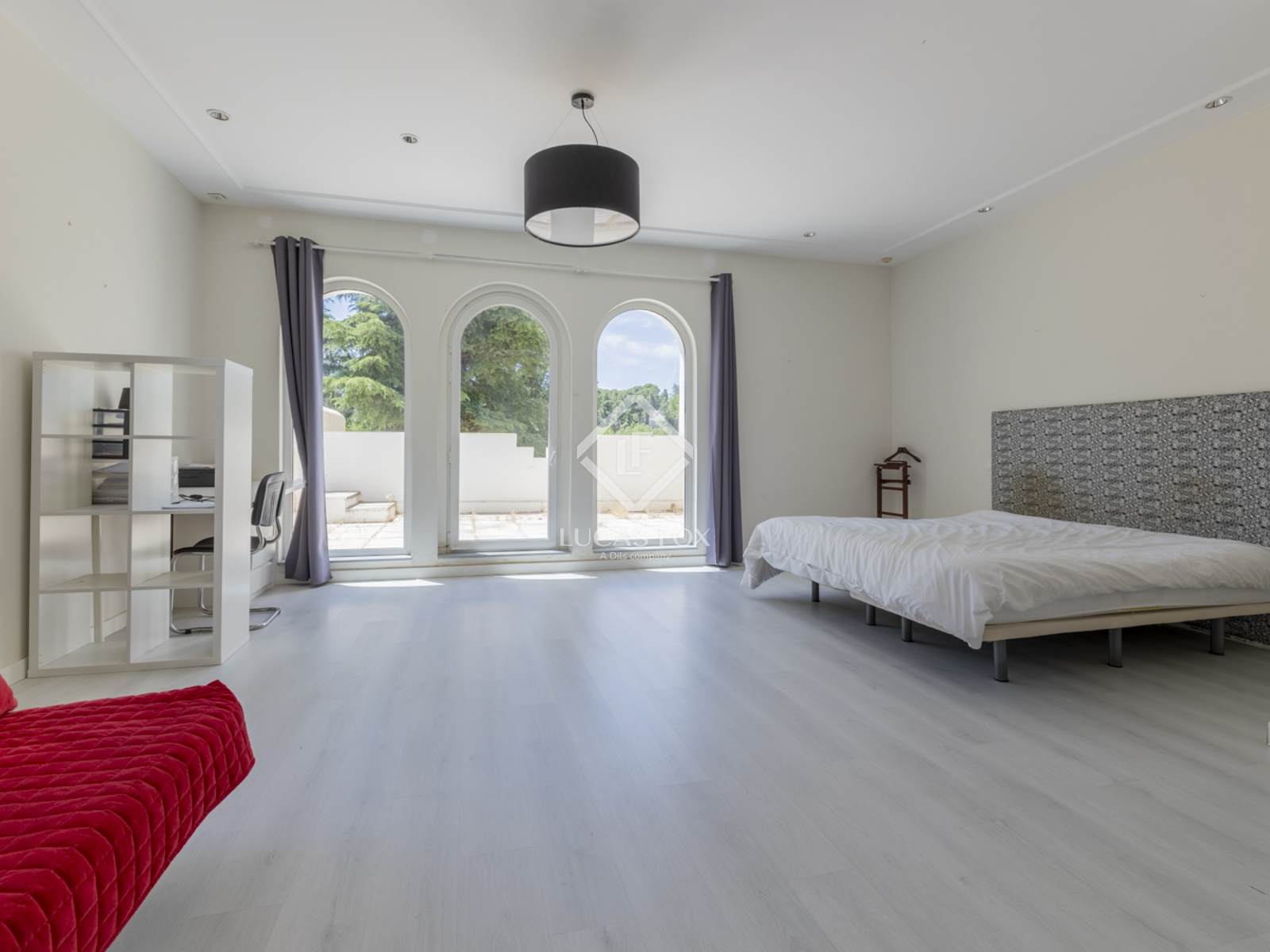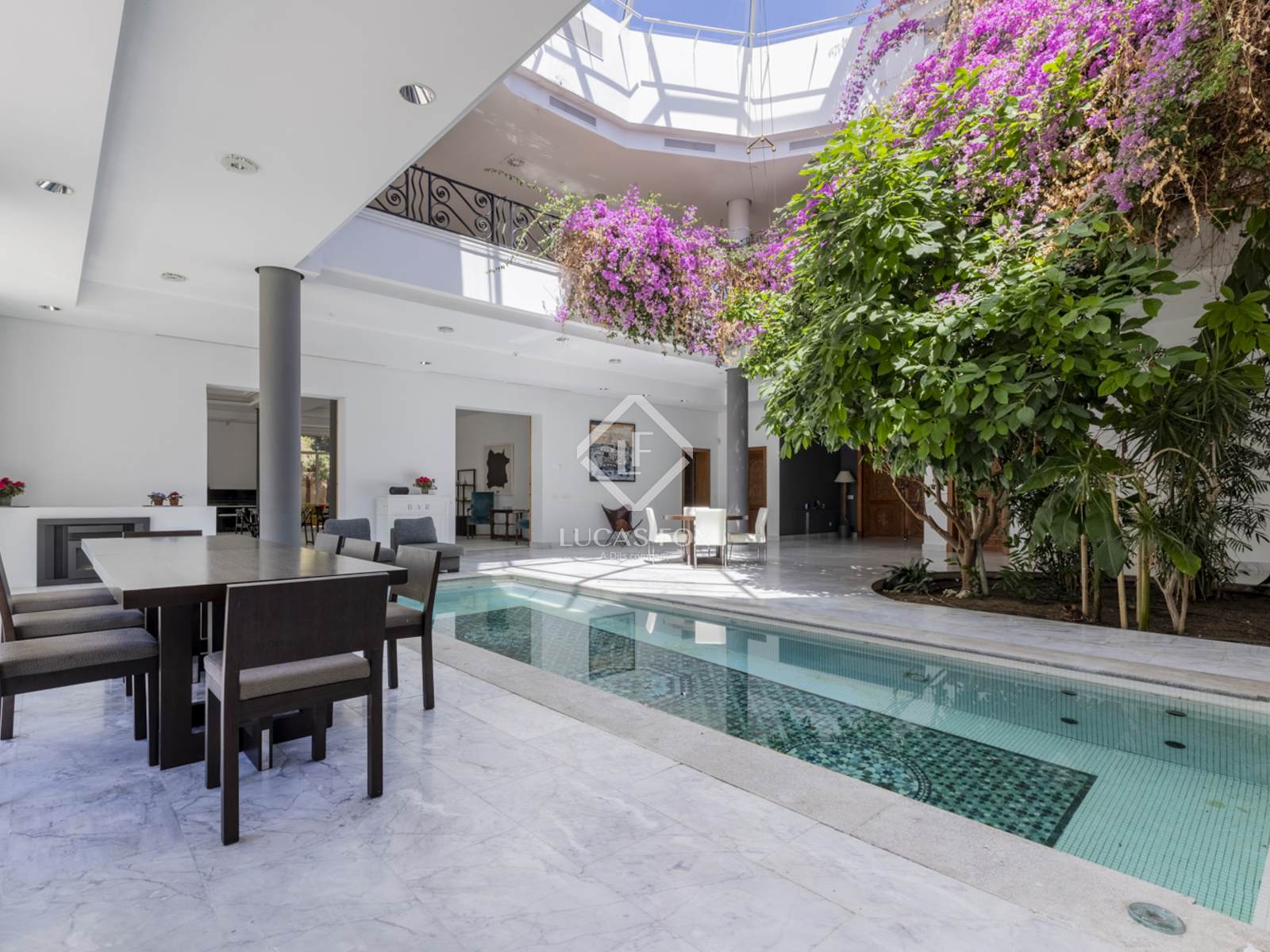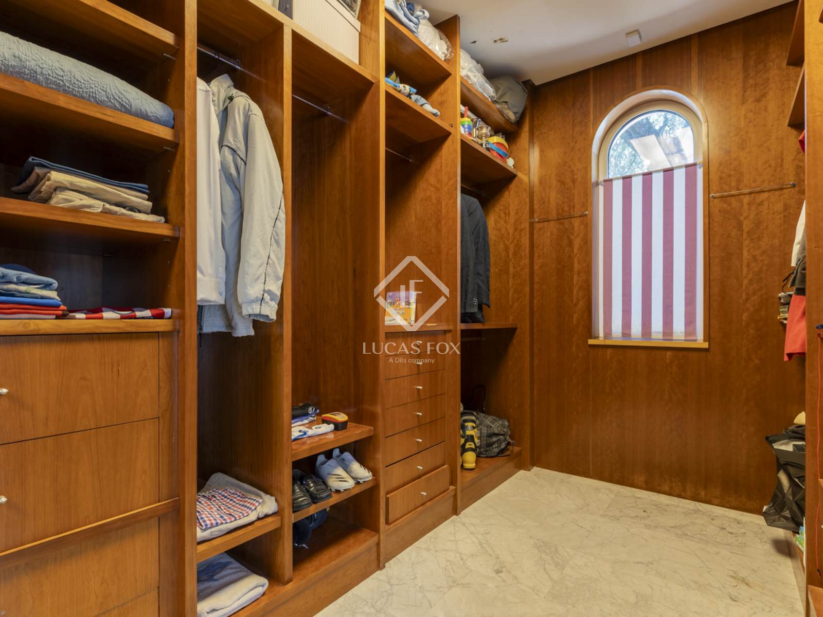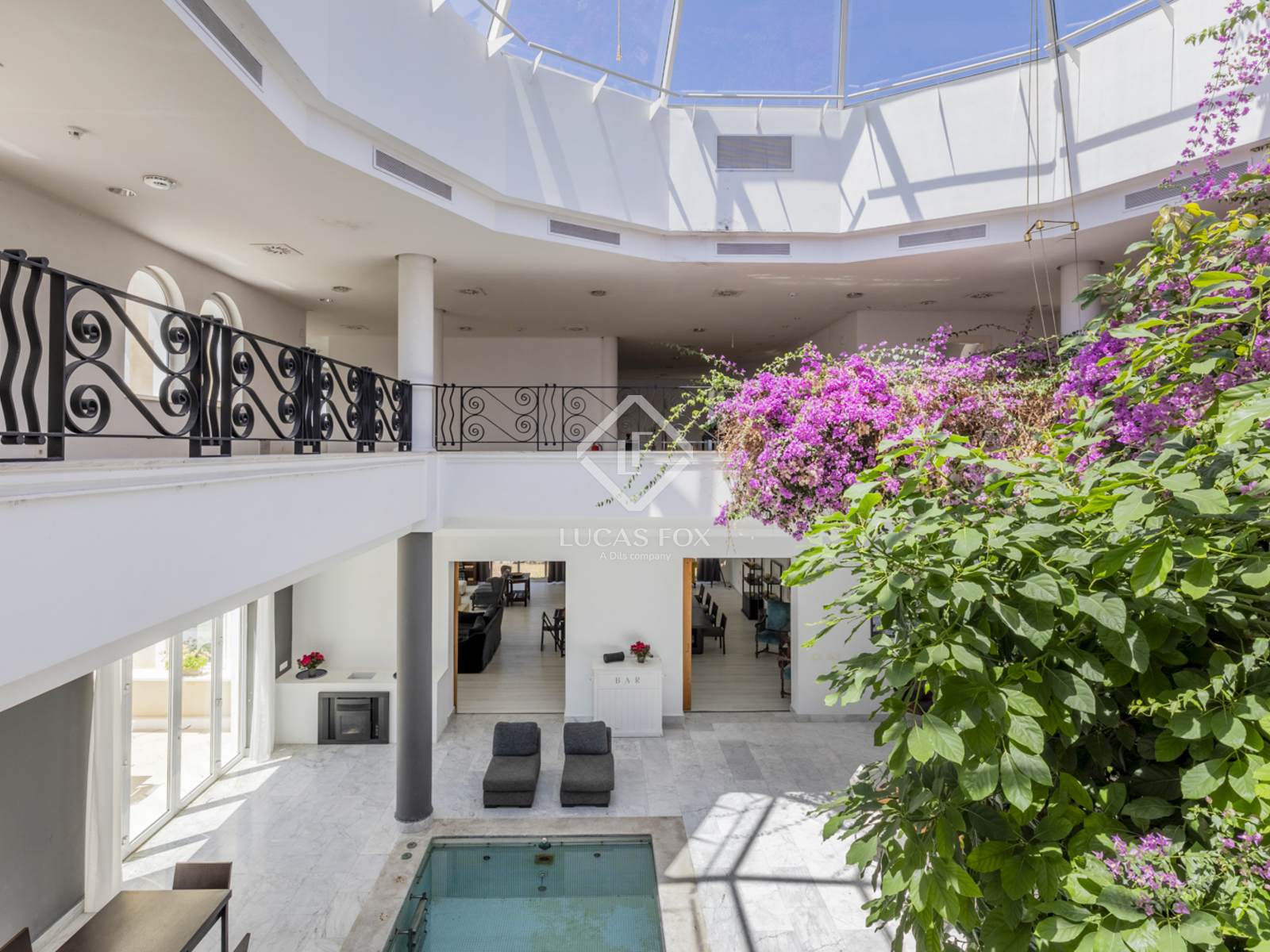 On the main floor , the property offers an elegant entrance hall with two guest toilets and a central hall that houses a heated indoor pool with Jacuzzi, under a spectacular glass dome that floods the space with overhead light. Doors with Moorish details add a touch of palatial grandeur. This level also includes a living room, dining room, kitchen and service area with a bedroom and bathroom, ironing area and laundry room. In addition, it has four large bedrooms, all with dressing rooms and en-suite bathroom , and a gym area connected to the main room, equipped with changing rooms, showers, sauna and Turkish bathroom . The large floor-to-ceiling windows ensure exceptional light in all rooms.