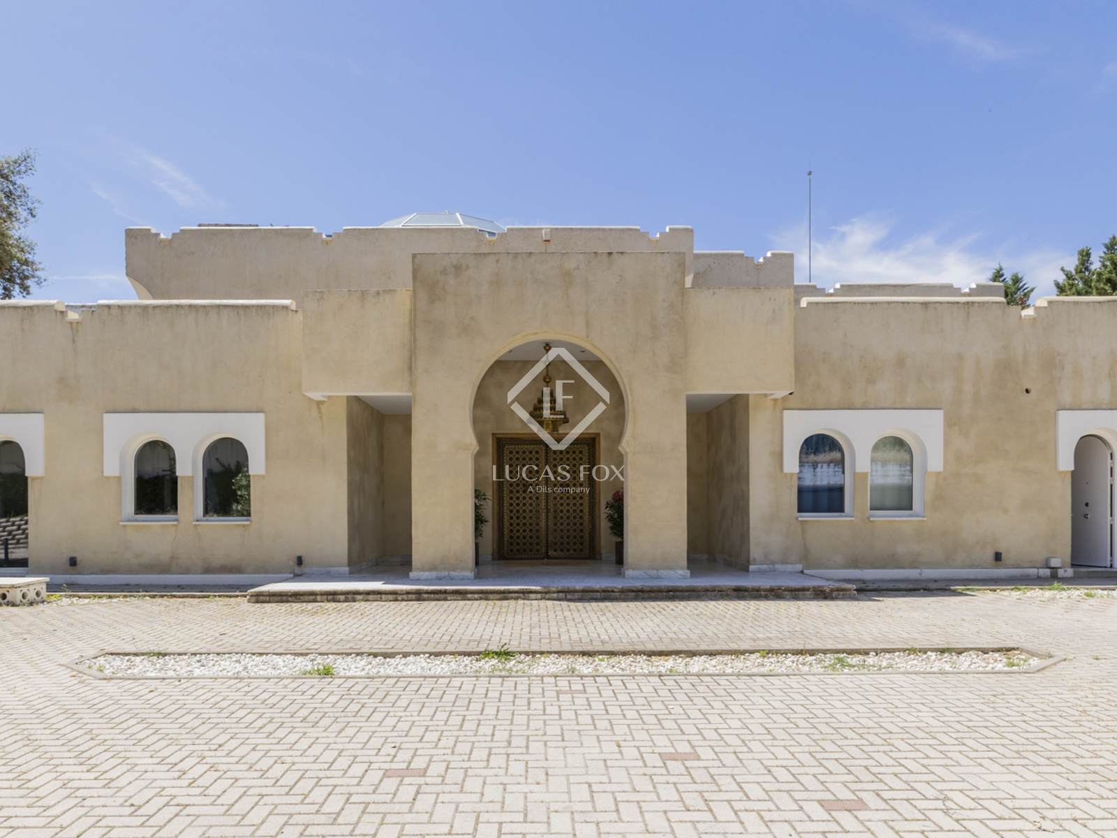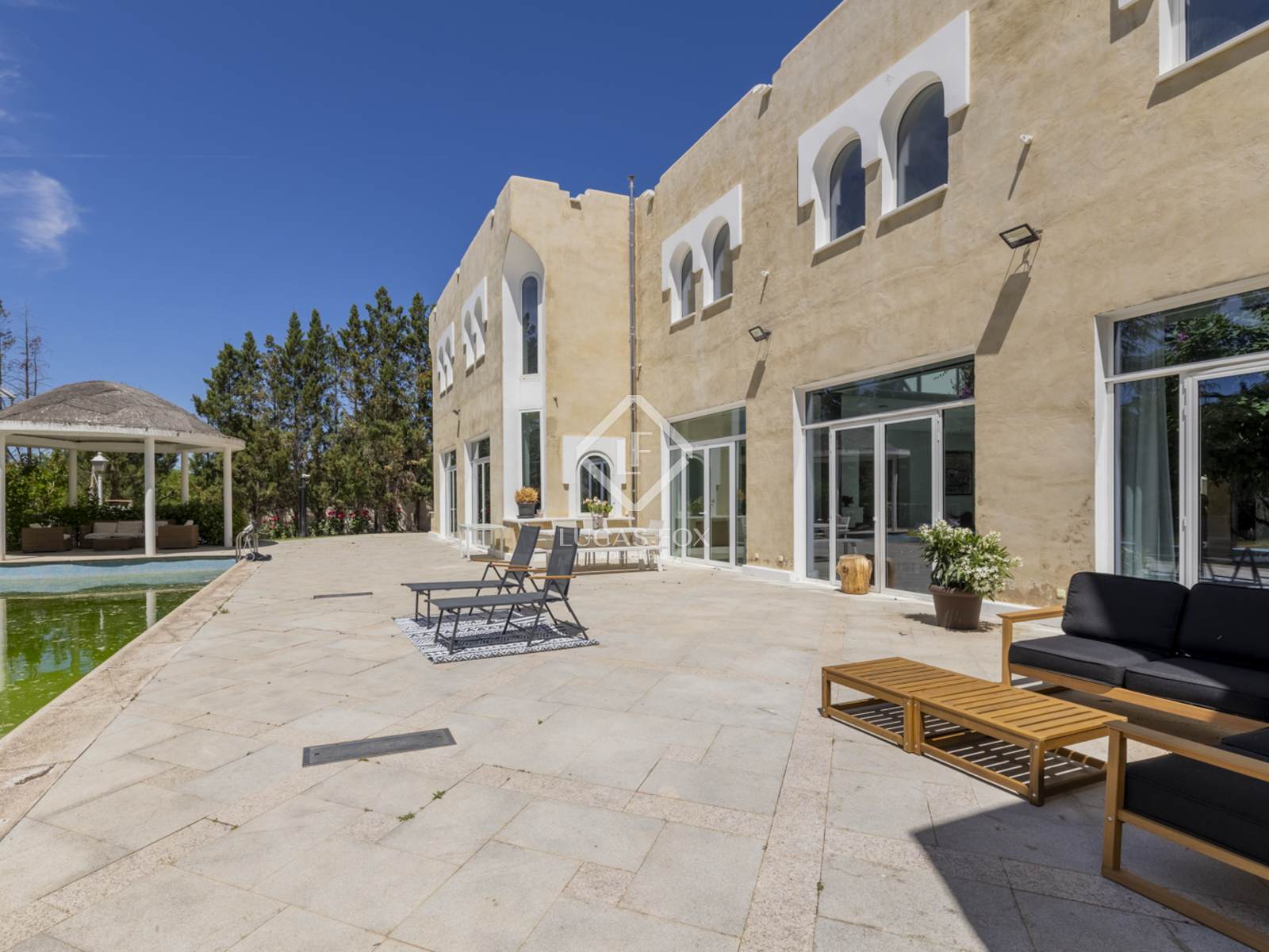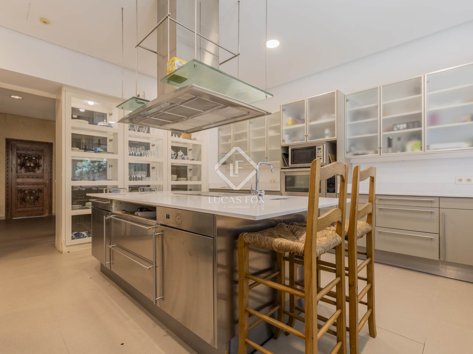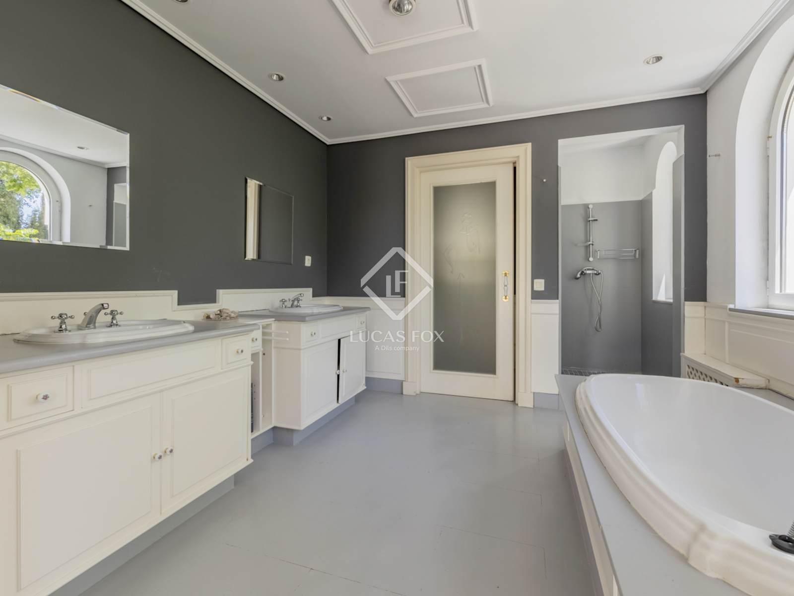 On the main floor , the property offers an elegant entrance hall with two guest toilets and a central hall that houses a heated indoor pool with Jacuzzi, under a spectacular glass dome that floods the space with overhead light. Doors with Moorish details add a touch of palatial grandeur. This level also includes a living room, dining room, kitchen and service area with a bedroom and bathroom, ironing area and laundry room. In addition, it has four large bedrooms, all with dressing rooms and en-suite bathroom , and a gym area connected to the main room, equipped with changing rooms, showers, sauna and Turkish bathroom . The large floor-to-ceiling windows ensure exceptional light in all rooms.
