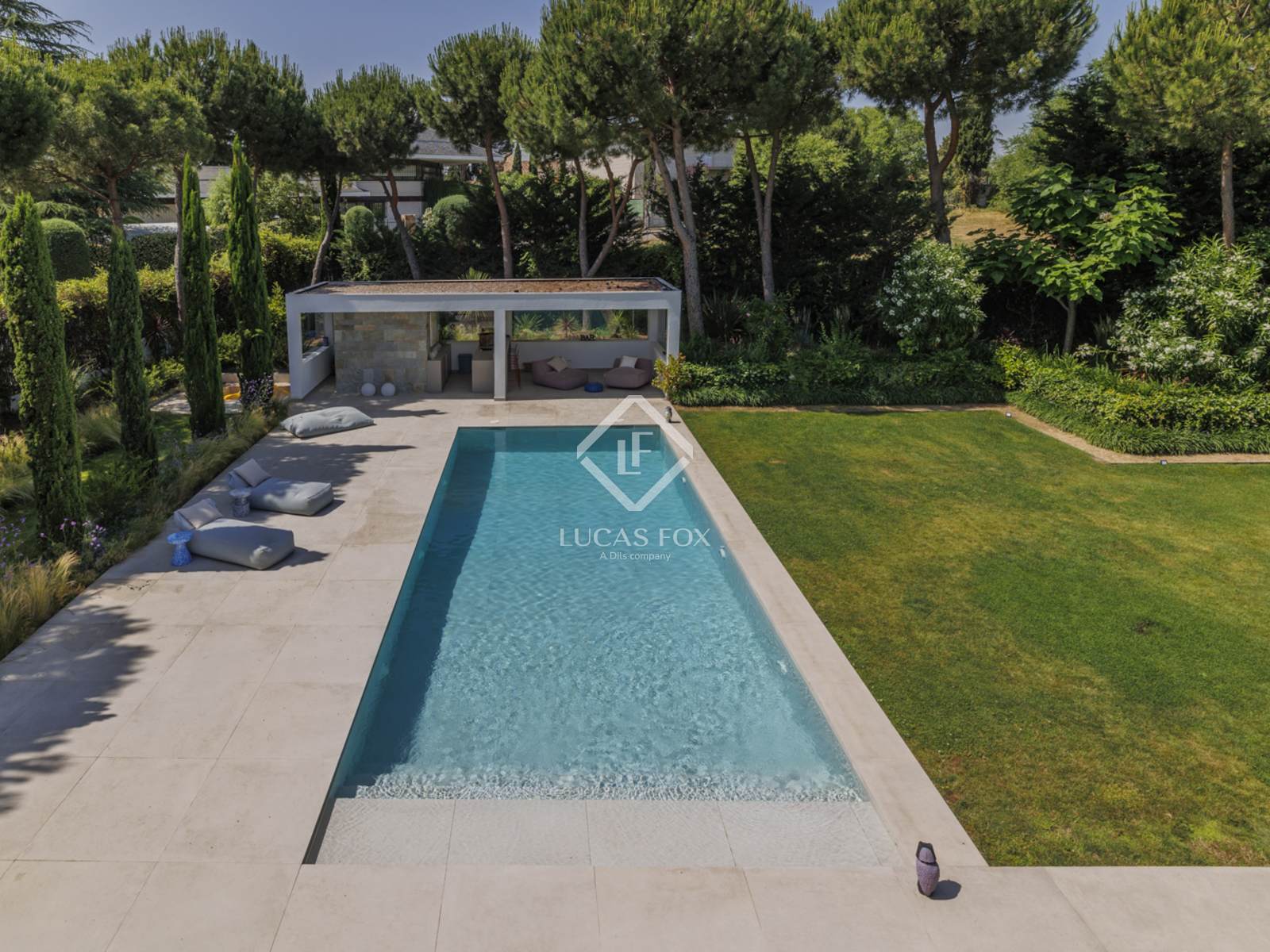 The home sits on a completely flat corner plot of over 3,000 m², offering complete privacy. The main house is complemented by two separate buildings: one adjacent to the property, ideal as a guest area or private study , and the other next to the pool, equipped with a gym and climate-controlled wine cellar .