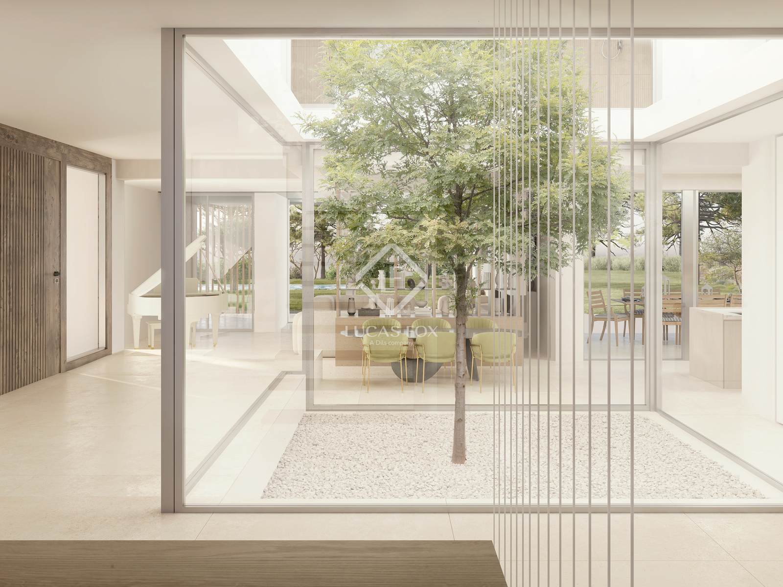 The property is accessed through an elegant entrance hall with a pivoting wooden door and fixed glazing, leading to the main social areas. First, there is the main living room , facing south, with access to the garden through large floor-to-ceiling windows. The open-plan kitchen is a functional and bright space with panoramic windows, direct access to the courtyard , and the possibility of a custom design according to the client's preferences. At the centre of the property is a glazed central courtyard, which provides access to the different areas: the service area, the leisure area, and the social area.