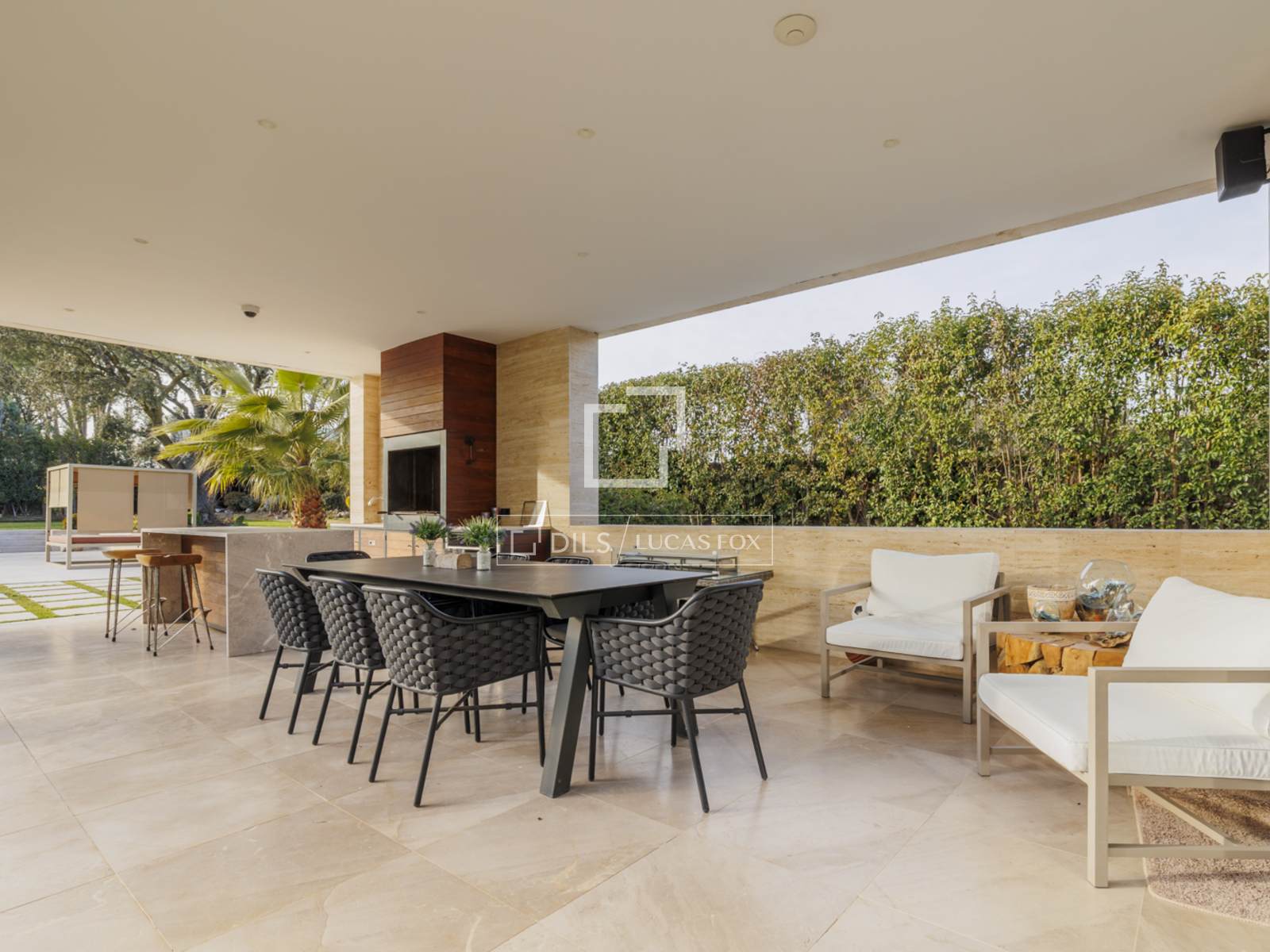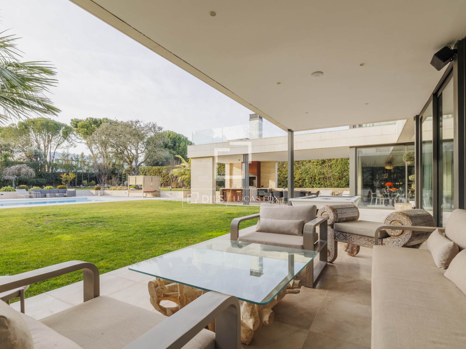 Outside, there is a huge, well-kept lawned garden. The living room porch provides a smooth transition between indoors and outdoors. The porch next to the pool, with a dining area and a fully equipped kitchen with a large grill, is perfect for enjoying gatherings with family and friends. Of course, we mustn't forget the spectacular pool with a beach area and solarium.
