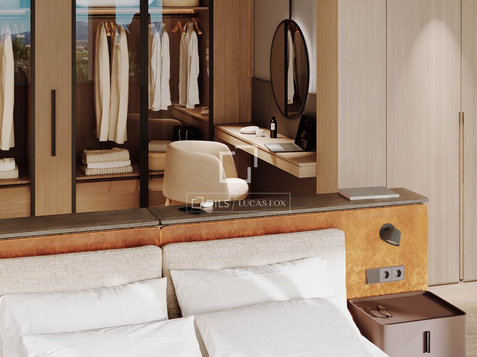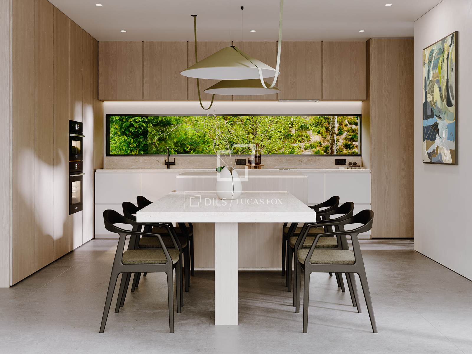 Inside, the interiors are defined by understated sophistication: bespoke wood cabinetry, natural stone surfaces, soft neutral tones and carefully curated design details throughout. The open-plan kitchen combines refined aesthetics with functionality, featuring high-quality finishes and a direct connection to outdoor terraces.
