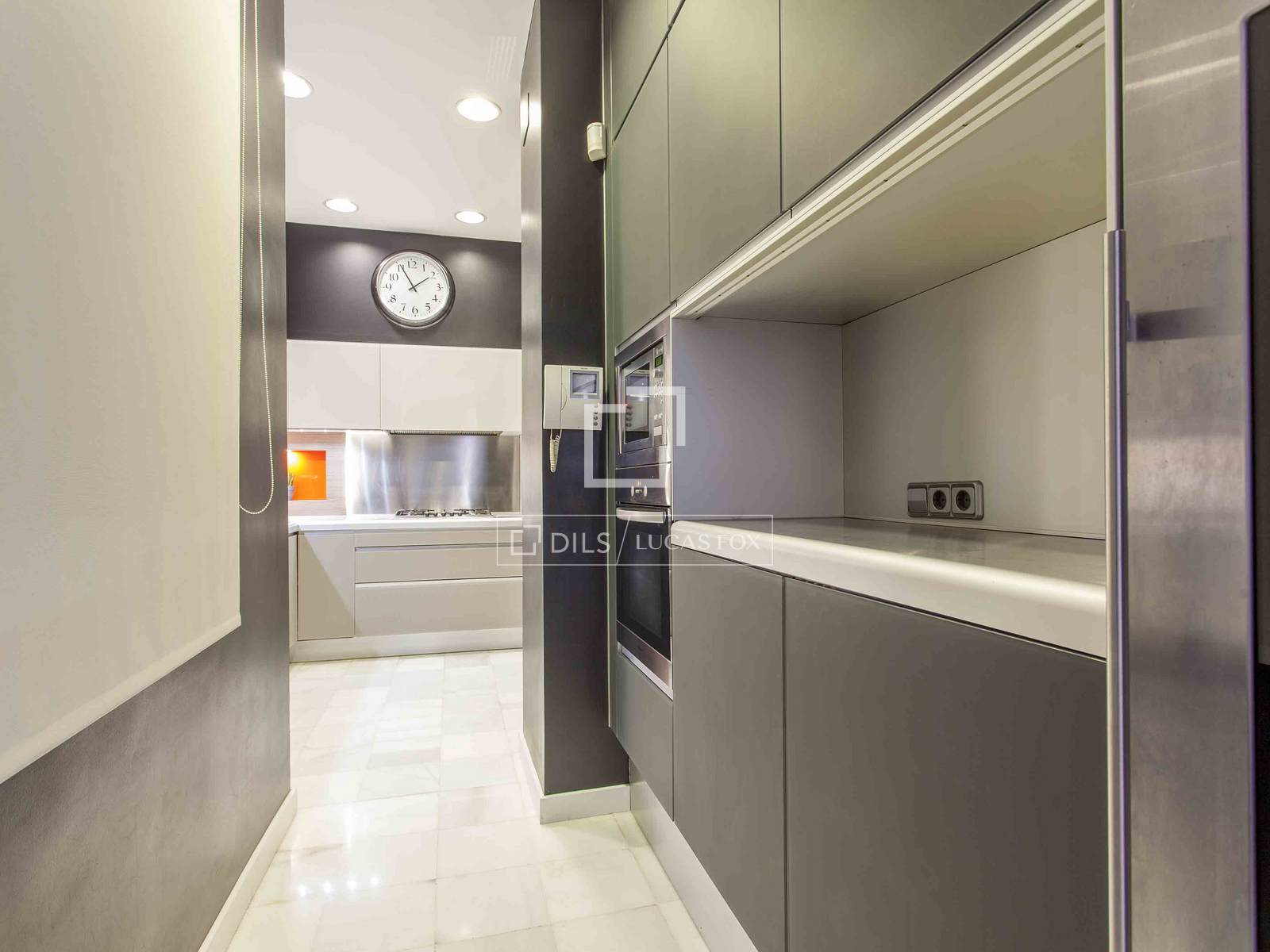 Upon entering the property, a spacious and welcoming hall leads to an impressive living-dining room divided into three distinct areas, furnished with designer pieces and designed for both everyday enjoyment and social gatherings. Its three large windows offer views of some of the neighbourhood's most iconic streets, flooding the space with natural light throughout the day. The modern, fully equipped kitchen, featuring high-end appliances —wine cooler, oven, microwave, dishwasher, and refrigerator—has two access, adding functionality and versatility to the layout.