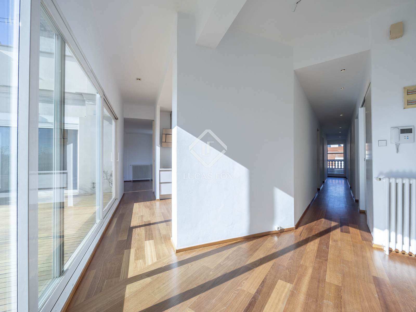 The day area consists of a large, open-plan living-dining room , which receives abundant natural light and is directly connected to an impressive 33 m² east-facing terrace. This terrace, which also leads to the kitchen and one of the bedrooms, is ideal for enjoying sunny breakfasts, al fresco meals, or cozy evenings. The property also includes a separate kitchen with all appliances, with direct access to the terrace. The layout is completed with a second bathroom.