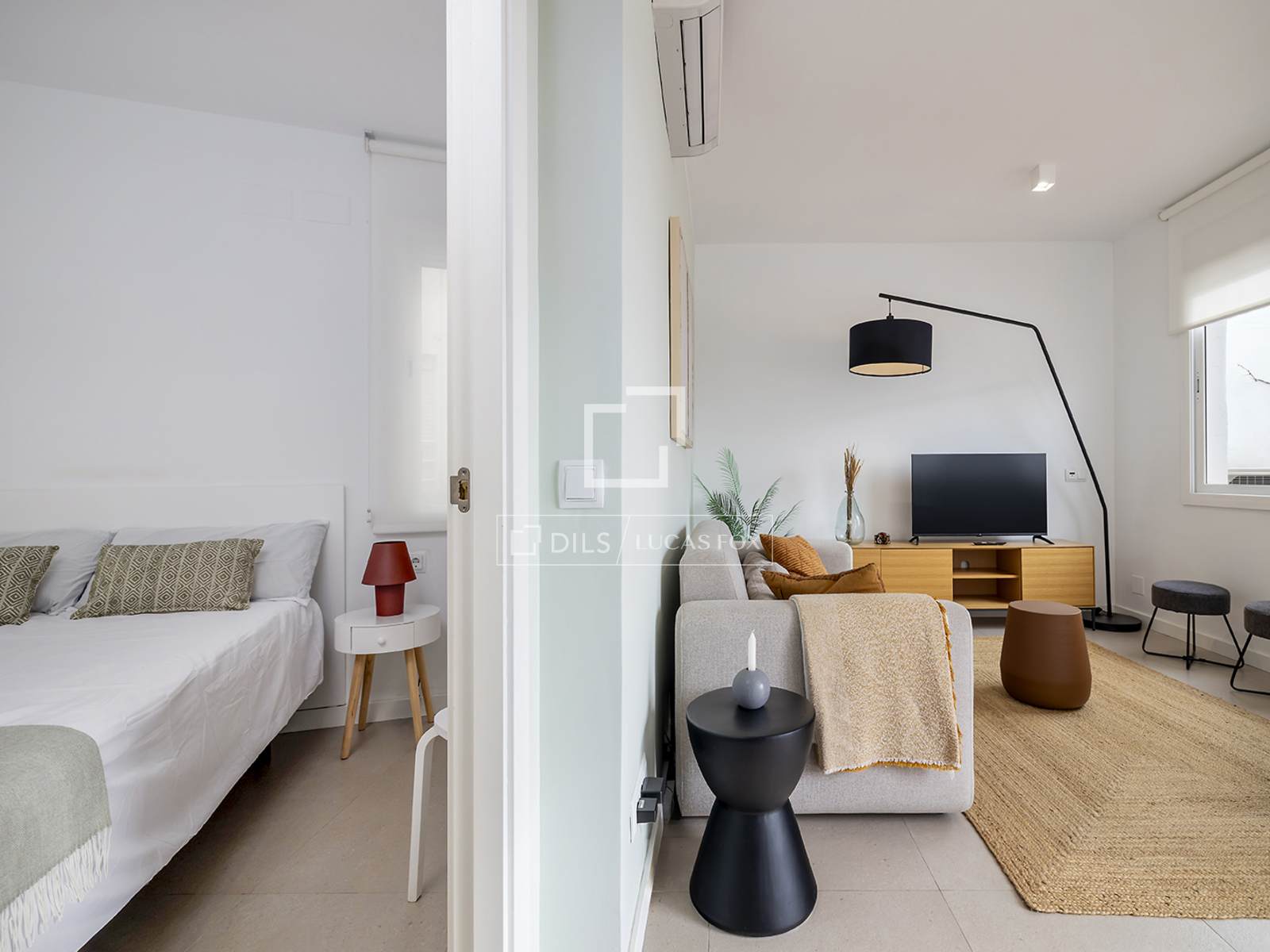 The apartment is distributed into two bedrooms and two bathrooms, one of them en suite, and is presented fully furnished, with a careful contemporary aesthetic and neutral materials that provide warmth and comfort.
