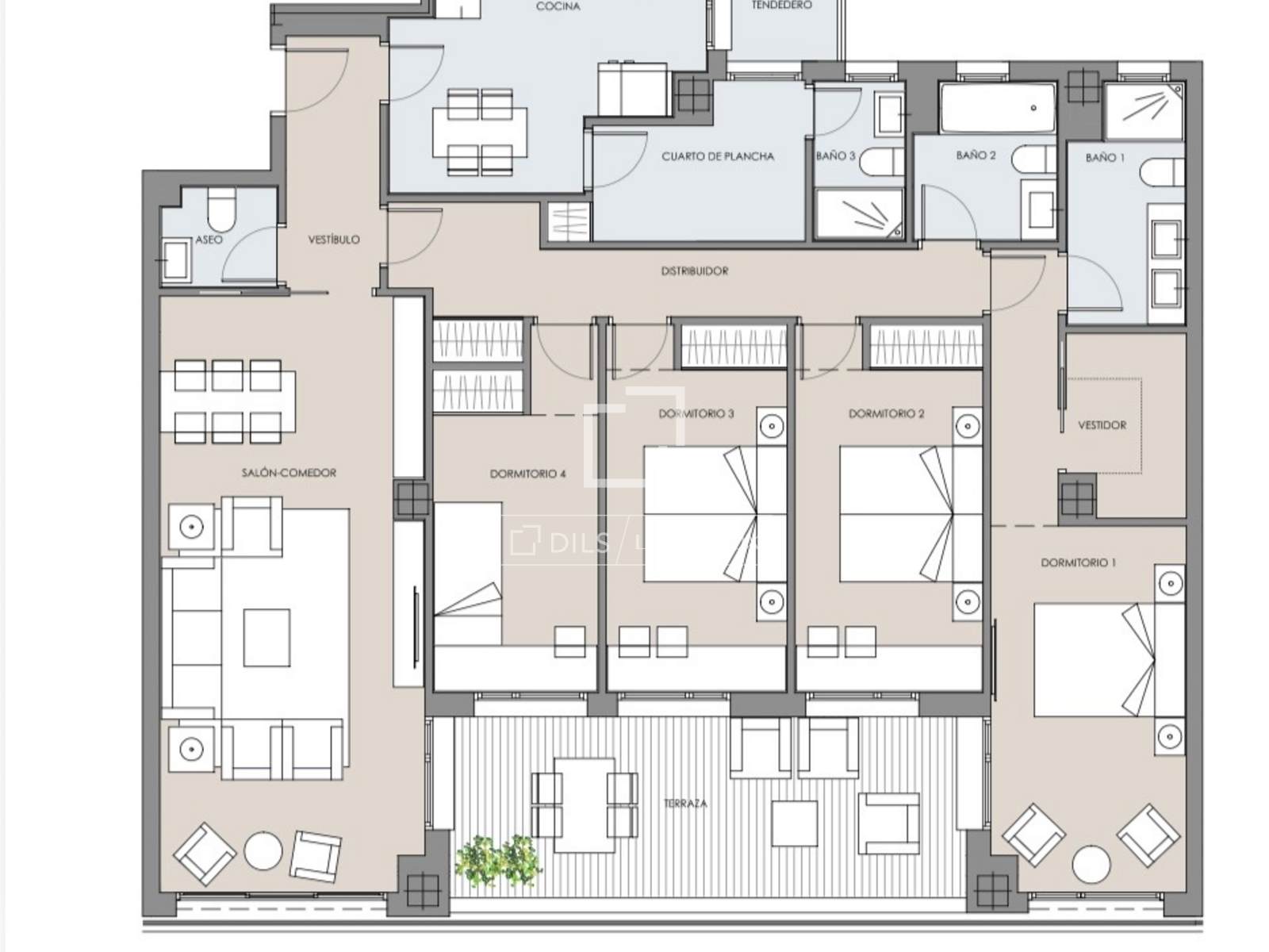 The corridor leads to the night area, which is separate from the day area for greater privacy and tranquility. Here we find the spacious main bedroom, complete with its own en-private bathroom and dressing room, all boasting the best views of the city. Next, we find three double bedrooms, each with built-in wardrobes , and a shared bathroom .