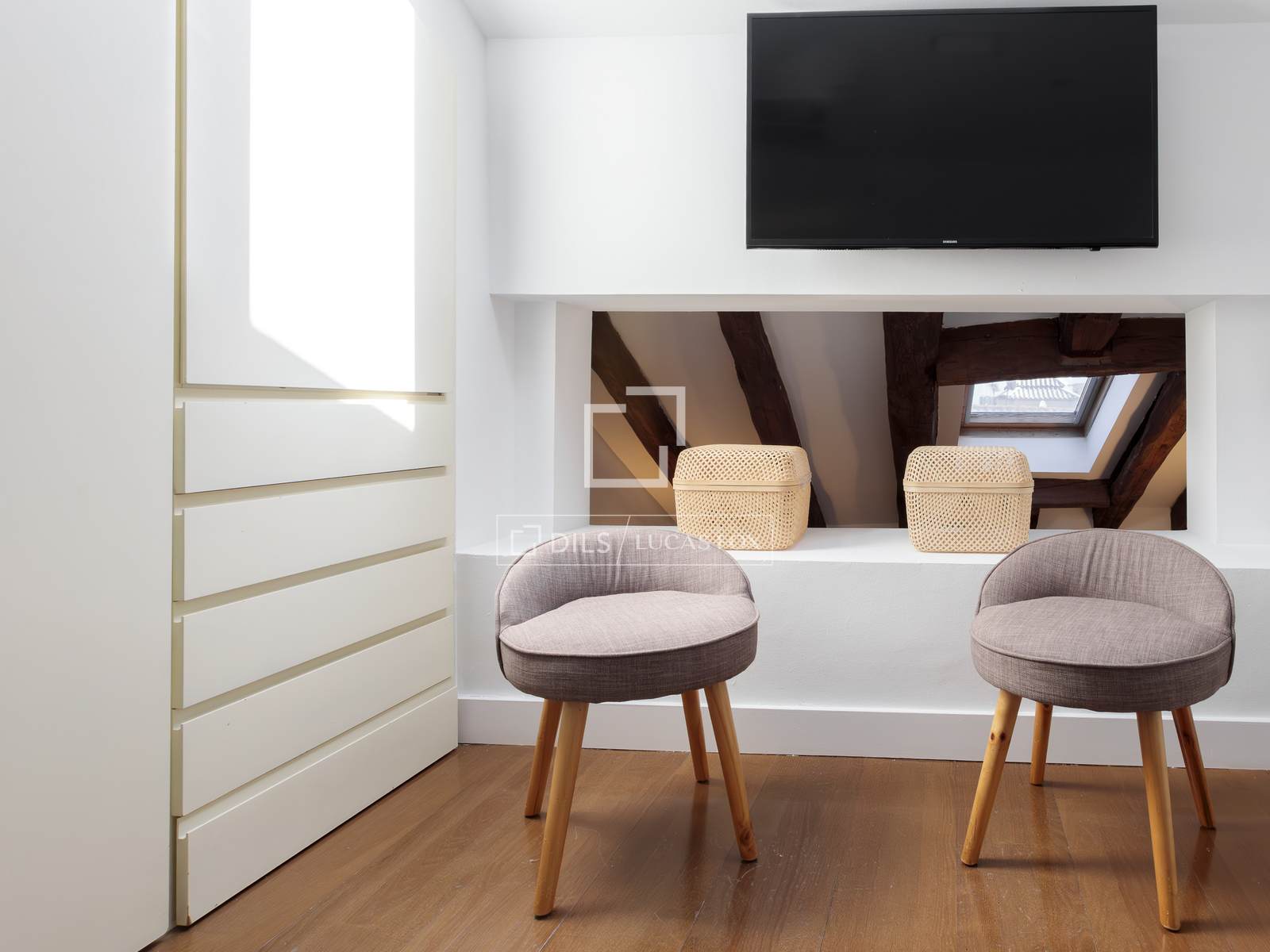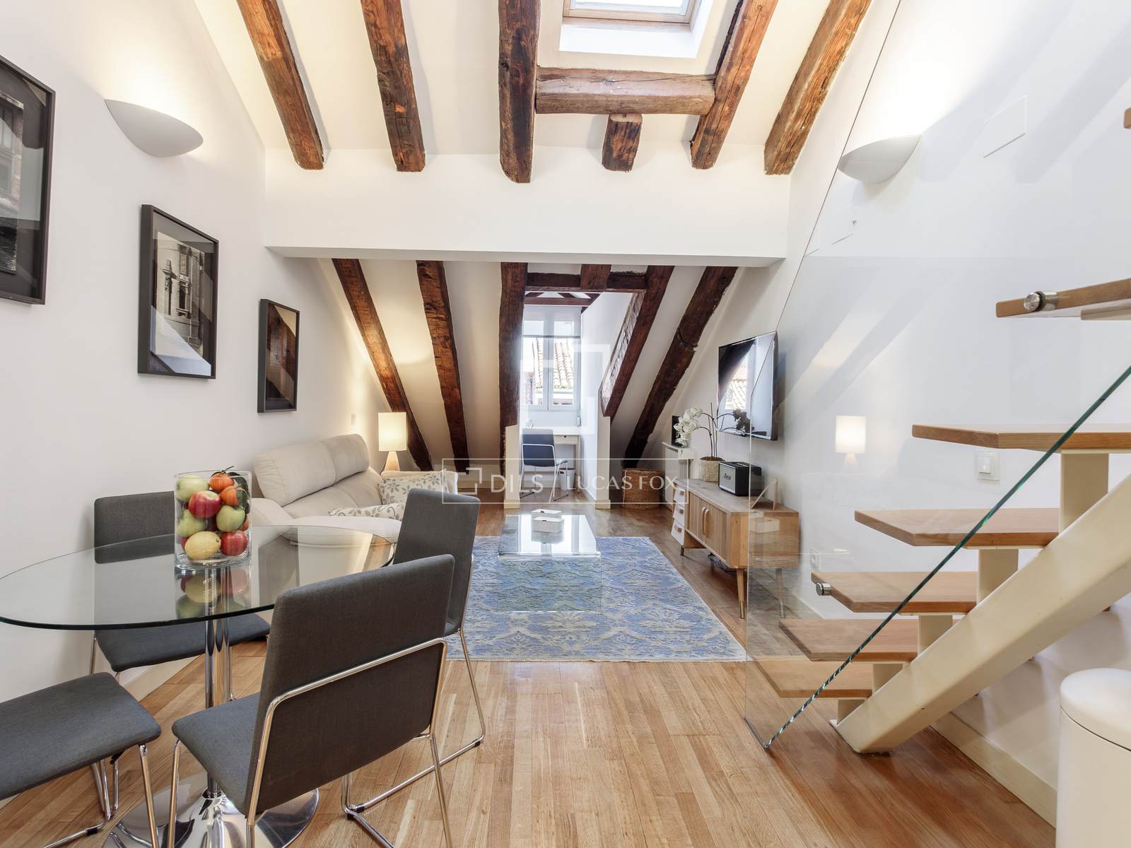Dils Lucas Fox presents this exclusive duplex apartment for rent , located in one of Madrid's most sought-after areas , in the heart of the Cortes neighbourhood , right in the city centre . The property stands out for its meticulous renovation, modern design, and exceptional natural light throughout the day.