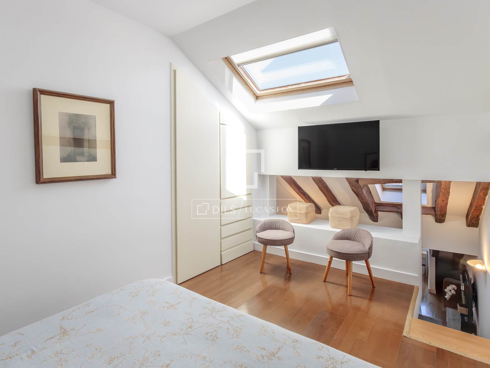 The staircase leads to the upper floor , which houses the night area. Thanks to its location, it offers great privacy. It has a bedroom with built-in wardrobes.