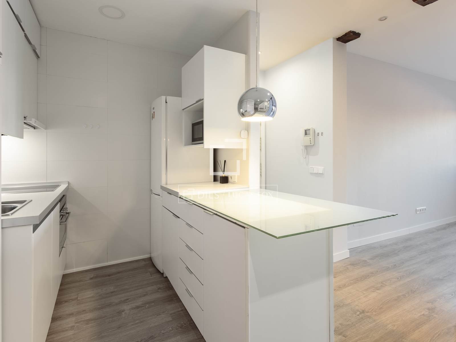 The modern, fully equipped American-style kitchen, featuring high-end appliances , seamlessly integrates with the living area, creating an open-plan, bright, and inviting space. This layout is ideal for both everyday use and entertaining, providing a sense of spaciousness and flow. The living room/ dining room area also boasts an outdoor terrace, which not only floods the property with natural light but also reinforces its exclusive and urban character.