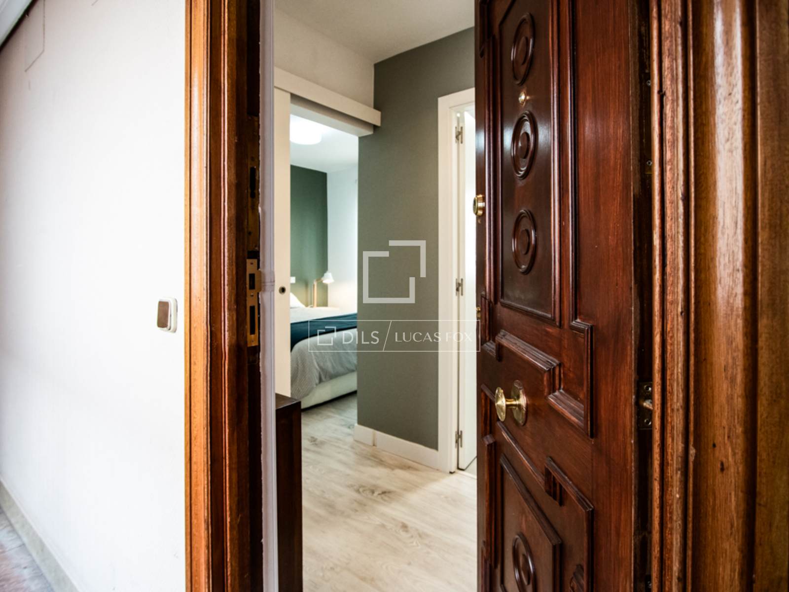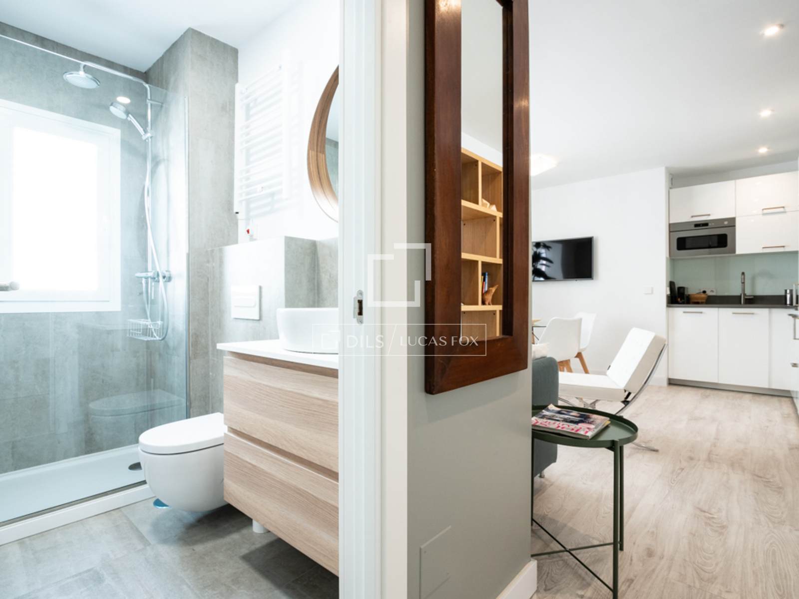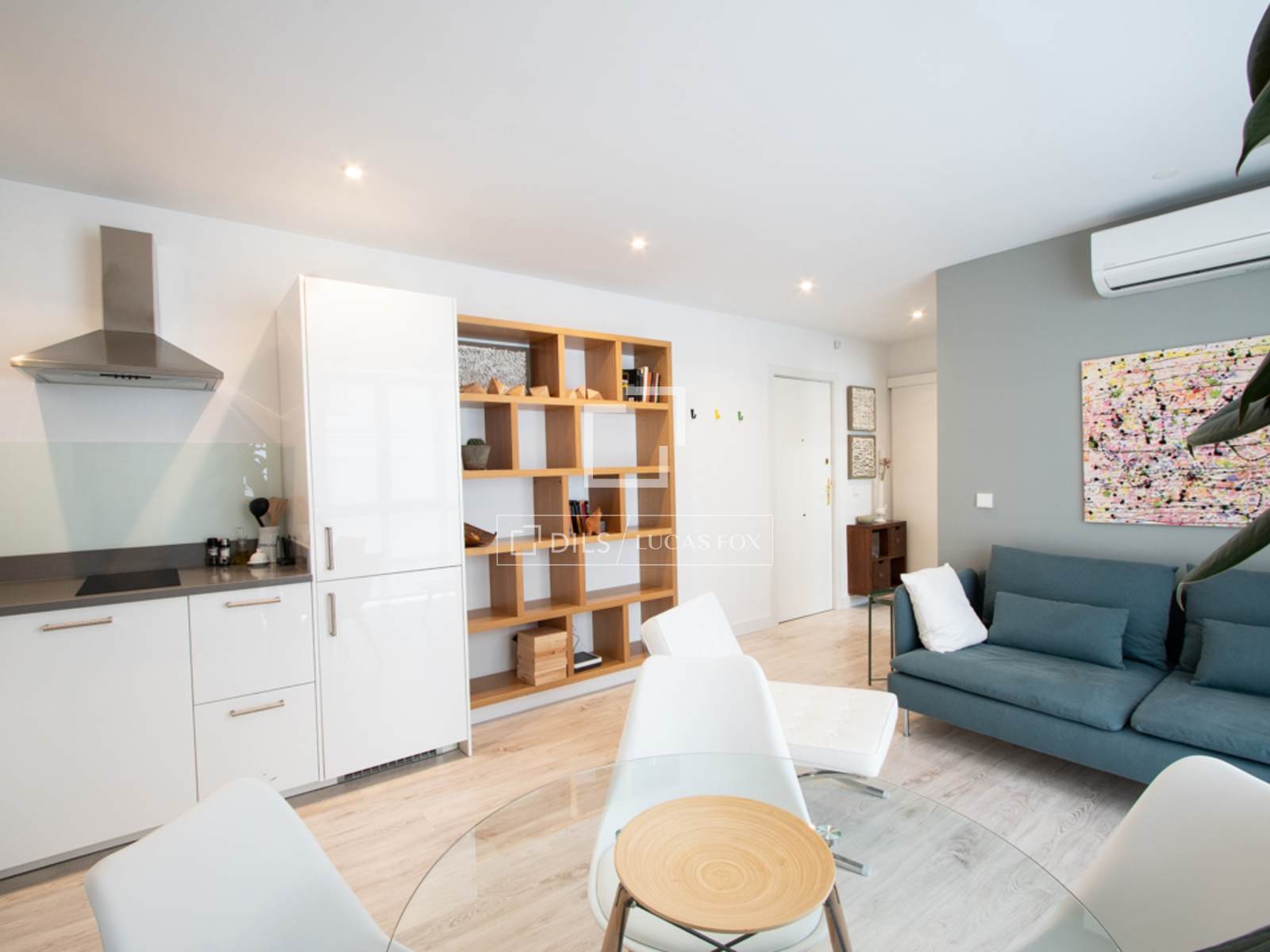 This beautiful and practical apartment is located on San Marcos Street, in the trendy Neighbourhood of Madrid. Its approximately 50 square meters comfortably accommodate a spacious living/ dining room room with an integrated modern kitchen, a bathroom , and a large bedroom with a balcony overlooking the street. It is decorated with a perfect combination of warm colors and modern furnishings, which, along with the natural light from its large windows facing the street, create a very welcoming atmosphere. Upon entering, you'll find an open-plan living room/ dining room area and a comfortable kitchen. The living room includes a three-seater sofa, a white Barcelona armchair, a centre table, and a floor lamp. This area features a large window overlooking San Marcos Street, providing ample light and a sense of spaciousness, complemented by a lovely decorative floor . The kitchen is fully equipped with all the necessary appliances for a comfortable room. The apartment has air conditioning in the living room and bedroom. The floor throughout the apartment is wood, except for the bathroom , which has tile. The bedroom is located opposite the living room/ dining room and features a comfortable double bed (1.60 x 2.00 m) with a fabric headboard, two bedside tables, a chair, and a charming balcony overlooking the street. The bathroom , decorated in beige tones, with a glass-enclosed shower , is located in the entrance lobby .