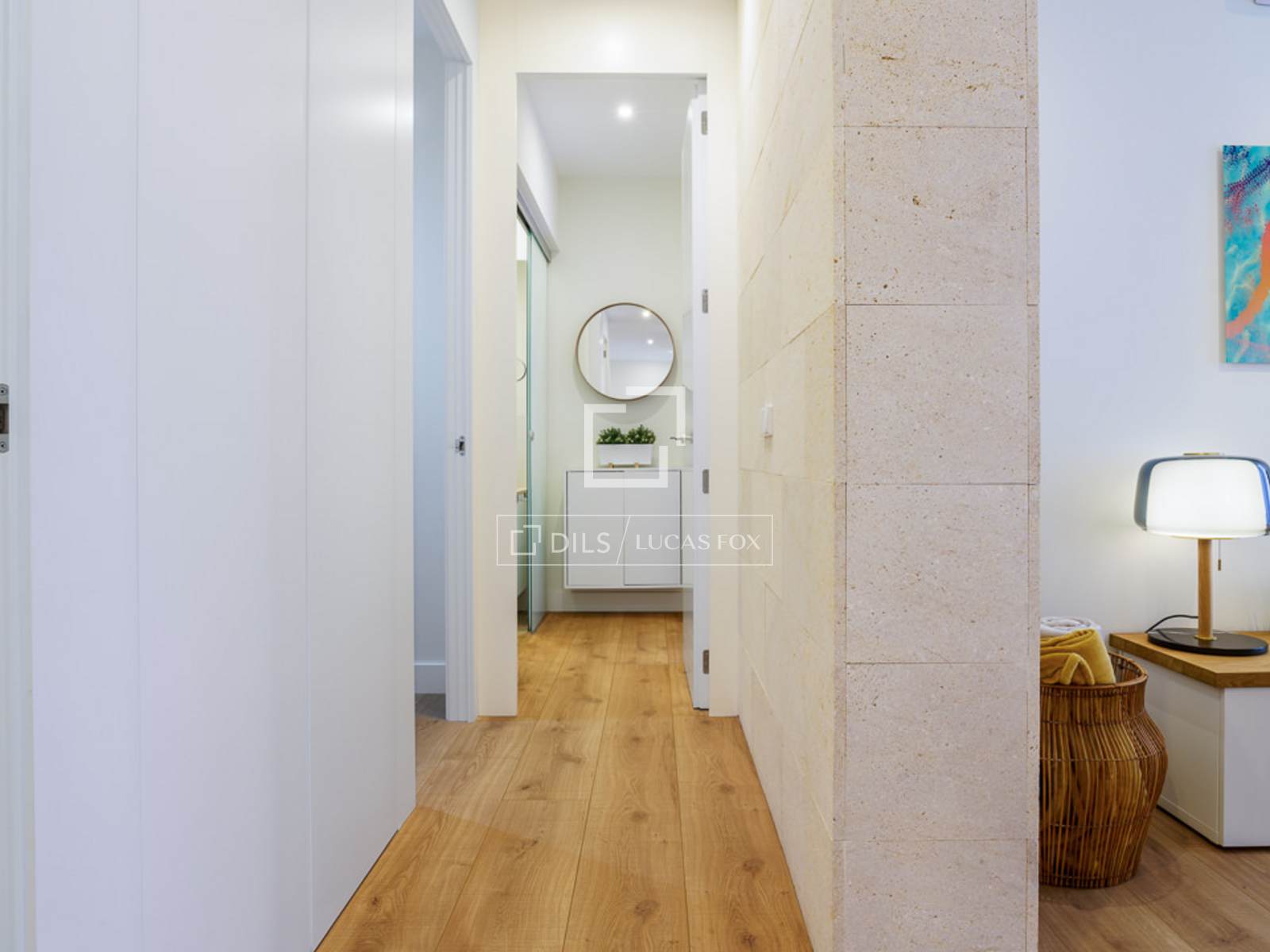 Upon entering, the open- floor kitchen is to the left, while the living room / dining room is straight ahead. Cream-colored stone-clad columns separate the kitchen from the living room/ dining room area, and a glass partition encloses a small rock garden , providing a sense of separation from the entrance. The living room features a large, white, six-seater sofa with decorative cushions, a rug, round wooden centre tables, and an armchair, all combining to create a very pleasant atmosphere. The dining room has a rectangular wooden table and six chairs. There is also a small wooden sideboard with hinged doors for storing dishes and decorative items. A column separates the two areas, housing a large, flat-screen Smart TV with an integrated sound system. The TV is movable on an arm, allowing for viewing from various angles. The American-style kitchen is L-shaped, all white with a stone countertop, and conceals all top-of-the-line appliances . It has ample storage space for a full complement of cookware and tableware for eight people. From this space, a corridor leads to the left with two doors and a white lacquered wardrobe . The first door opens into the second full bathroom, complete with a shower and glass enclosure. Next is a wardrobe containing the air conditioning unit and cleaning supplies. The third door opens into the second bedroom, which has a 1.50 x 2.00 meter double bed. This room includes a built-in wardrobe with two sliding doors, a comfortable white fabric chair, and a bedside table. The property has underfloor heating heating. All the floor is wood, except for the bathrooms, which are tiled. At the end of the corridor , a door leads to the master bedroom. Straight ahead is a white storage unit. To the left is a sliding glass door leading to the en-suite bathroom , with a shower and glass enclosure. To the right is the 1.80 x 2.00 meter bed with two white bedside tables and a gray fabric headboard. The room has two large windows overlooking the street with electric shutters. Opposite the bed is a wooden desk with a chair. Above this desk is a flat-screen Smart TV. The room has spacious built-in wardrobes with ample storage space.