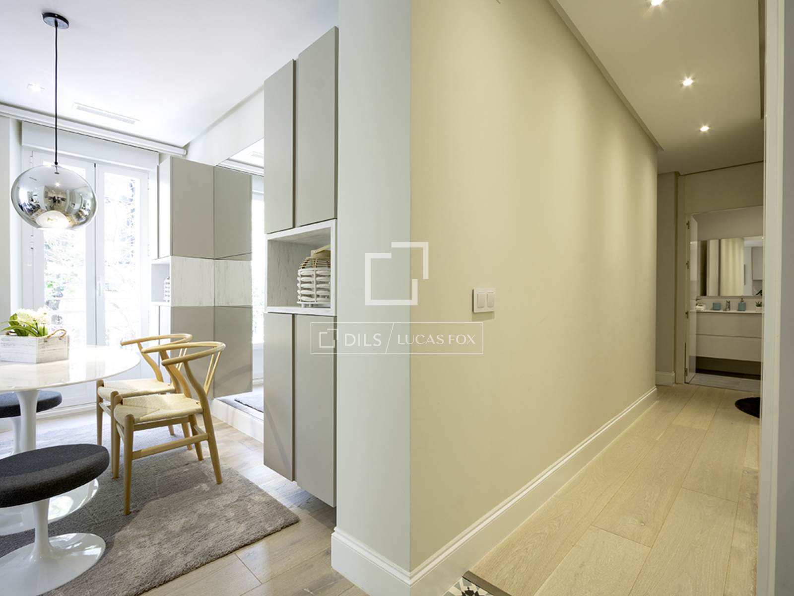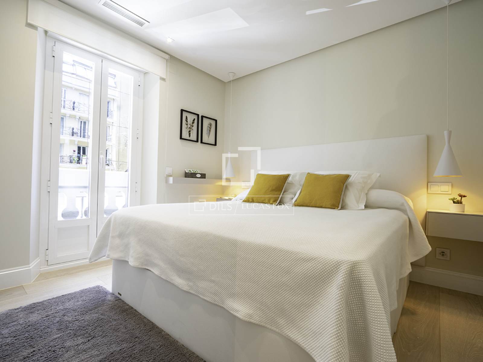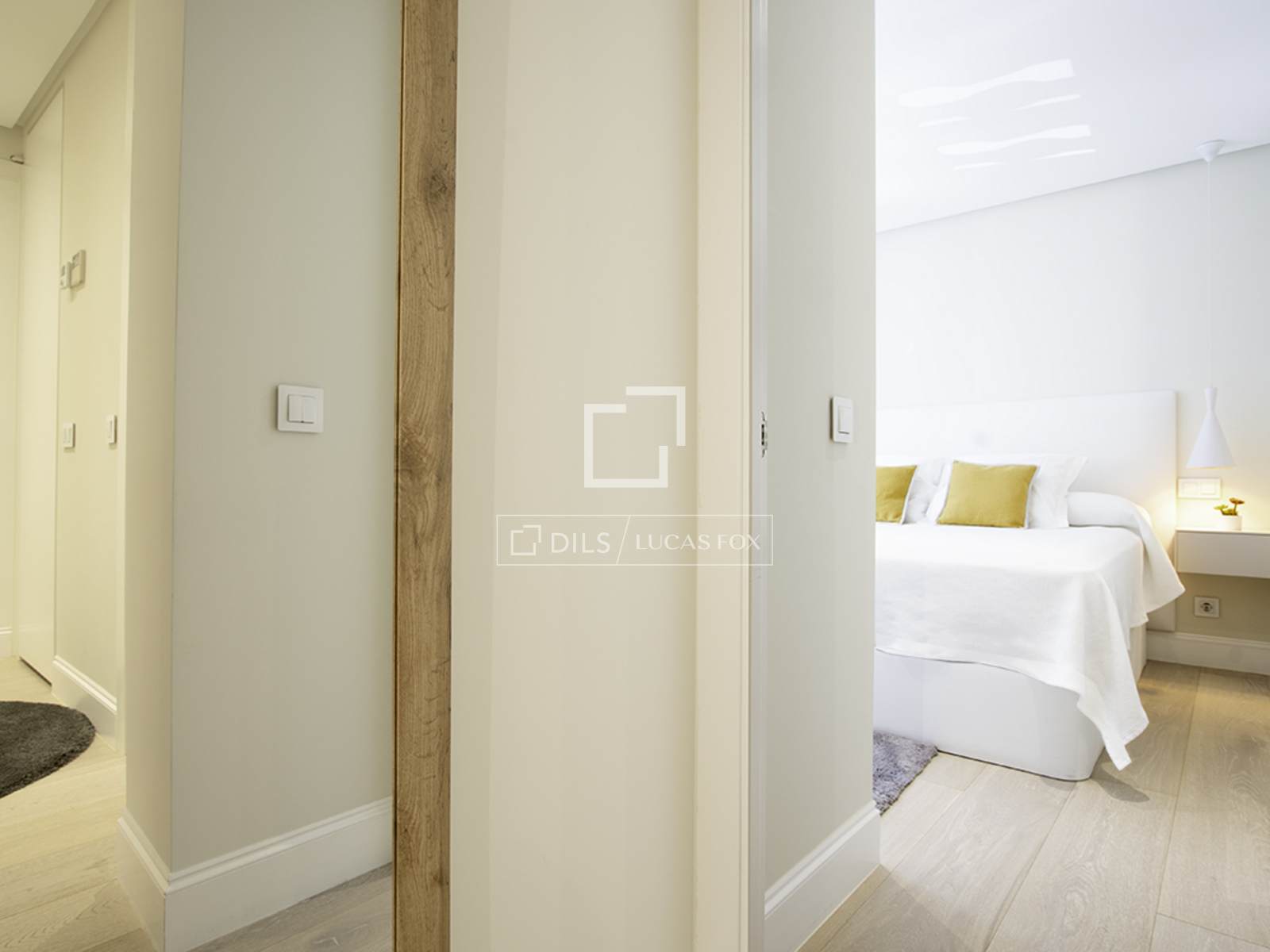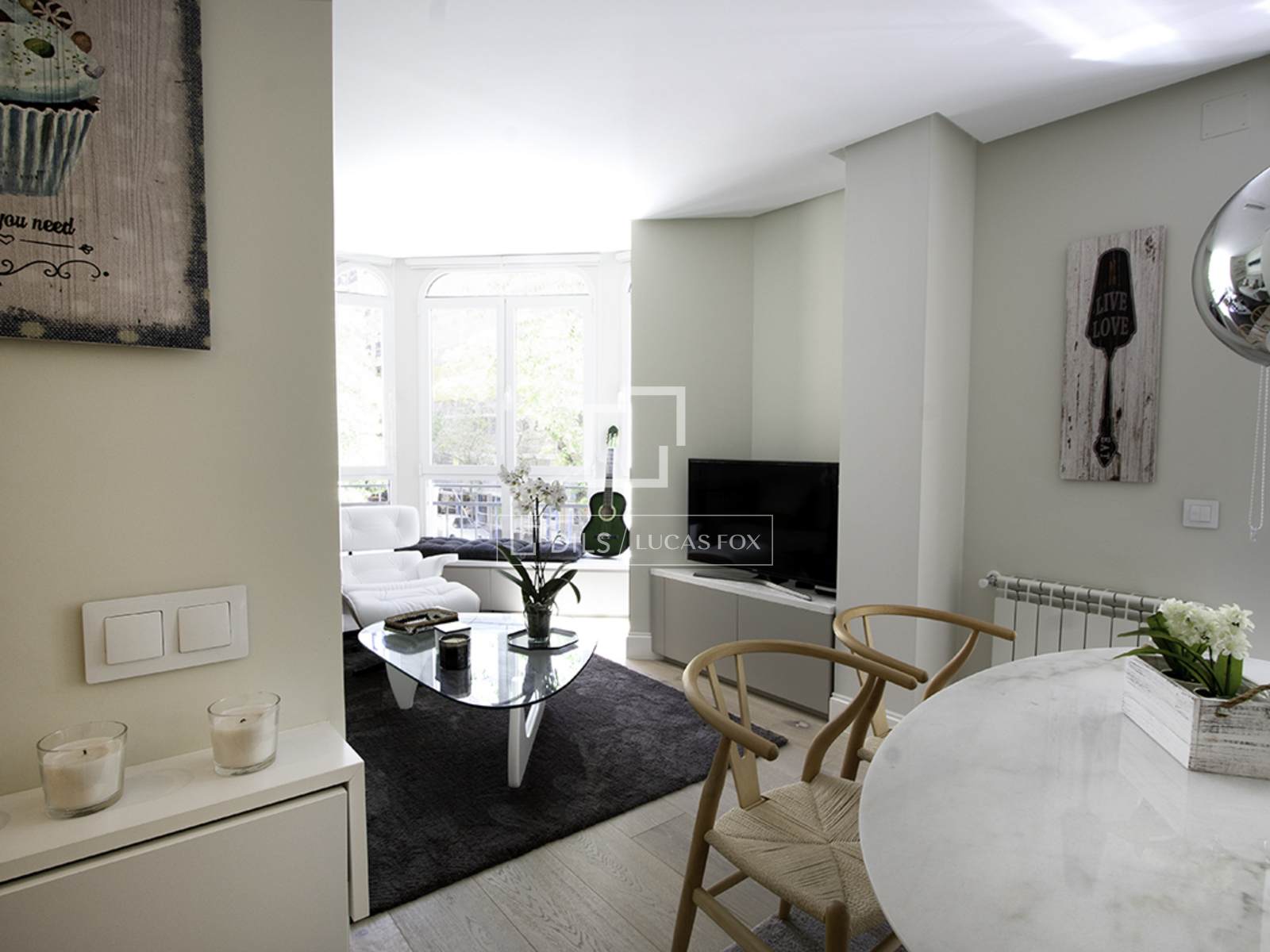 Completely renovated apartment located in the elegant and exclusive Salamanca neighbourhood , in the Lista area, one of Madrid's most sought-after neighborhoods. This area is characterized by elegant buildings with stately facades, tree-lined streets, and a selection of the city's finest restaurants, cafes, and shops. The apartment is situated on the first floor (second floor in US/ exterior) and features contemporary décor with soft tones, perfectly combining comfort and good taste with a very pleasant atmosphere. The interior is bathed in natural light thanks to large windows overlooking the street. The entrance lobby has a built-in wardrobe and leads to the social area on the left, and straight ahead to the two bedrooms. The apartment has an open-plan layout encompassing the living room/ dining room room and integrated kitchen. The living room features a comfortable and modern three-seater gray sofa, a beautiful designer armchair in white leather with an ottoman, a built-in bench with cushions by the window, a large glass centre table, and a large-format smart flat-screen TV. The dining room features an oval marble table for six with four woven chairs and two gray fabric benches, two large cabinets flanking a mirror that gives the area a spacious feel, and a mirrored ceiling light. It has a bay window/balcony overlooking the street. The kitchen has modern, built-in white cabinets and is fully equipped with all the appliances guests might need. Adjacent to the kitchen, in a separate room, is a small laundry area with a sink/washer/mop, separate washing machine and dryer, and cupboards. The main bedroom has a double bed (1.80 x 2.00m) with a cream fabric headboard and bedside tables, built-in wardrobes , and a wall-mounted smart flat-screen TV. It has a modern en-suite bathroom with a glass-enclosed shower. The second bedroom has two single beds (in a trundle bed) with ample built-in wardrobes. The second bathroom , located at the entrance of the apartment, has a shower with a glass enclosure. The entire apartment has wooden floor , except for the kitchen, which has tiles with an attractive geometric design, and the bathrooms, which have tile.
