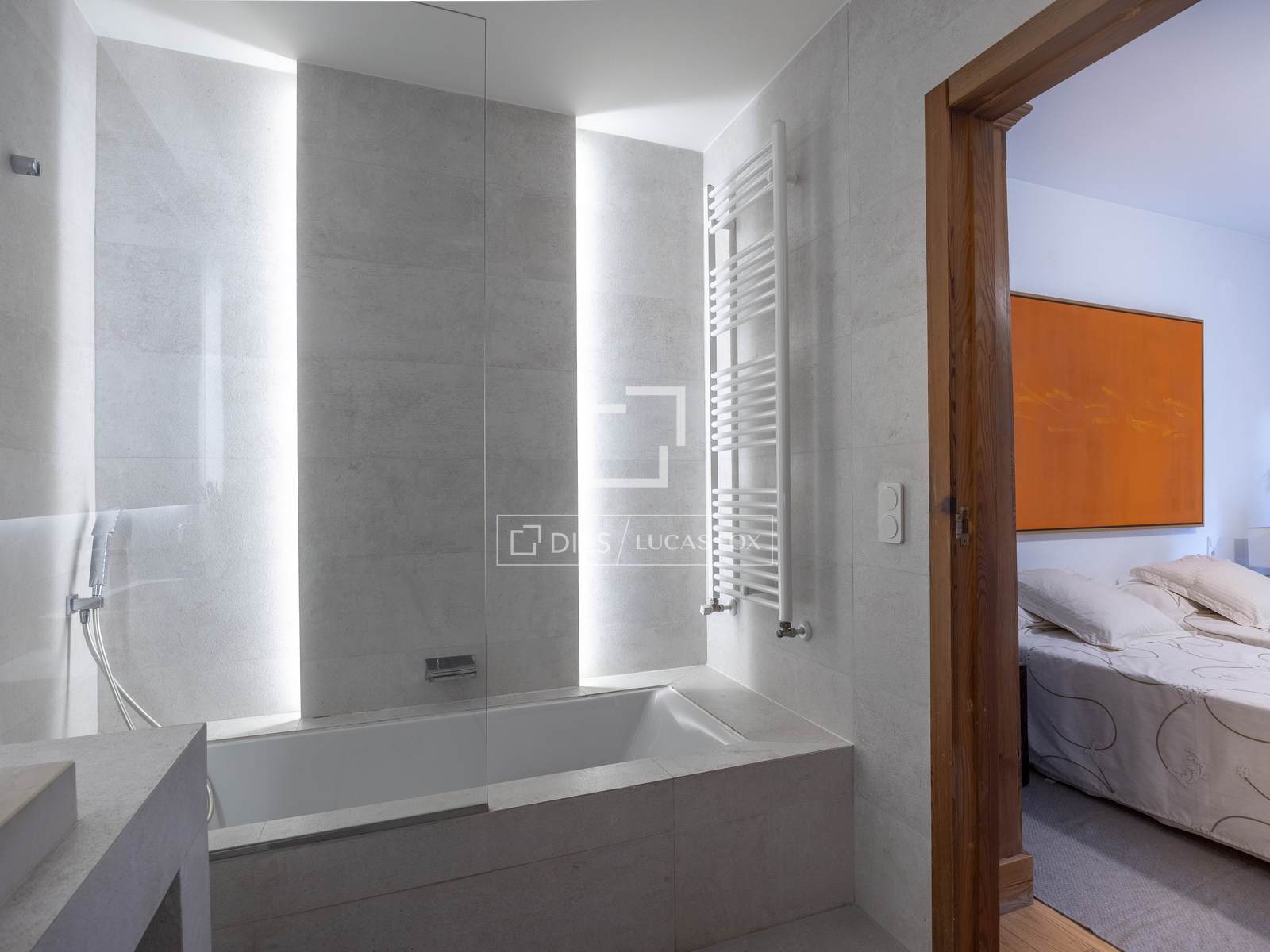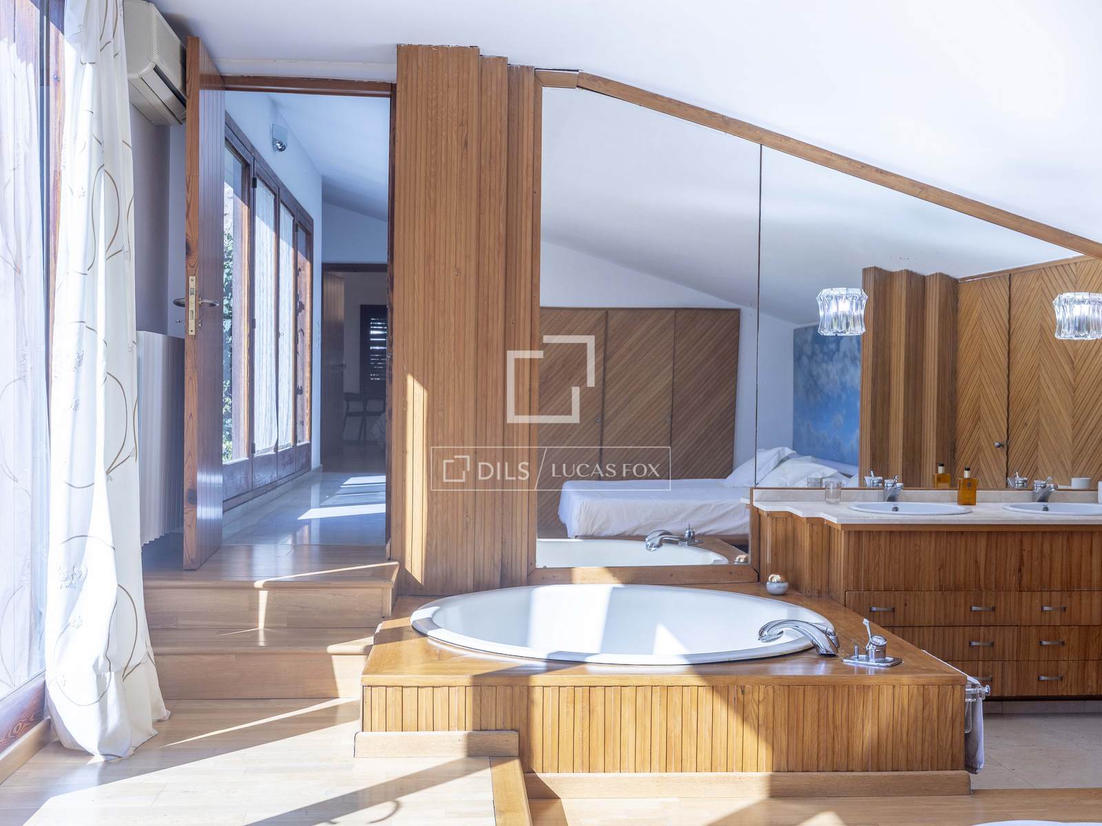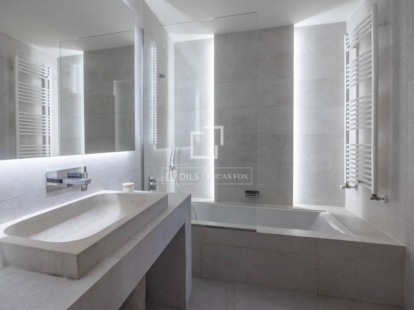 Stairs lead up to the first floor where we find the master bedroom with a bathroom with a luxurious bathtub. A further space on this floor can be adapted according to your requirements, should that be as a living room, gym, office or additional bedroom.