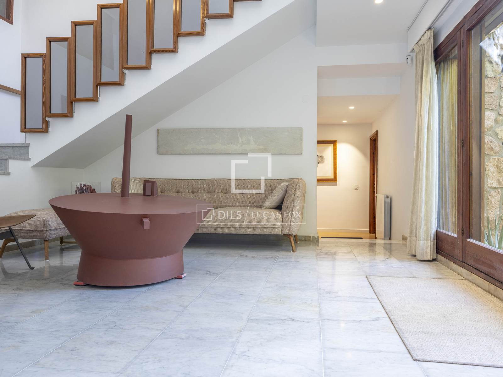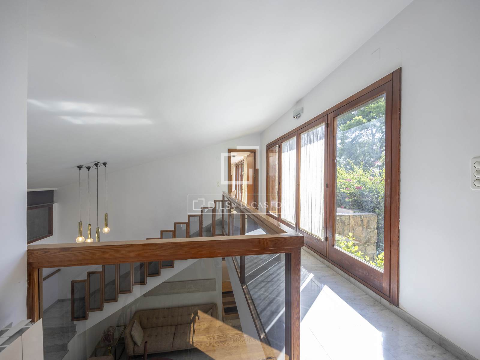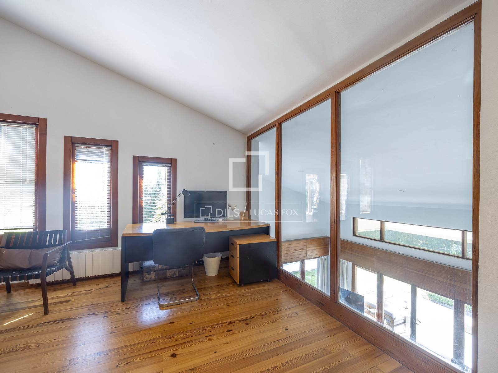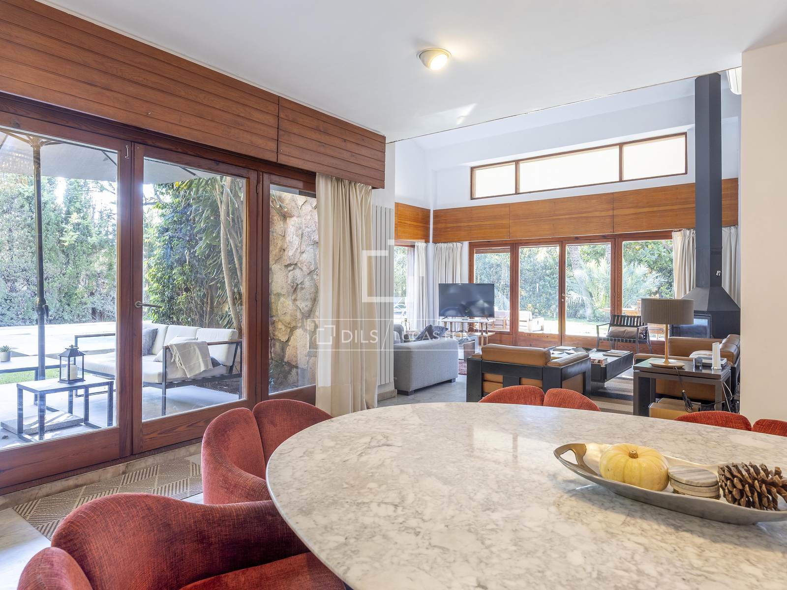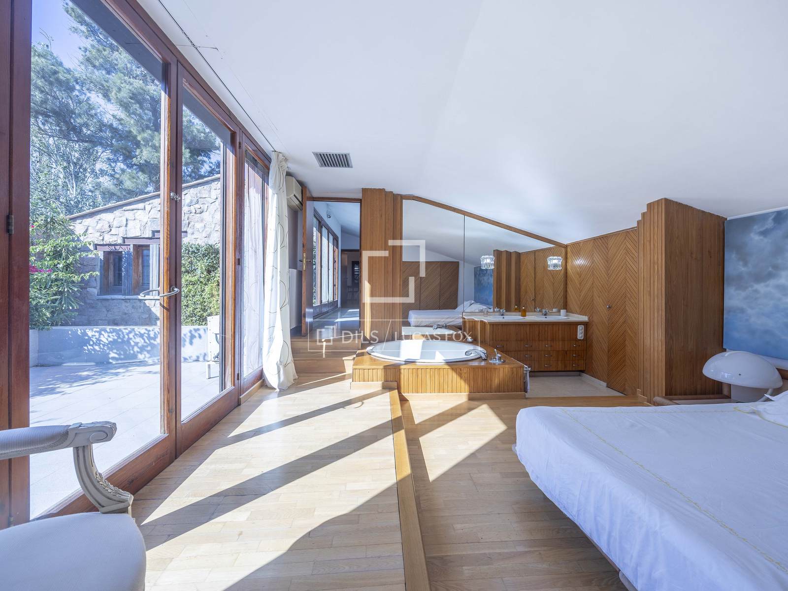 The house is distributed across 2 floors. On entering the ground floor a bright hall with large windows leads to one of the property's most outstanding rooms: a large living room divided into several distinct areas all of which are flooded with natural light thanks to the large windows. A fireplace in this area creates a warm and welcoming atmosphere and there is access to a beautiful terrace overlooking the garden. This level also offers a modern, equipped kitchen with a dining area and exterior access. Two bedrooms with en-suite bathrooms and a bathroom with a shower complete the floor. Each of the bedrooms has garden views and fitted wardrobes for maximum storage.