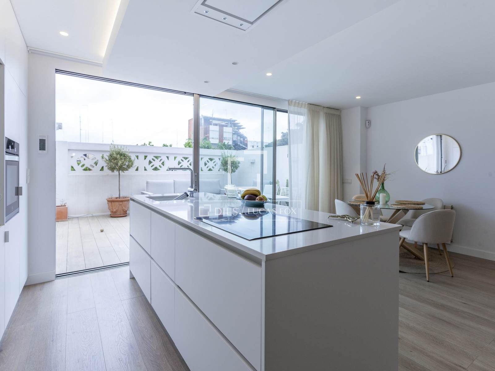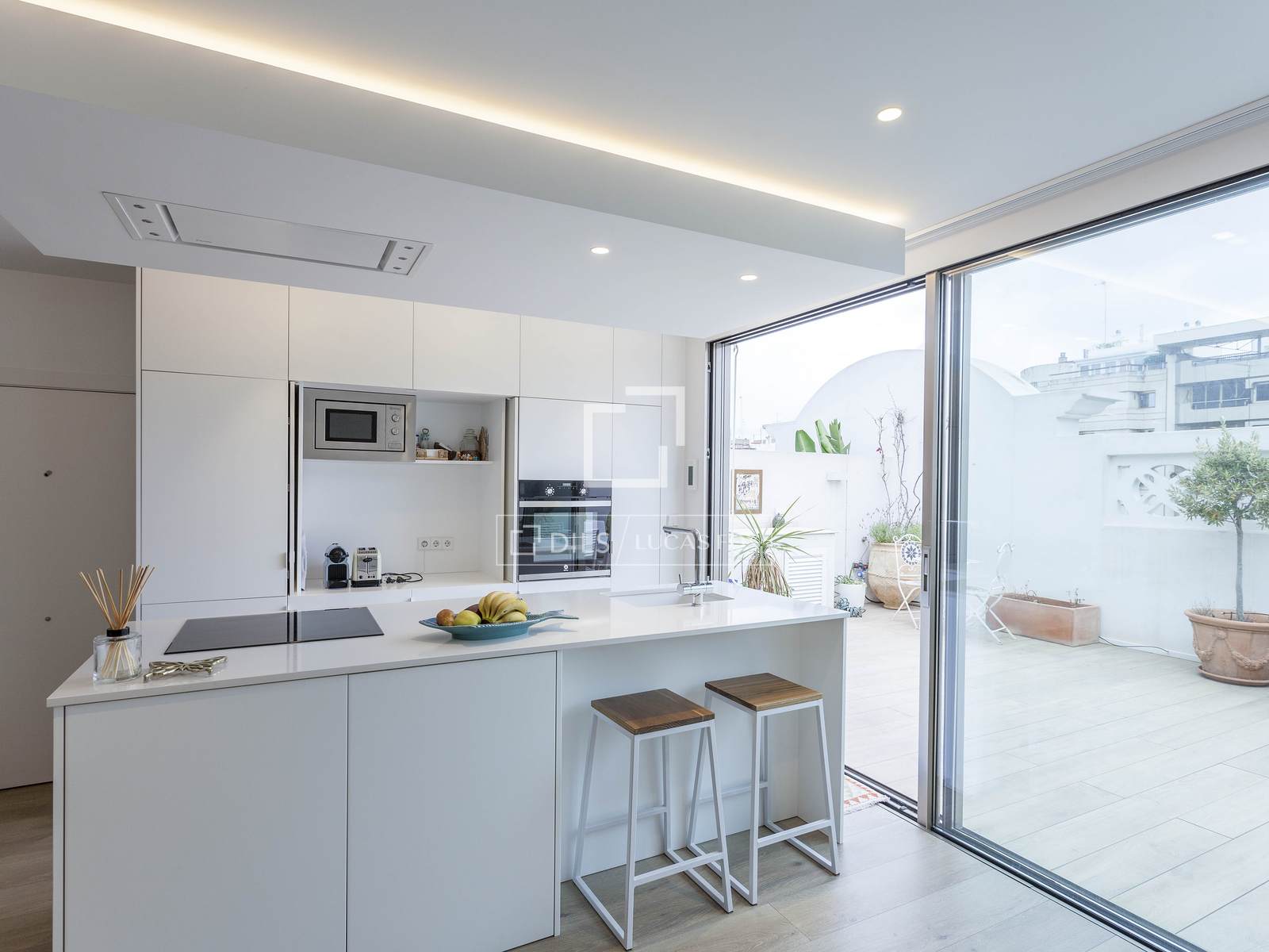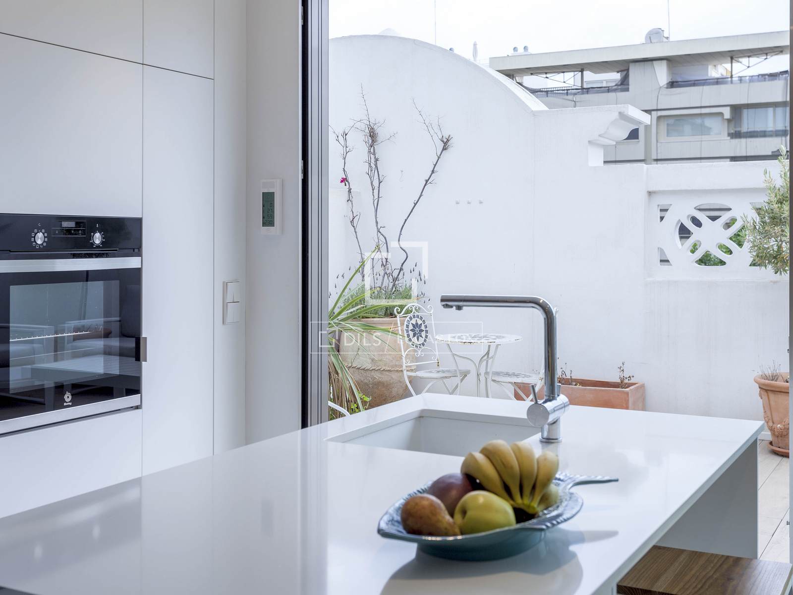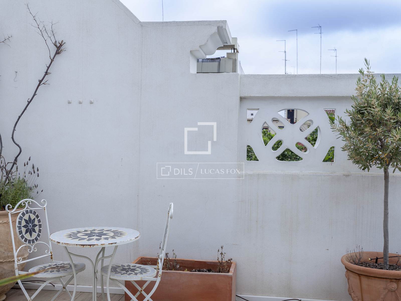 The terrace has porcelain flooring by Porcelanosa, an awning and drip irrigation for the different flower pots.