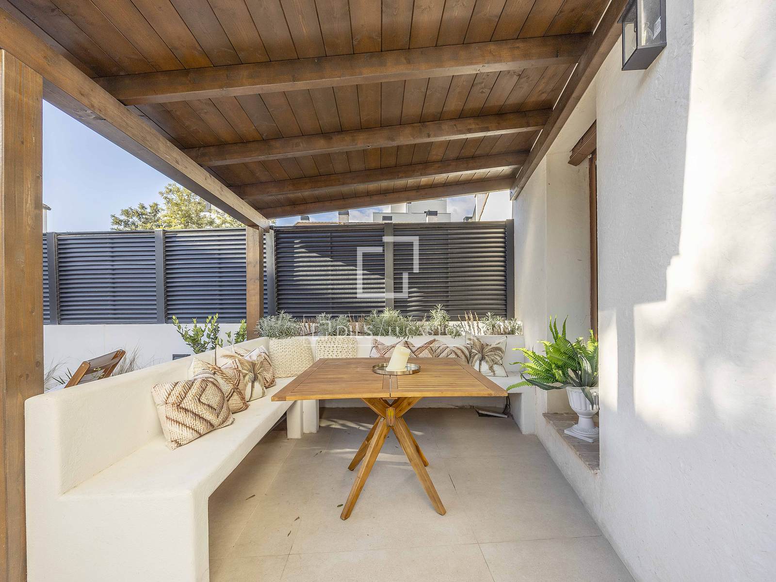 •Covered terrace with wooden pergola, perfect for outdoor dining.