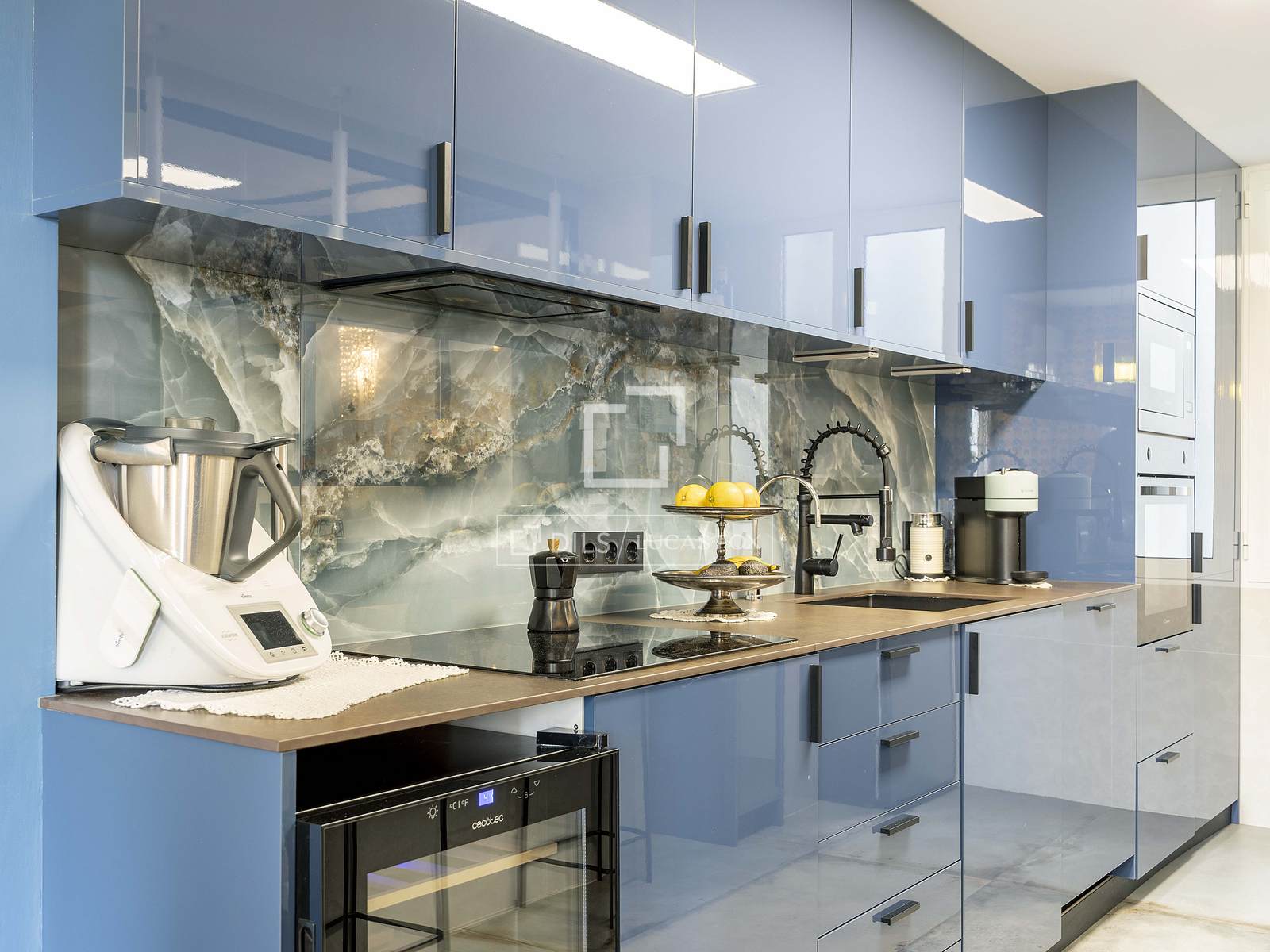 The heart of the property is a large living room designed as an open and versatile space, organized into distinct areas that blend seamlessly: a sitting area, a reading or music corner, a work area, and a dining room. Natural light floods in generously through a large window and a balcony with direct views of the old Turia riverbed, creating a constant connection with the surrounding greenery and providing a sense of spaciousness and serenity rarely found in the city.