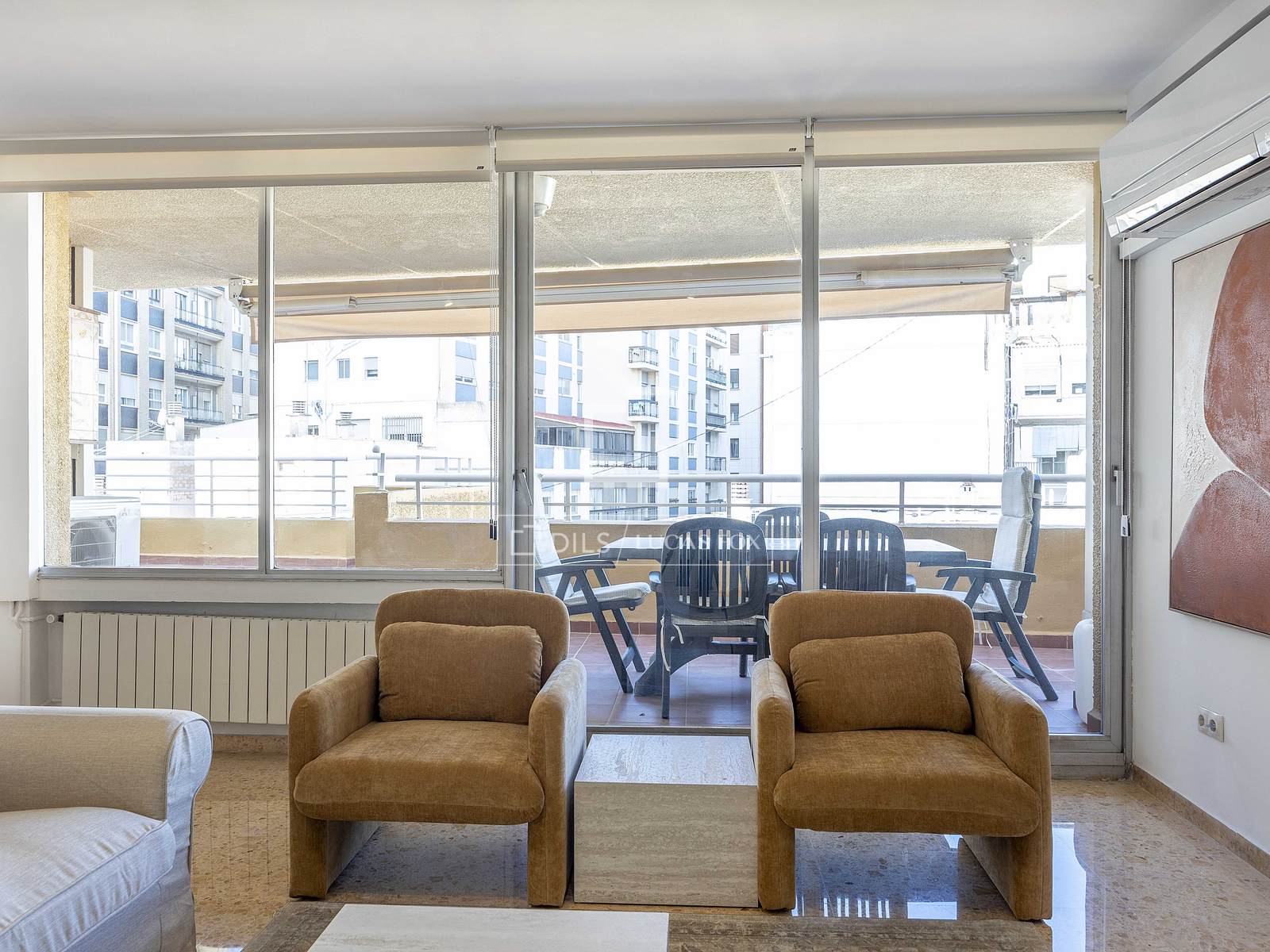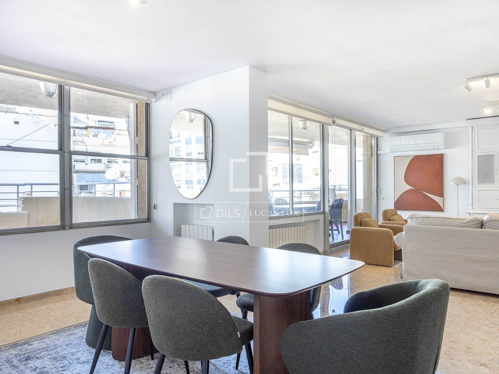 It comprises a spacious living-dining room with large windows that allow abundant natural light throughout the day. From the living room, after passing through a large sliding glass door , there is direct access to the large terrace of approximately 30 m². From the dining room, we access a bedroom, perfect for use as an study, as it also has access to the terrace. From the dining room area, we continue through the property and enter the kitchen and service area.